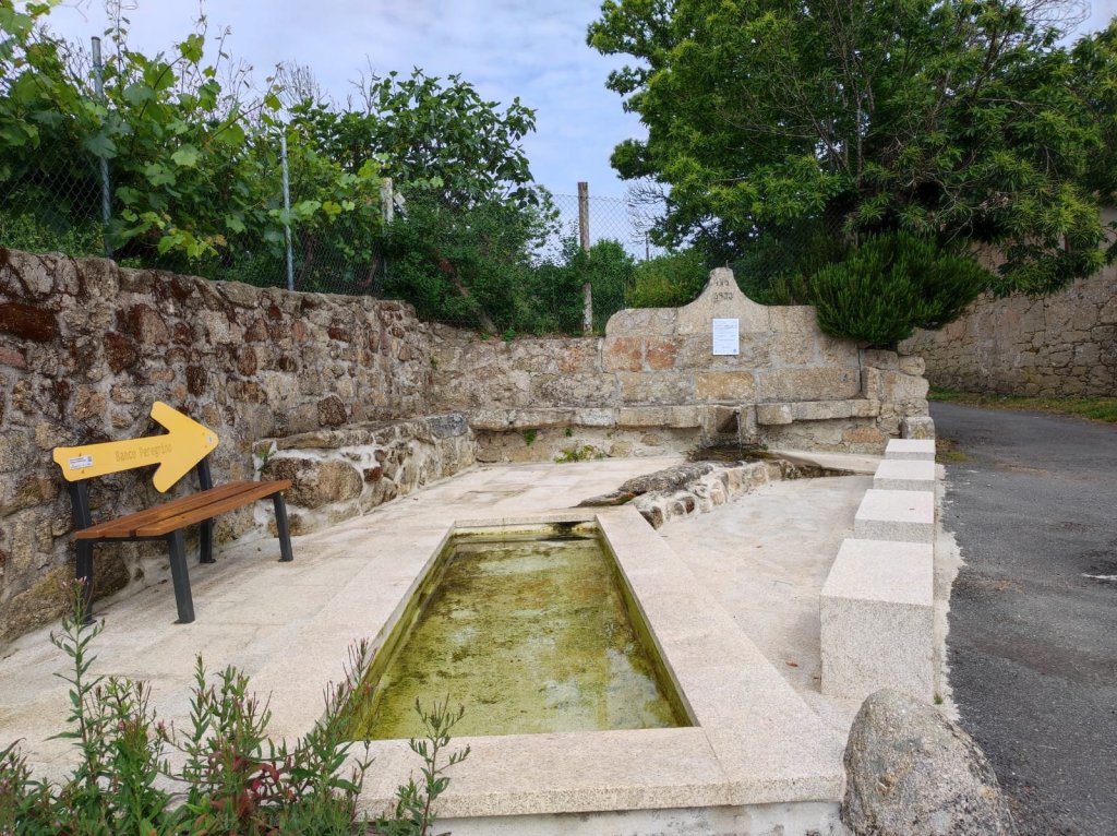 Alternamos tramos de carretera (la LU-P-3204) con caminos. Llegamos a A Vide y luego a A Lagoa, A Corga, Os Campos y Pacios. La ruta entra en O Regueiro, salvando un pequeño riachuelo por un pasadizo de piedras. En época de lluvias son frecuentes las inundaciones en parte de estos tramos, completamente llanos. Cruzamos un pequeño núcleo y llegamos a la Iglesia de San Salvador de Moreda, con un salón parroquial porticado y Crucero. Al otro lado de la carretera un espacio multiusos con escenario y un peto de ánimas. Después de Moreda (su castro se eleva a la derecha) entramos en el municipio de Pantón. La carretera continúa en suave ascenso hasta Broza.Continuamos por la carretera y en O Reguengo nos sorprende su magnífico pazo; en Castrotañe, las piedras del camino, quizás procedentes de una calzada romana; en Piñeiro, su arquitectura popular de plaza, fuente y lavadero. Aquí, km 11 de nuestro recorrido paramos en la fuente para una fruta y nos encontramos con Lee, una estadounidense que comenzó el Camino Francés en Pamplona y desde Ponferrada siguió por el de Invierno. Continuamos con ella un buen rato.