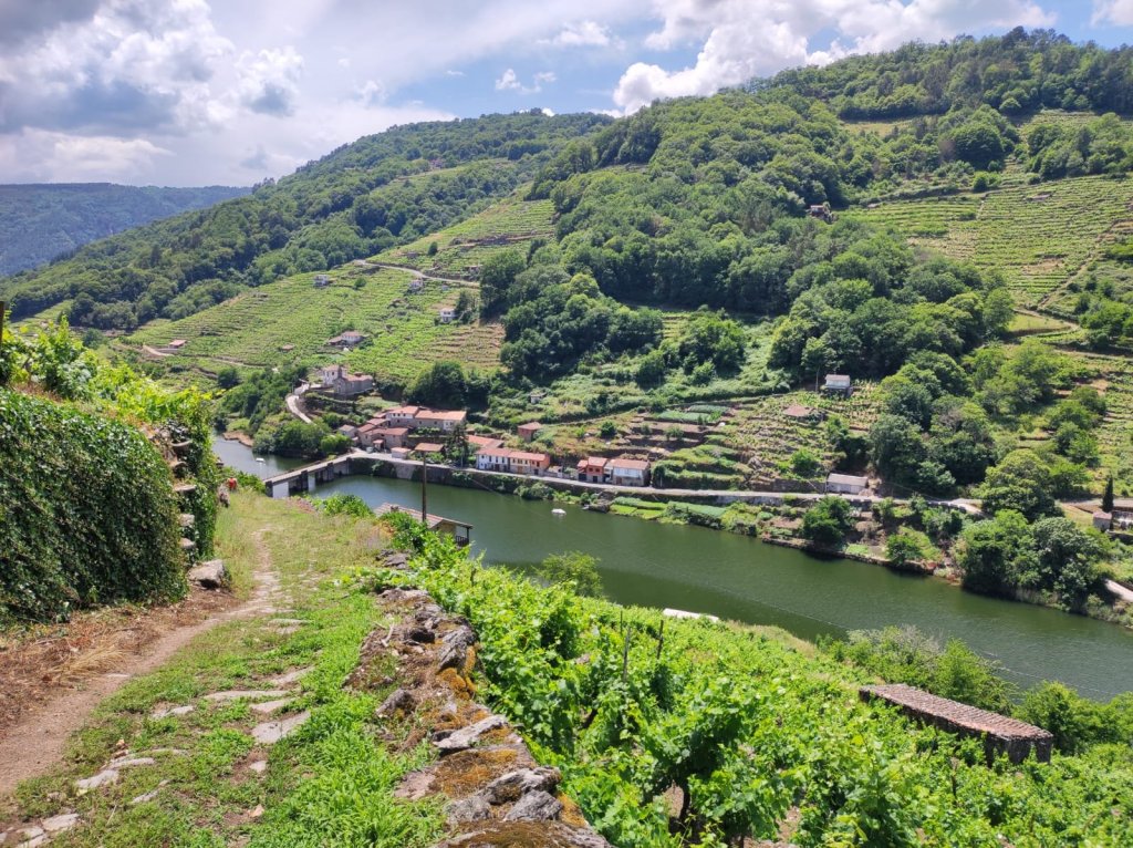 Bajamos hasta el puente de Belesar sobre el Miño por los Codos de Belesar, un trazado que va sorteando las fuertes pendientes con un trazado en zigzag. El nombre hace referencia a una antigua calzada romana de la que se conserva parte del empedrado. Acompañados por los bancales terrazas o socalcos, los viñedos cuelgan en terrazas desde la cima hasta el cauce del Miño. Entramos en Belesar, donde hubo un antiguo hospital y paramos para un bocado y continuar la marcha.