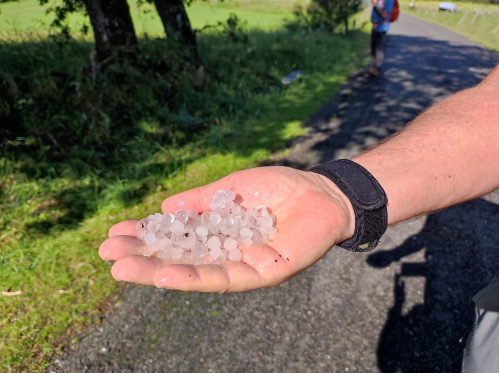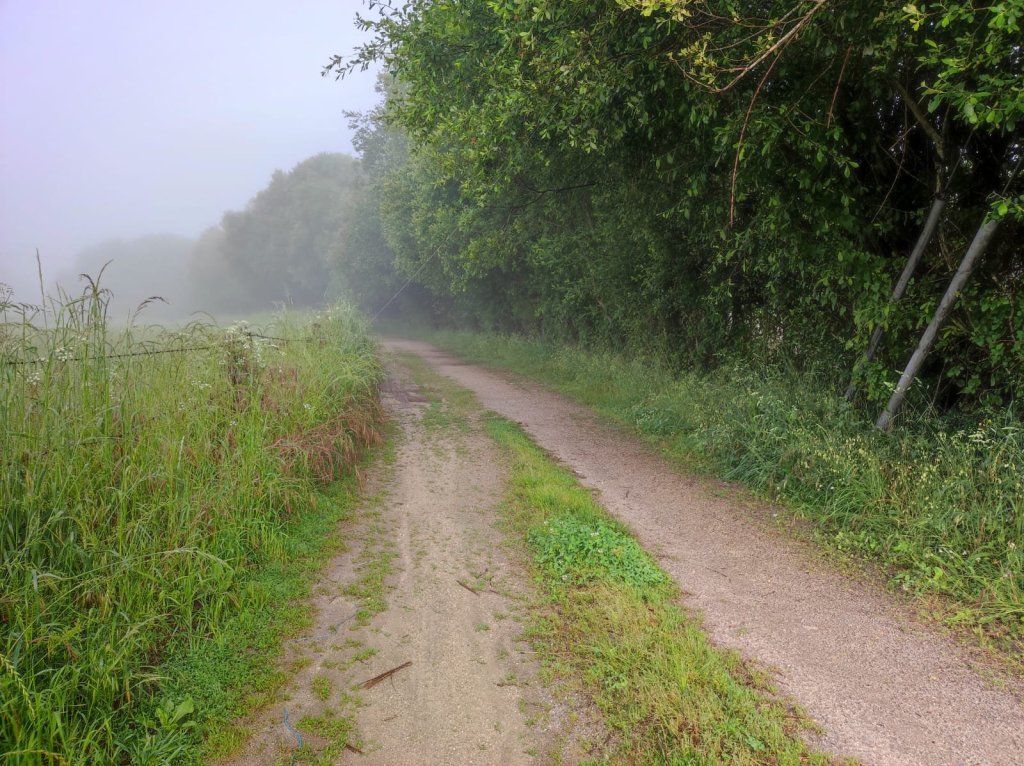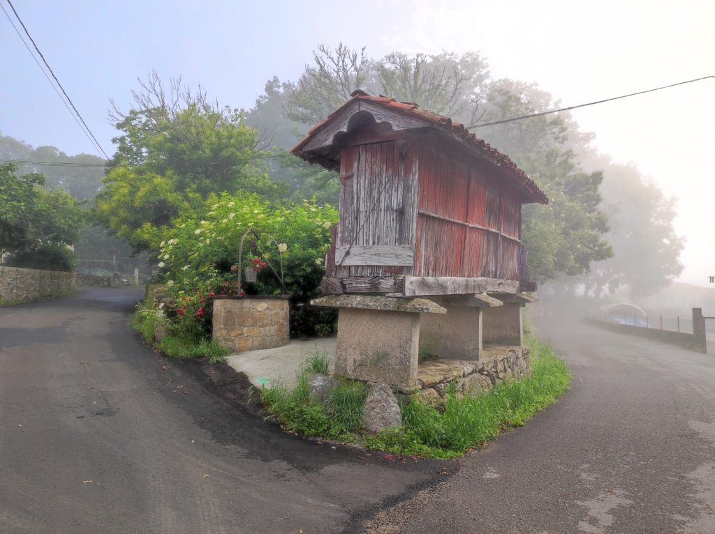 Salimos de Chantada en medio de una espesa niebla y lo hacemos desde la Praza de Santa Ana, subimos por la Rúa Uxío Novoneyra y seguimos la carretera LU-P-1809 hacia Centulle en un suave ascenso. Bellos hórreos, petos de ánimas y cruceiros nos salen al paso camino de Centulle y San Xurxo de Asma, junto a magníficos ejemplares de carballos y castaños. Cruzamos A Lucenza, luego Vilaseco. Entre Vilaseco y Penasillás vemos por los márgenes de la carretera grandes acumulaciones de granizos caídos el día anterior y que aún tienen un calibre considerable. En Penasillás paramos en el único bar para reponer agua fresca y tomar un breve descanso antes de afrontar las duras rampas de subida hacía el Monte de O Faro.