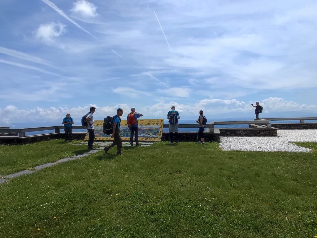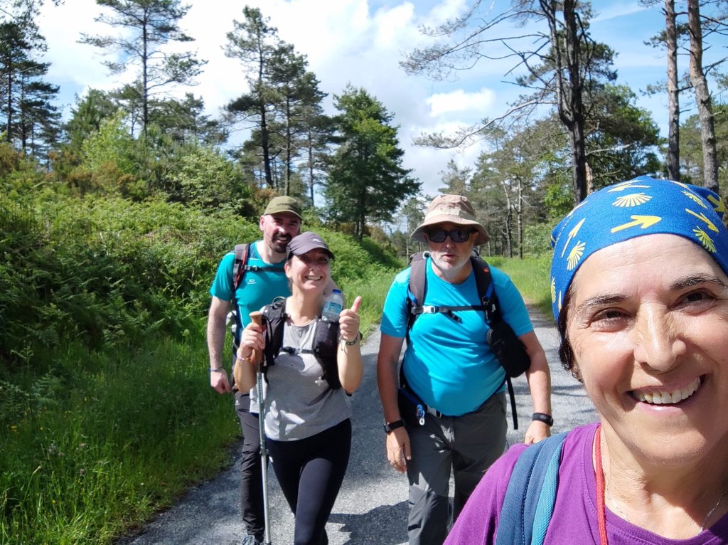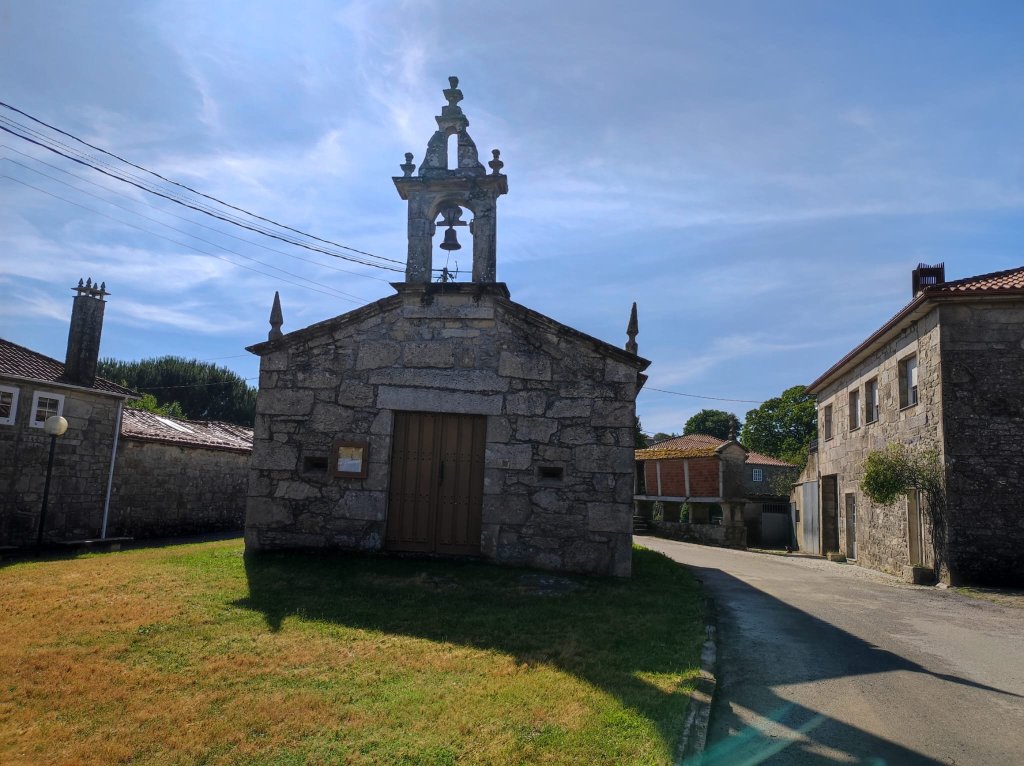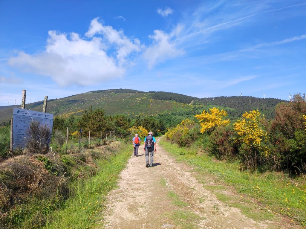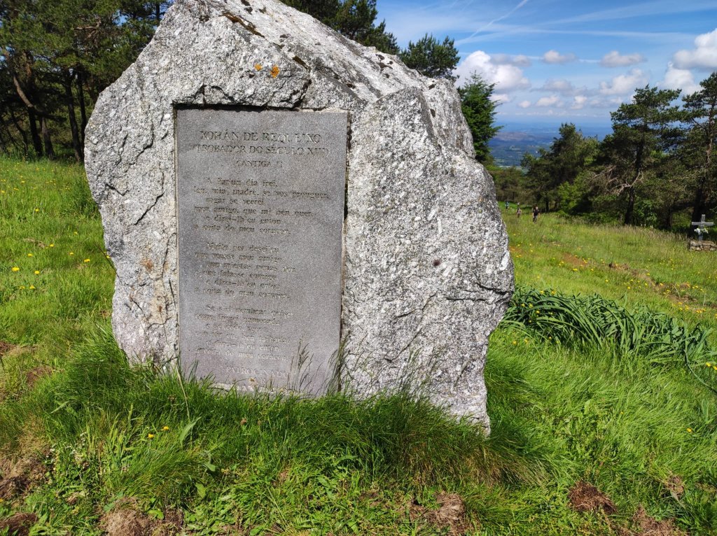 A la salida de Penasillás vemos a Carlos, uno de los integrantes de un grupo de 2 asturianos y 3 gallegos a los que habíamos visto en Monforte el día anterior. Antes de abandonar este núcleo nos encontramos con un peto de ánimas y un horno comunitario de los muchos que se ven en Galicia. Estas primeras rampas van alternado tramos en cementados con tramos de tierra. Esta pista llega hasta el memorial en honor del poeta Uxio Novoneira. Junto al memorial un área recreativa con mesas, bancos y fuente. El resto de la subida se hace por una carretera asfaltada con el ascenso un poco más suave. Por el camino nos alcanzan Carlos y una pareja de compañeros a los que estaba esperando en Penasillás. Continuamos la subida con ellos hasta llegar al inicio del Vía Crucis que da acceso a la Ermita de la Virgen de Faro. En este punto encontramos a los dos componentes del grupo que se habían adelantado y nos presentamos. Ellos son Carlos, Ana, Alberto, un segundo Carlos y David. Nos los iremos encontrando a lo largo del resto de la jornada.