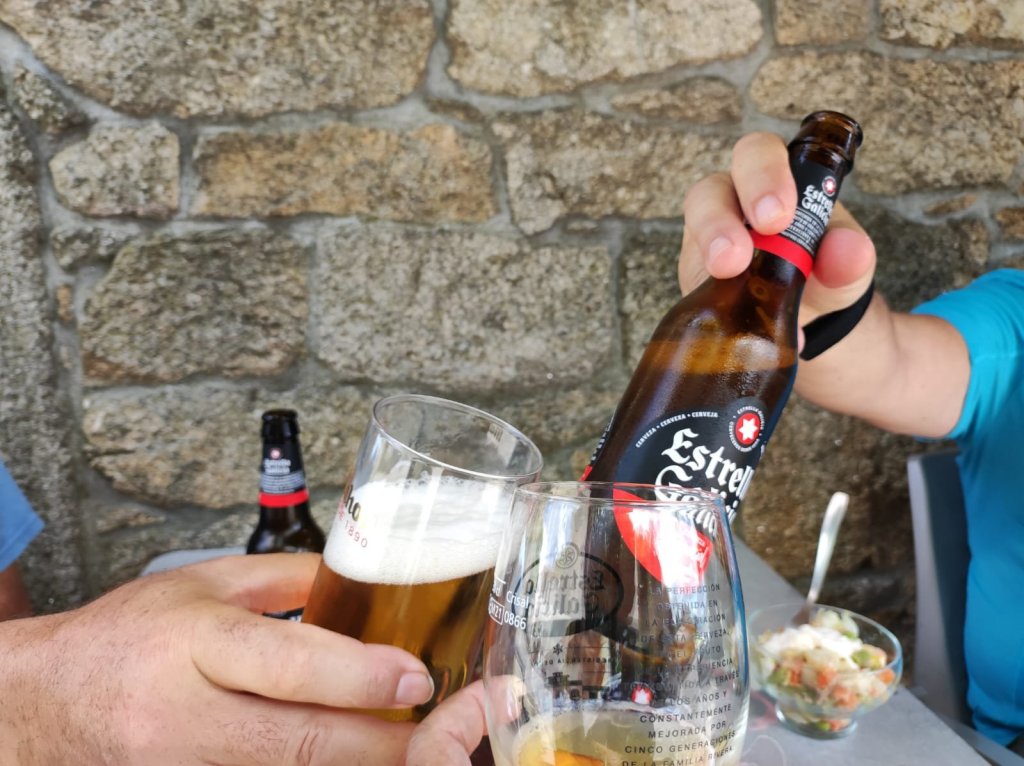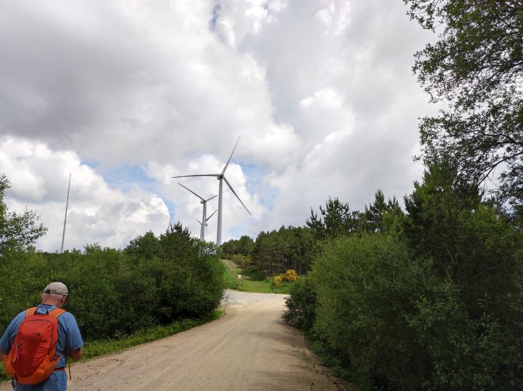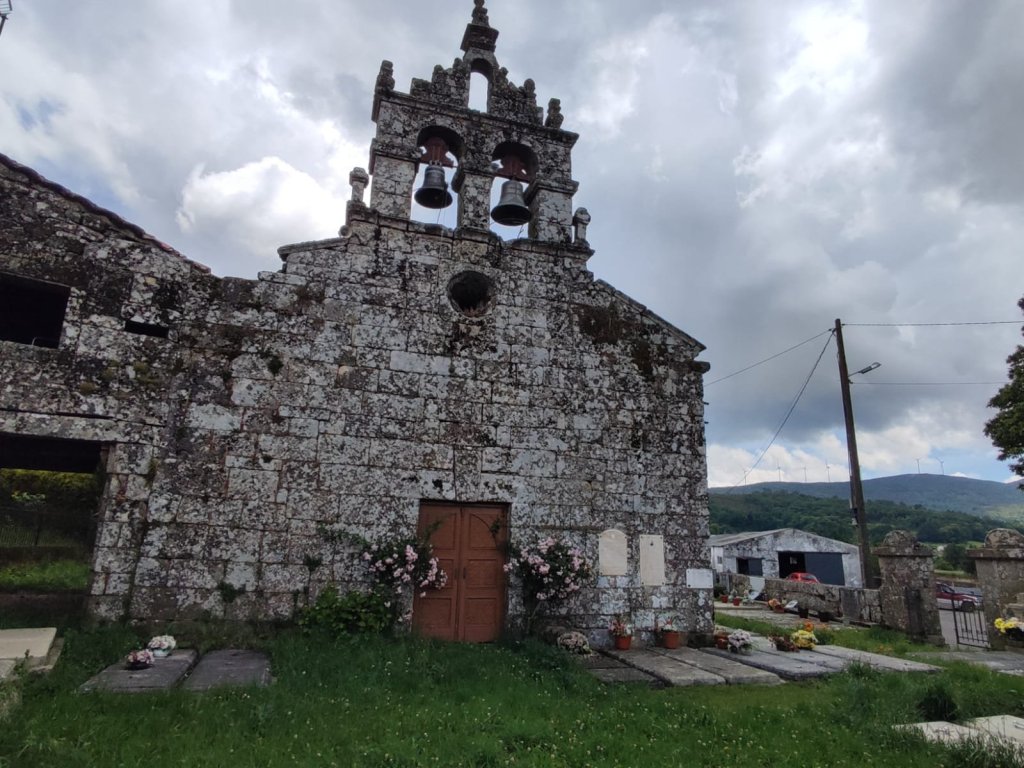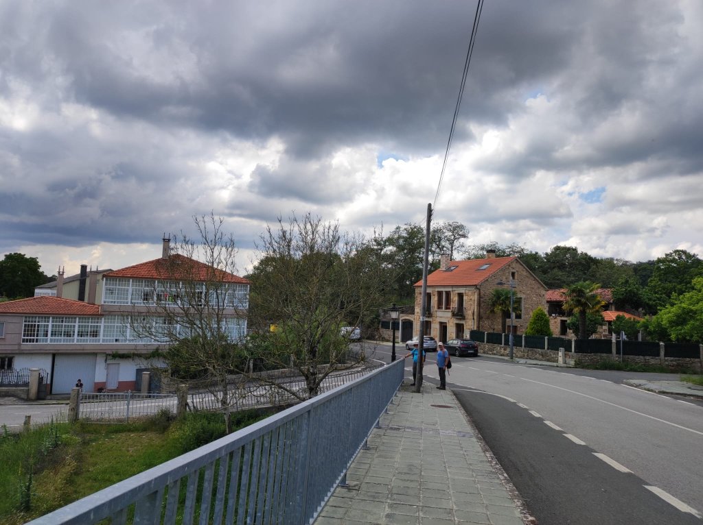 Iniciamos el descenso por la carretera de acceso al Monte El Faro en carretera de gavilla buscando la línea de aerogeneradores que tenemos en el horizonte. Por el camino encontramos la Fuete de los Meniños, con pasarelas de madera, hasta llegar al cruce sobre la carretera CRG – 22 por un paso elevado. El camino señalizado nos dirige a la derecha hasta el núcleo de Villanova. Desde Villanova vamos por carretera asfaltada hasta el pazo de la Casa Grande de Camba. Nos quedamos junto al cementerio donde hay una sencilla iglesia con espadaña de dos campanas.Luego continuamos por el valle de A Ermida pasando por algunos núcleos como Outeiro, Farfián y Lamazares hasta Río, donde hay un sencillo bar donde tomamos un ligero refrigerio y nos reencontramos con la fraternidad astur-galaica esperando para comer.