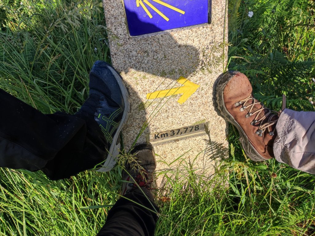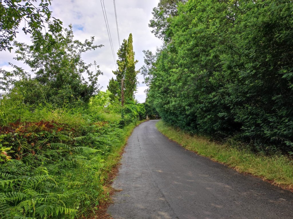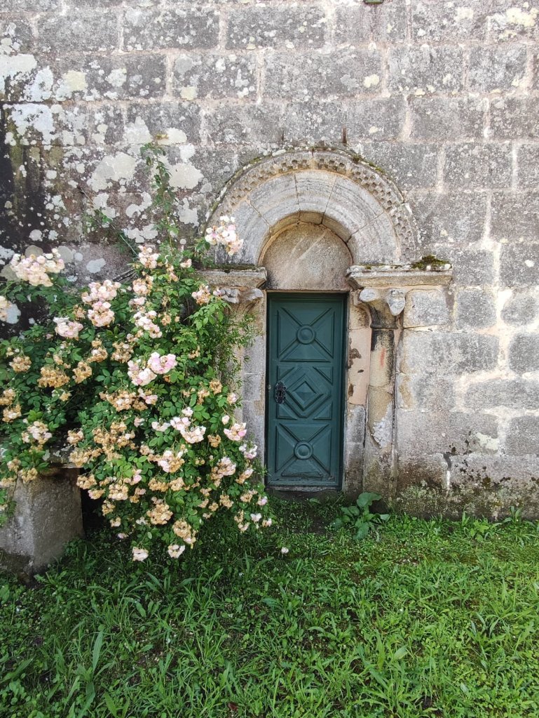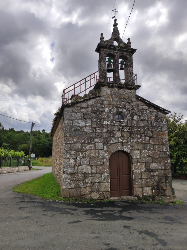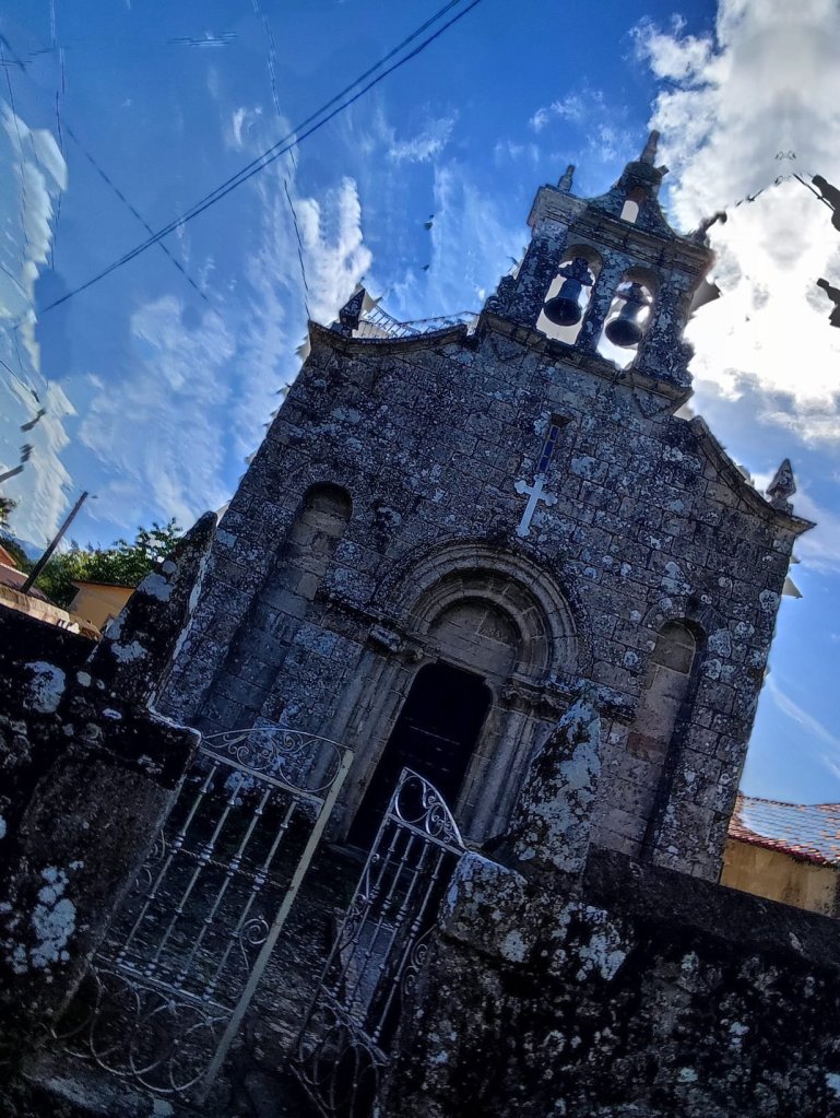 Comenzamos nuestro camino en una carretera local en las inmediaciones de Riocalvo , después de despedirnos de María y Ana, nuestras anfitrionas en el Eco Hotel Nos, y a unos 500 metros nos encontramos con los hitos del Camino en el cruce entre las parroquias de Riocalvo y Chapa. A apenas un kilometro del cruce y tras pasar el arroyo Toxa por un discreto puentecito nos incorporamos a la N-525 hasta llegar a Bandeira, centro de parroquias con abundantes servicios. Abandonamos Bandeira por la carretera nacional y giramos a la derecha en una carretera local con escaso tráfico y en pronunciado descenso. Cruzamos un arroyo y tras una breve subida alcanzamos las primeras casas de Vilariño, parroquia de Lamela. Nueva pista asfaltada hasta la parroquia de Dornelas dedicada a San Martín, la clásica iglesia del románico compostelano con ábside semicircular y portada con doble arquivolta.