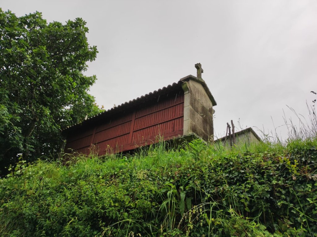 Después de Dornelas el camino nos lleva hasta San Miguel de Castro por un denso bosque de eucaliptos a un lado, pinos de repoblación al otro con algunos robles pugnando por un poco de luz solar. Sorprende la cantidad de hortensias en este camino. En San Miguel de Castro hay una Iglesia dedicada a Santiago y la Fonte dos Carvalliños una hermosa fuente con abrevadero. El camino prosigue en franco descenso pasando por los lugares de O Pontiño, A Seixo, A Carballeira y A Silva, hasta un cruce con indicaciones para subir a un Mirador en el Castro de San Miguel De Castro. Subimos al mirador y la vista sobre el valle del Río Ulla es realmente espectacular. Comienza a chispear y ante la eventualidad de que la cosa vaya a mayores iniciamos el descenso.