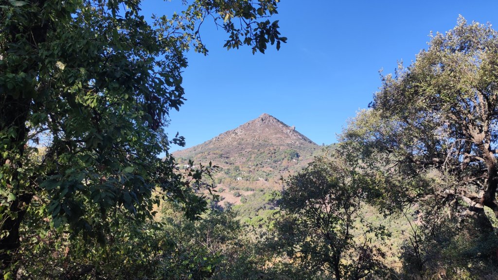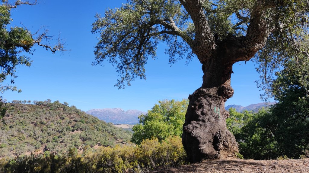 Como nuestra intención es unir dos rutas, dejamos el coche cerca del Centro de Salud, en la parte baja del pueblo en una amplia explanada en la que los sábados se suele montar un mercadillo. Cuidado con la señalización. Comenzamos la caminata en el sentido descendente de la Calle Jacobo Real en dirección al Parque Antonio Godino junto a la carretera A-369, y a escasos metros de dicho parque giramos a la izquierda para continuar por el Camino de La Lobería. Iniciamos un descenso por una pista forestal con bonitas panorámicas del Monte Hacho y rodeados de una fantástica masa arbórea de alcornoques, quejigos y encinas, algunos de ellos de gran porte, y con el suelo cubierto de abundante hojarasca propia de la época otoñal que ahora comienza.
