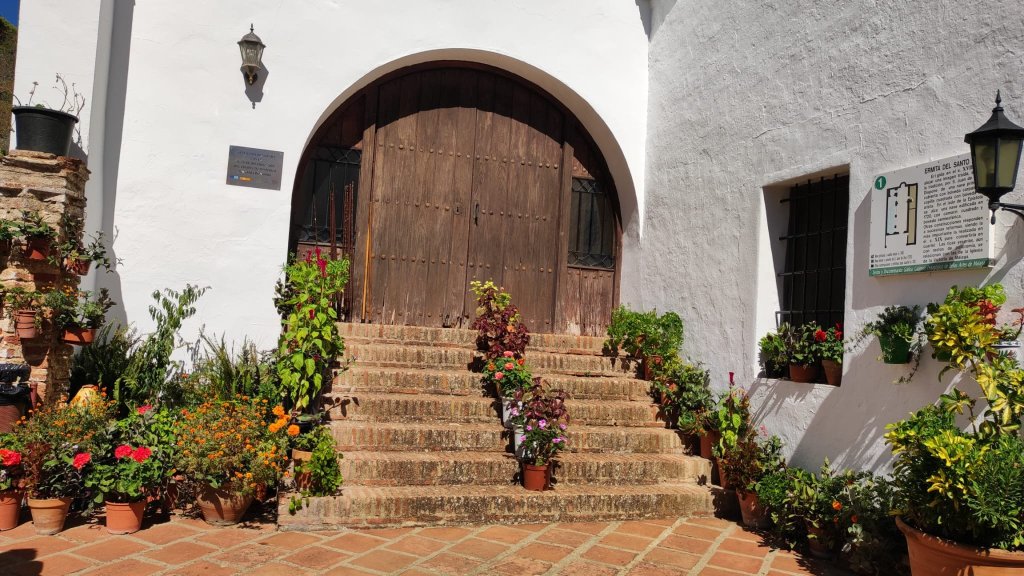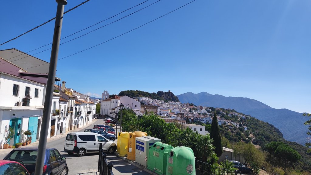 Llegamos a una cancela, que encontramos abierta, y a través de un magnífico pinar, y de algunos arbustos de Espino albar, con unas buenas vistas sobre Gaucín hasta que alcanzamos otro cruce de caminos: el situado frente a nosotros, continuaba por la ruta XIII, a través del Camino de los Hilos, y el de la derecha, continuaba por el Camino de la Mamola; ambos conducían hasta el pueblo. Nosotros optamos por el de la derecha y tras ascender un duro repecho, giramos a la izquierda para tomar el Camino del Montoro y llegar hasta la Barriada de la Morena junto al inicio del sendero señalizado para subir a la Sierra del Hacho.