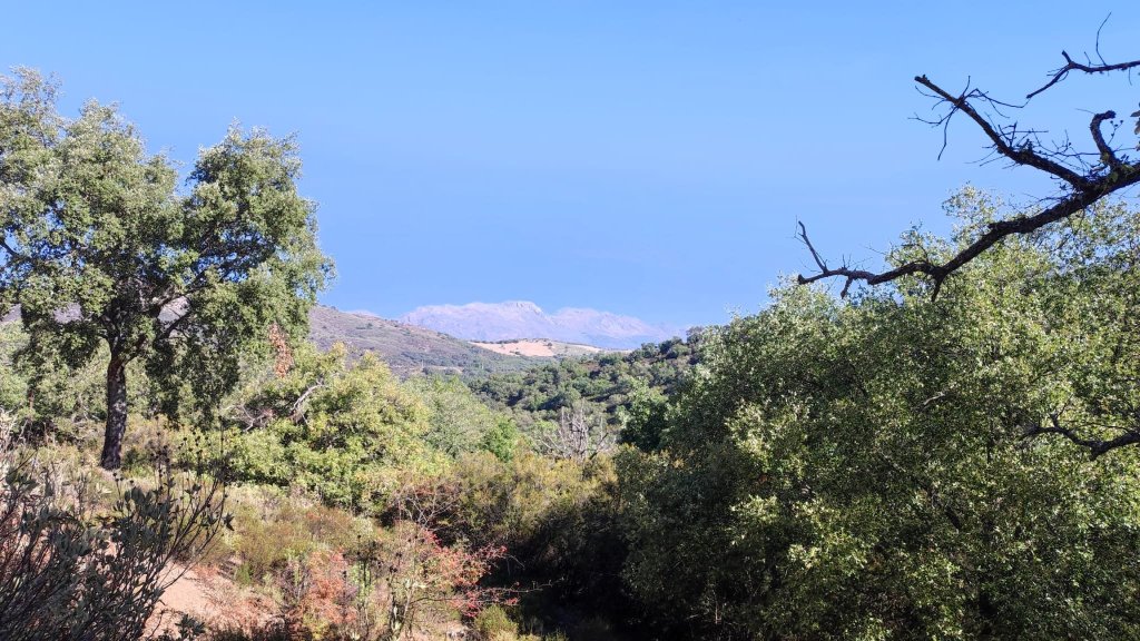Continuamos por una estrecha vereda, con algunos tramos pedregosos hasta acceder a una pista forestal amplia y giramos a la izquierda siguiendo las indicaciones de la ruta catalogada, por el Ayuntamiento de Gaucín, con el número V. Cruzamos el Arroyo de Carboneras, sin agua alguna ya en la Garganta de las Palas y punto más bajo de nuestro recorrido. Desde este punto iniciamos el ascenso con unas bonitas vistas del macizo de Líbar en una subida no demasiado exigente.