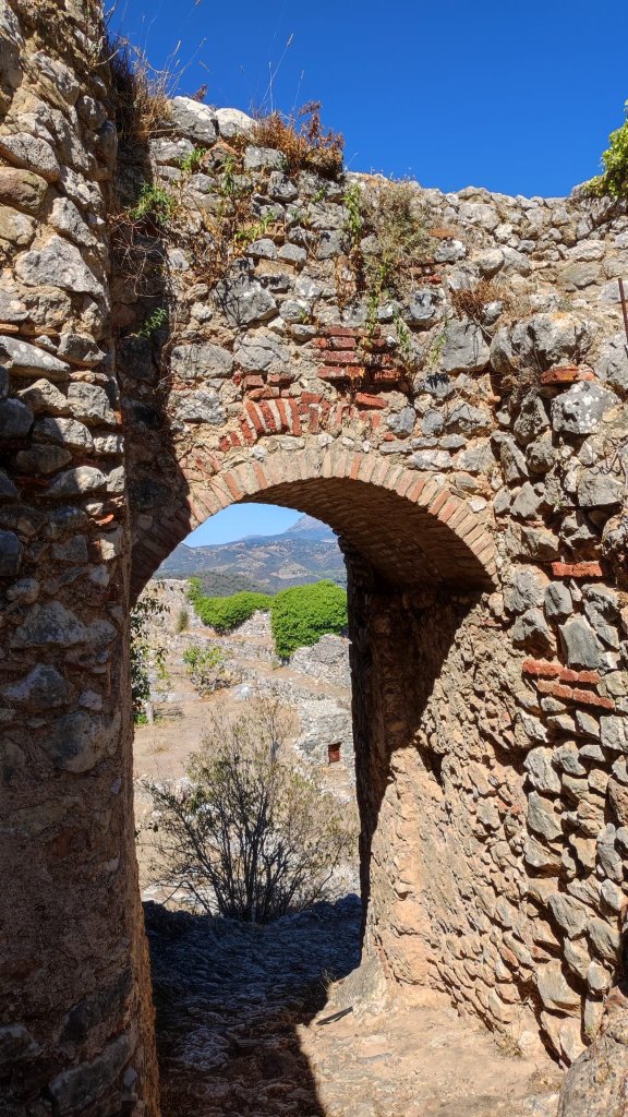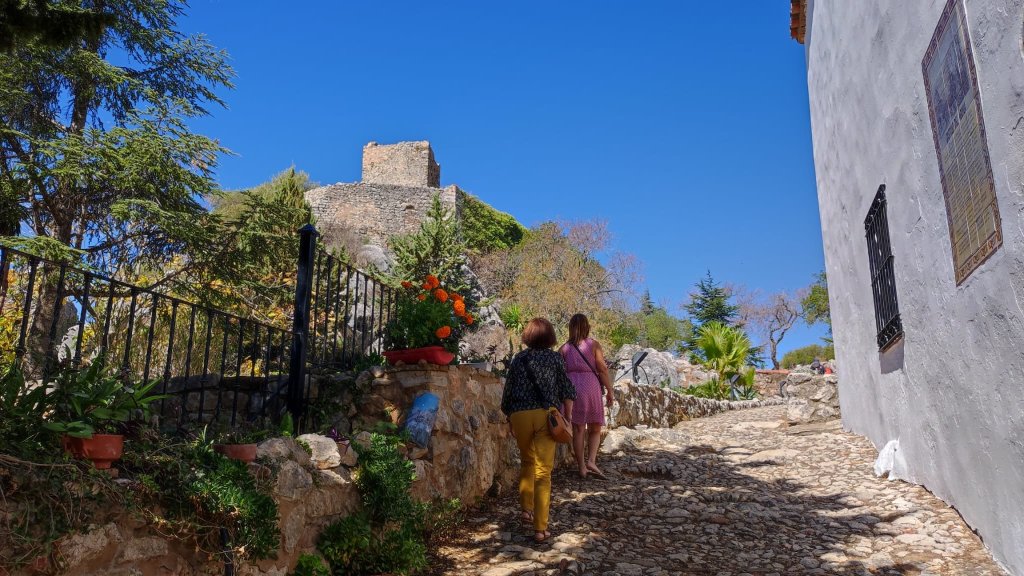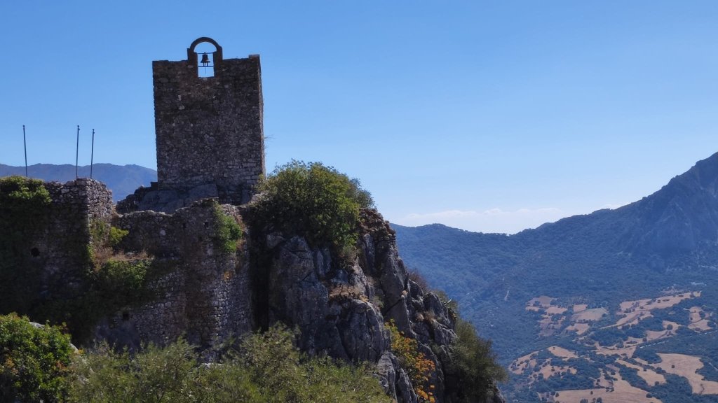 Llegamos a la carretera A-369 que conduce hasta Ronda, la cruzamos y entramos de nuevo en Gaucín por el Paseo de Ana Toval con unas espectaculares imágenes del macizo de Líbar y en sus faldas el pueblo de Cortes de la Frontera; Ahora seguimos las indicaciones para llegar al Castillo del Águila o de Gaucín. Tras callejear unos veinte minutos llegamos a la Calle La Laguna en la que comienza una cuesta escalonada que nos lleva directamente al recinto amurallado del Castillo del Águila. Recibe este nombre porque es frecuente la presencia de aves rapaces. Se trata de un castillo levantado en la época andalusí y reconstruido en varias ocasiones posteriormente. Se conservan la muralla, la torre del Homenaje, los aljibes y una mina de escape. Guzmán el Bueno murió en los alrededores del castillo en 1309, cuando intentaba conquistarlo a los árabes. En él se encuentra también la Ermita del Santo Niño. En la zona pudimos divisar un gran número de rapaces, entre ellas algún águila, haciendo honor al nombre. El descenso lo hacemos pasando por el bonito Mirador del Castillo y por la Calle de las Parras llegamos de nuevo hasta el Centro de Salud en el que iniciamos la ruta.