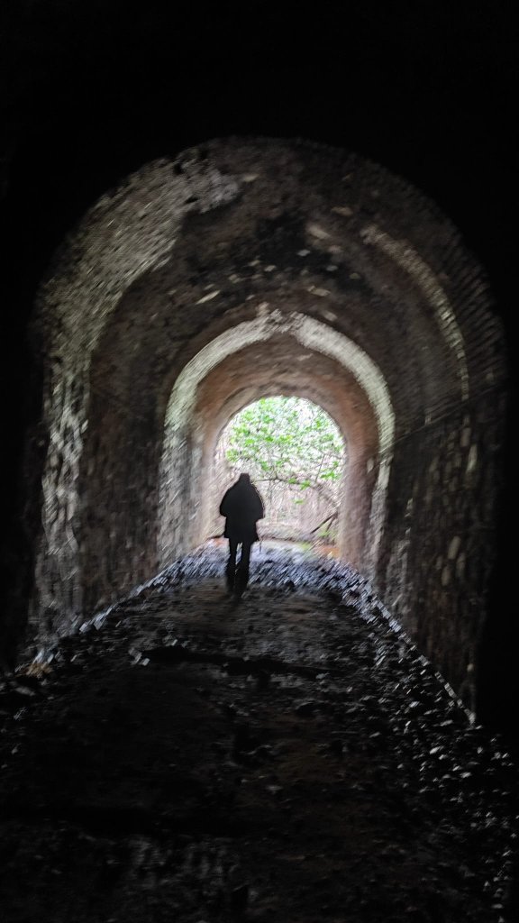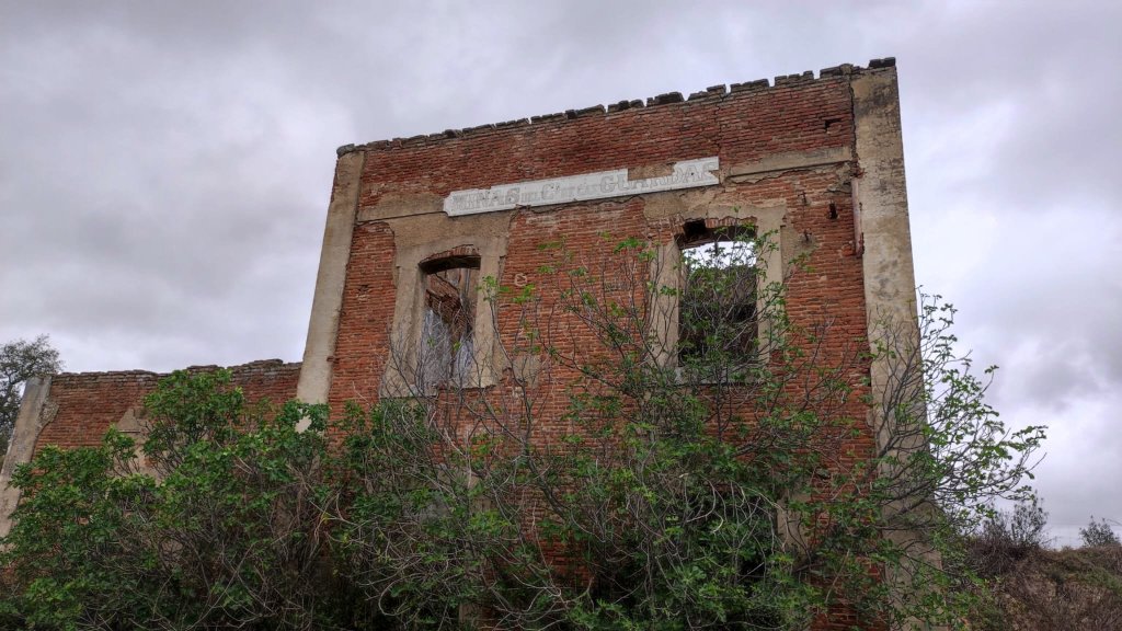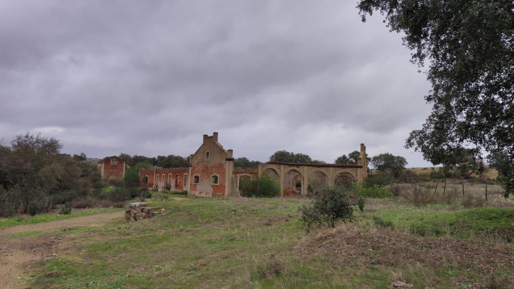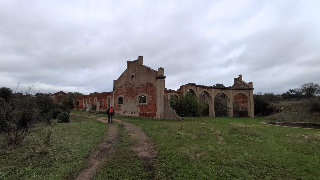 Tras una suave subida alcanzamos a ver a nuestra derecha el embalse nuevo completamente seco y cruzado por un débil arroyo. Un poco más adelante llegamos a la cola del Embalse del Pantano Viejo que tiene una buena lámina de agua. En poco menos de 1 km encontramos los restos de la antigua estación de ferrocarril de la Mina Admirable. Investigamos por entre los edificios y nos acercamos a un túnel en bastante buen estado a escasos 500 m. Regresamos a los edificios en ruinas para retomar un camino que lleva hasta el poblado Minas del Castillo de las Guardas que está habitado. Antes de llegar al poblado (lo visitaremos en otra ocasión) hay una cancela que da paso a un camino entre las alambradas que separan dos fincas ganaderas. Es el tramo menos vistoso del recorrido con la visión del radar meteorológico que nos muestra en la distancia el lugar en el que encontraremos el camino de vuelta. Pasamos por el cerro de Cañada Alta (520 m) hasta llegar al Cortijo de Chamorro en el que tomaremos el Camino del Cerro de las Ánimas de vuelta a la localidad del Castillo de las Guardas.