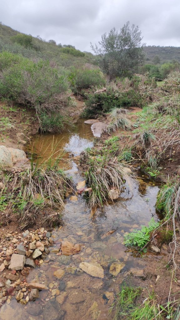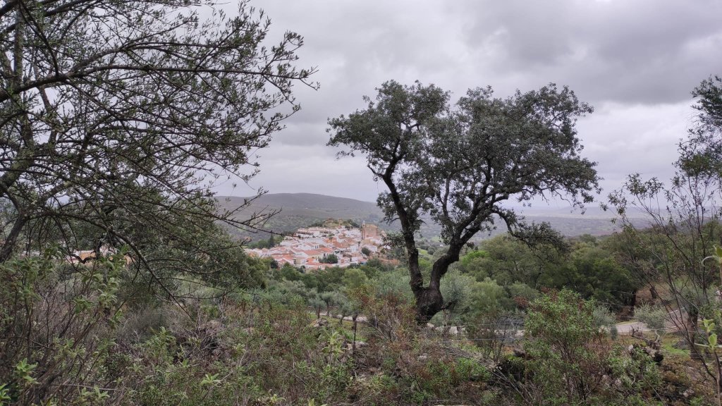 Comenzamos a caminar desde la Plaza de España del Castillo de las Guardas en dirección a la Fuente-Abrevadero junto a la carretera SE-539 y siguiendo las balizas llegamos al camino del Cerro de las Ánimas. Es una subida bastante llevadera entre muros de piedra y en la que atravesaremos las primeras portillas. Hacia el segundo km de nuestro recorrido la subida se suaviza y alcanzamos una bifurcación en la que podemos ver por muestra derecha el camino que nos traerá de vuelta. En este paraje, Cañada Alta, ya nos encontramos con una cancela practicable por la que entramos a una finca ganadera, Caña Alta. Siguiendo la vereda iniciamos un suave descenso en el que atravesaremos algunos arroyos con un caudal mínimo, por lo que los sorteamos sin problemas. Hacia el km 4,5 del recorrido llegamos a una intersección con un camino que lleva hacia la aldea de El Pedrosillo. Continuamos siguiendo las balizas que señalan hacia las Minas del Castillo de las Guardas adentrándonos en la Sierra del Pantano.