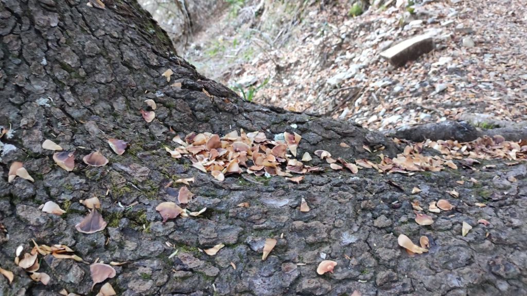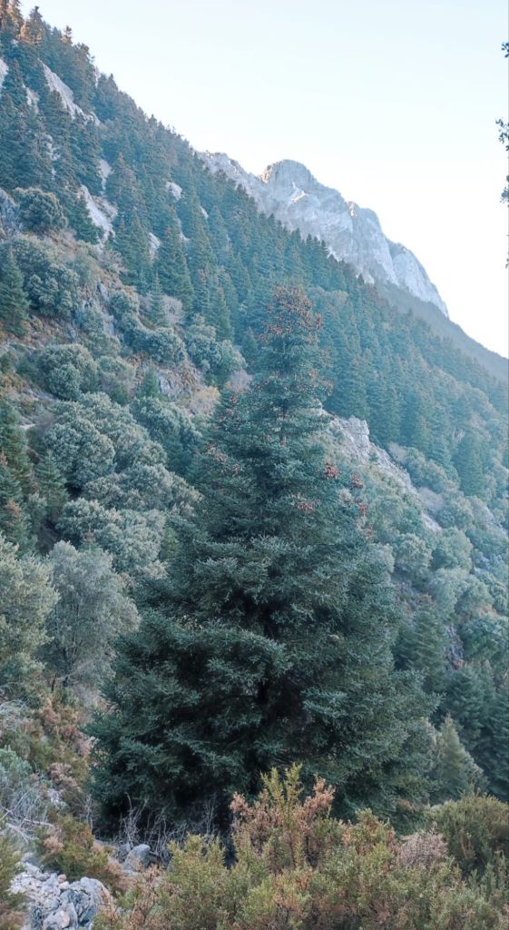 Seguimos el sendero para entrar de lleno en el bellísimo pinsapar. Pasaremos algunos tramos con tajos a la derecha sin excesivo peligro y en un momento estaremos bajo un denso bosque de pinsapos que se prolonga durante un par de kilómetros. Durante la caminata, ya en franco descenso, cruzaremos por varias torrenteras y pedreras donde podremos observar la fuerza y la erosión que provoca el agua entre desprendimiento de rocas y árboles caídos de forma caótica. Algo más adelante encontraremos un panel informativo sobre el carboneo y otras formas de subsistencia tradicional y entraremos en una zona que muestra la evolución del pinsapar hacia la madurez y un panel informativo nos explica que la madera en descomposición permite la regeneración del bosque.