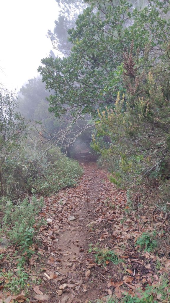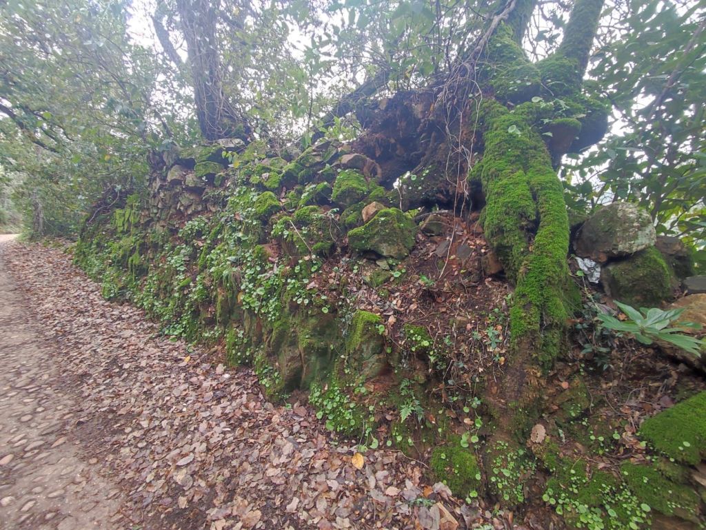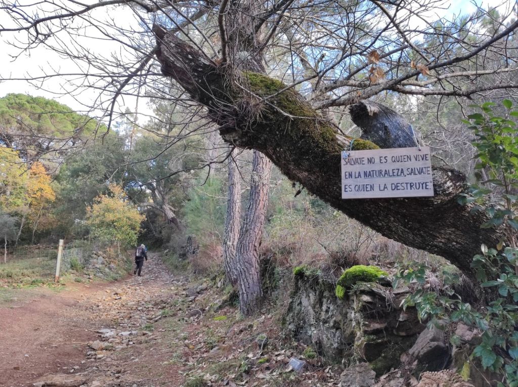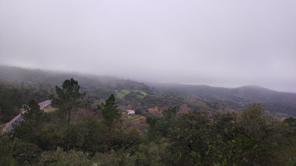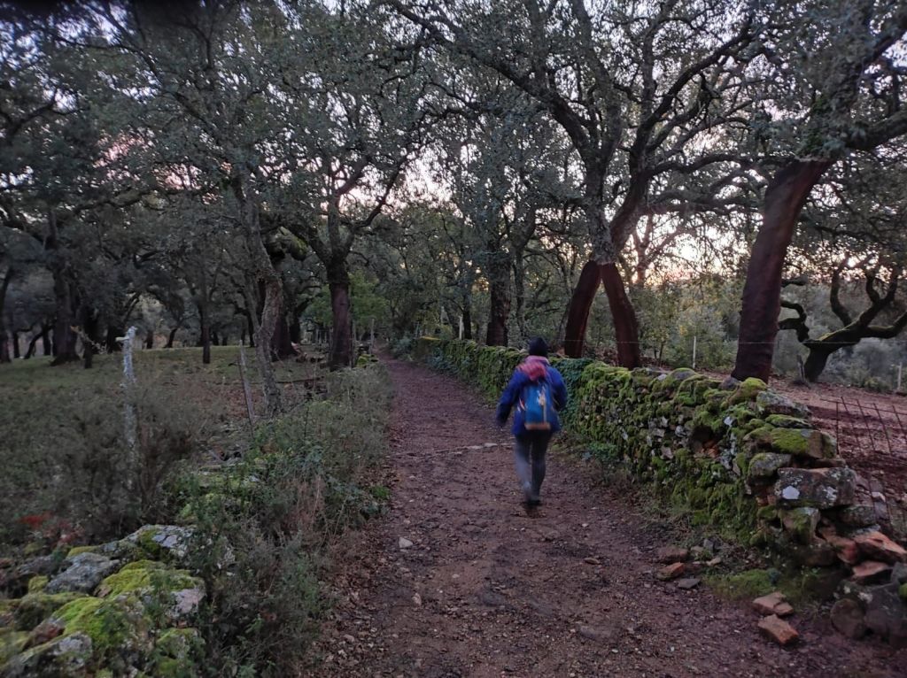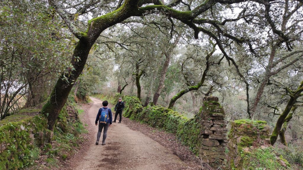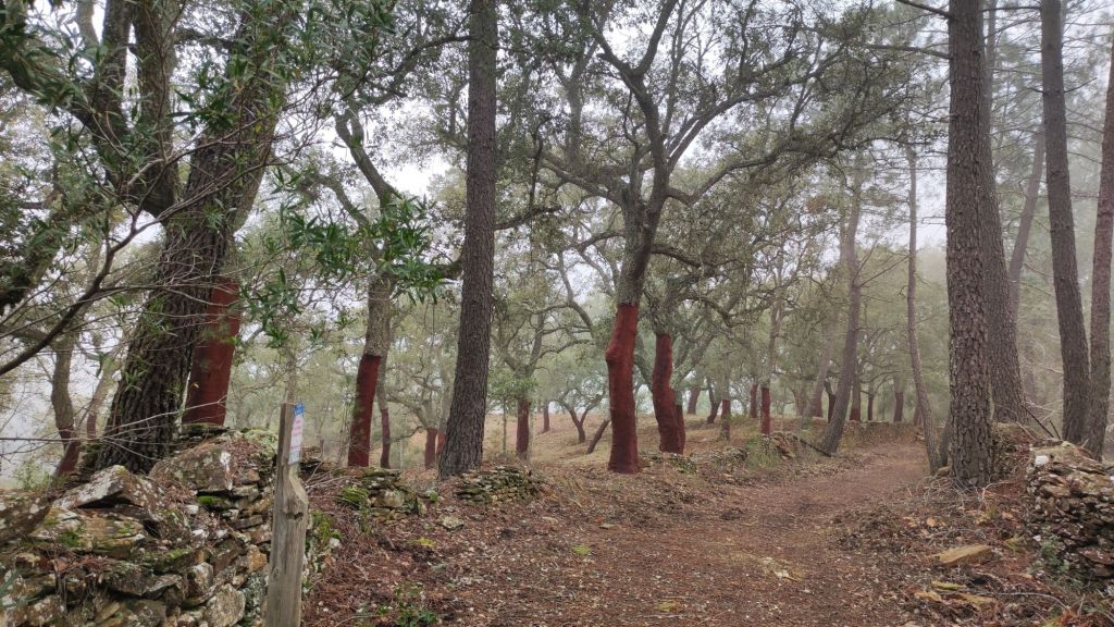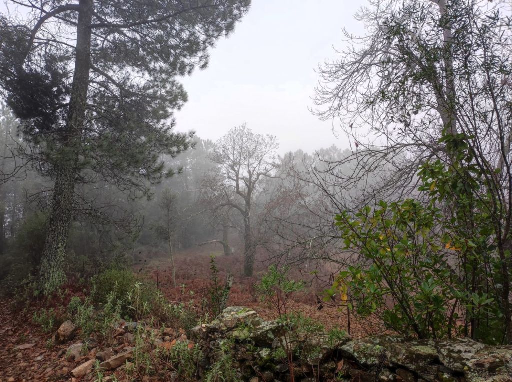 Usamos un paso bajo la carretera HU-8104 para enlazar con la ruta de los hornos de cal en direccion a Aguafría que discurre por el barranco del Negrito. Es un precioso paseo entre alcornoques, castaños centenarios y encinas. Al llegar a una bifurcación que desciende hacia Aguafria tomamos un camino a la derecha en ligera subida, pasamos por la casa de los Prazuelos, en ruinas, y comenzamos una fuerte subida por la Sierra de los Palos Altos entre pinares de repoblación y fuertes repechos. Alcanzamos un collado en el que se suaviza la pendiente y nos dirigimos hacia Jabugo. En este punto la niebla hace acto de presencia y hay que volver a ponerse algo de ropa de abrigo. La humedad es tal, que al pasar bajo los árboles parece que llueva.