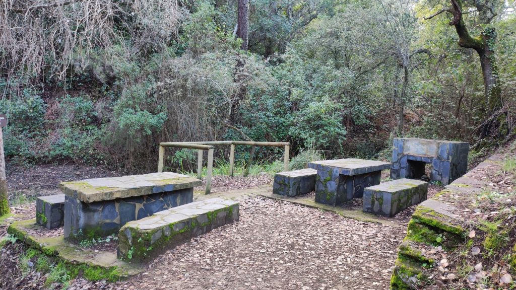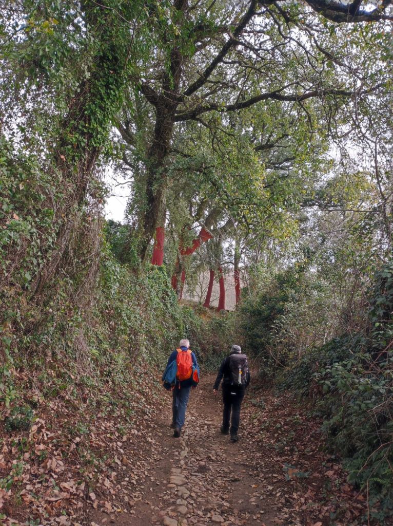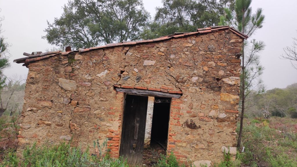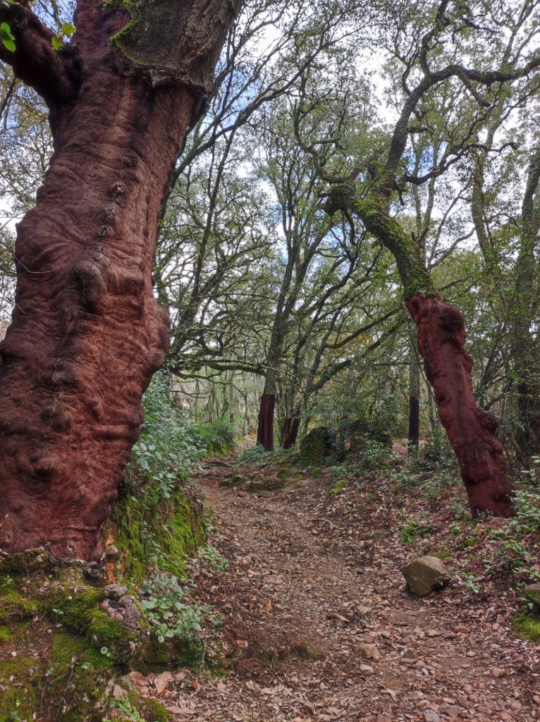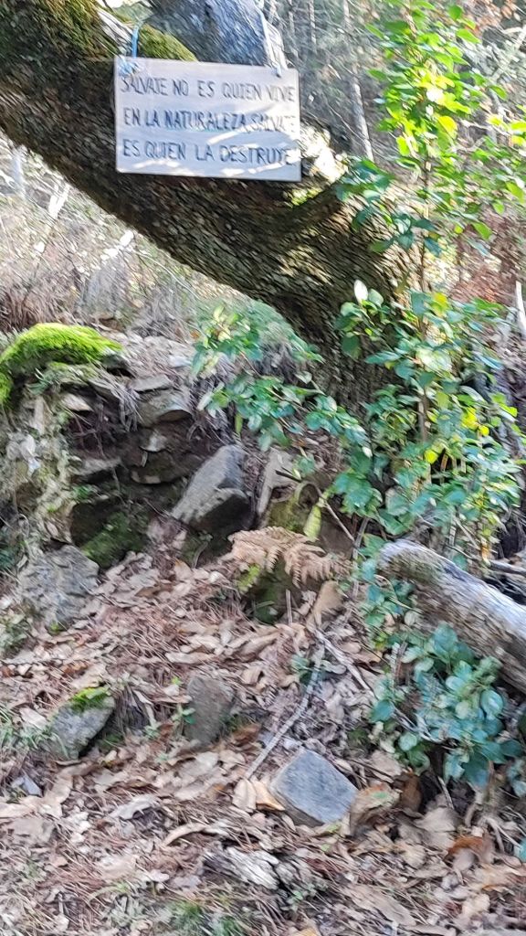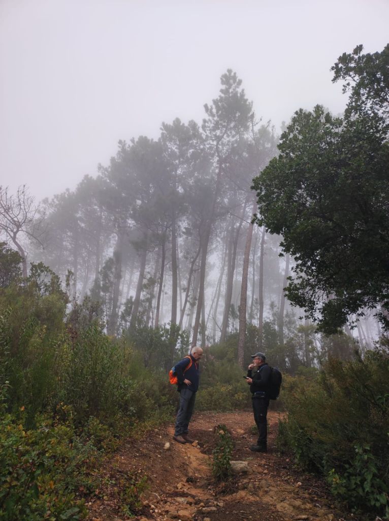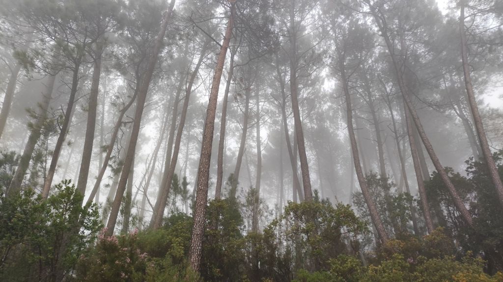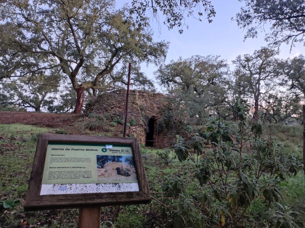 Usamos un paso bajo la carretera HU-8104 para enlazar con la ruta de los hornos de cal en direccion a Aguafría que discurre por el barranco del Negrito. Es un precioso paseo entre alcornoques, castaños centenarios y encinas. Al llegar a una bifurcación que desciende hacia Aguafria tomamos un camino a la derecha en ligera subida, pasamos por la casa de los Prazuelos, en ruinas, y comenzamos una fuerte subida por la Sierra de los Palos Altos entre pinares de repoblación y fuertes repechos. Alcanzamos un collado en el que se suaviza la pendiente y nos dirigimos hacia Jabugo. En este punto la niebla hace acto de presencia y hay que volver a ponerse algo de ropa de abrigo. La humedad es tal, que al pasar bajo los árboles parece que llueva.