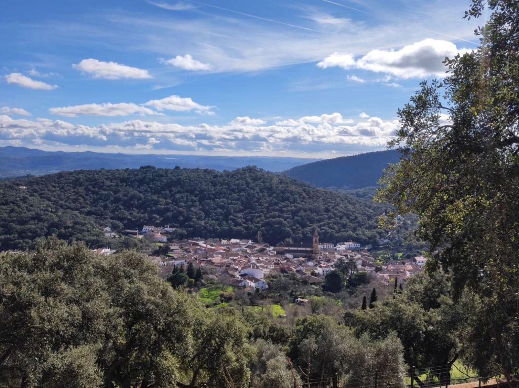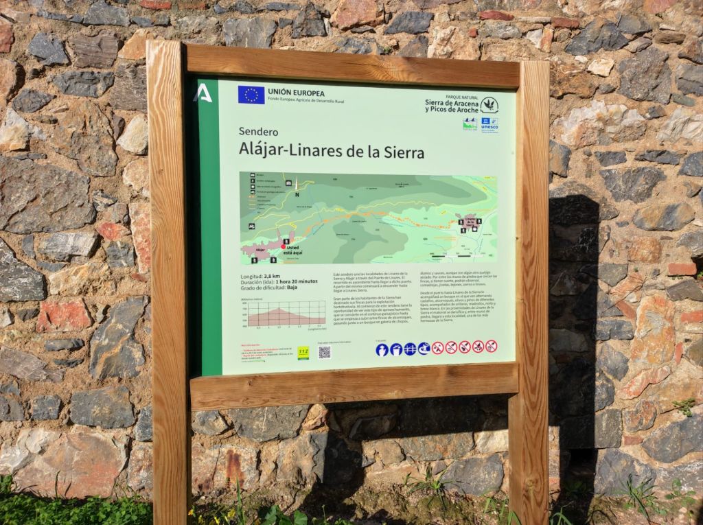 Alcanzamos un mirador sobre Alajar y la Sierra de Alajar y comenzamos un fuerte descenso hacia la Peña de Arias Montano lugar al que se retiró este humanista que vivió durante el reinado de Felipe II. Actualmente es un lugar muy turístico y visitado por los onubenses y amantes del PN de Aracena y Picos de Aroche. Continuamos el descenso hasta la localidad de Alajar, donde hacemos una parada para tomar algo y reponer fuerzas. Hacemos una breve visita turística y continuamos a por la ultima parte de nuestro recorrido de hoy: un bonito camino que une Alájar y Linares de la Sierra.