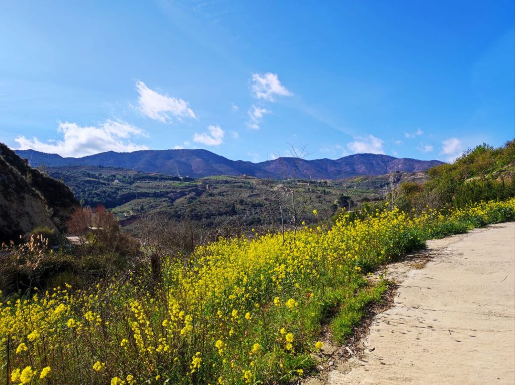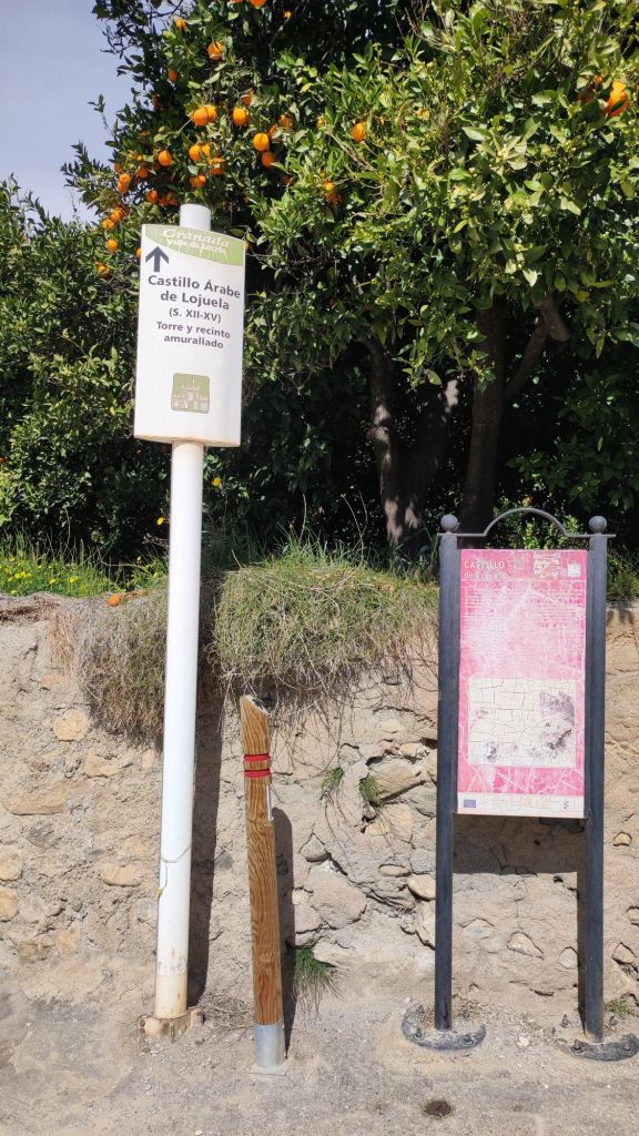 El camino, bien señalizado, comienza una leve subida hasta llegar a la fuente de Frasquito a la emtrada de un cortijo en precario estado. Desde este punto el camino se pone un poco más empinado, siempre rodeado de los habituales huertos de cítricos, y en una de las revueltas del camino tenemos unas buenas vistas sobre el Castillo y fortaleza de Lojuela, una fortaleza de época califal en la margen izquierda del Río Dúrcal. Quedan restos de una torre de gran tamaño y unos lienzos de muralla de forma escalonada. Al llegar a la localidad de Murchas encontramos un panel informativo y las balizas de una ruta hasta el castillo. A la entrada de Murchas nos detenemos un rato con Ramón, que está trabajando en su huerto. Al despedirnos nos llena las mochilas de naranjas.