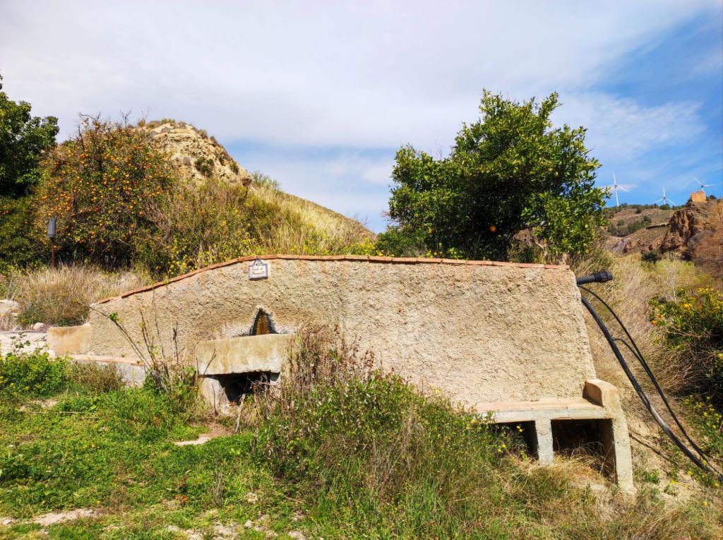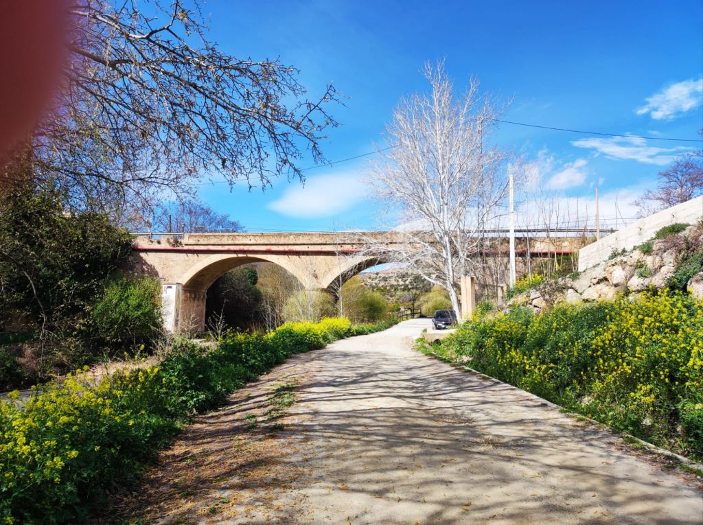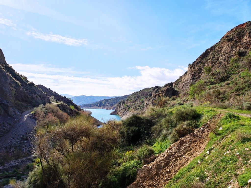 Seguimos este camino de servicio durante unos cuatro kilómetros, la parte más aburrida de la ruta, acompañados por los huertos de naranjos y limoneros a nuestra derecha y el embalse a la izquierda. Aunque ha tenido tiempos mejores, las lluvias de estos últimos días le dan un aspecto bastante razonable. Hacia el km 7,1 de nuestro recorrido llegamos a los Baños de Melegís . Se trata de una instalación de varias piscinas que aprovechan unas aguas termales de la zona. Aunque se restauraron en 2022, actualmente presentan un estado de abandono deplorable. Continuamos nuestro caminar bordeando el embalse y hacia el km 8 de nuestro recorrido alcanzamos la cola del embalse y seguimos un camino paralelo al río Izbor que baja con un buen caudal hacia el embalse. Hacia el noveno kilómetro de nuestro recorrido pasamos bajo un bonito puente que comunica la localidad de Restábal con la carretera del Valle. Pasamos bajo el puente y seguimos el curso del Río Izbor. Unos 200 metros más adelante llegamos a la desembocadura del Río Dúrcal en el Izbor y nuestro camino sigue el cauce de este último. Entramos en la Ruta señalizada del Azahar entre Restábal y Melegís.