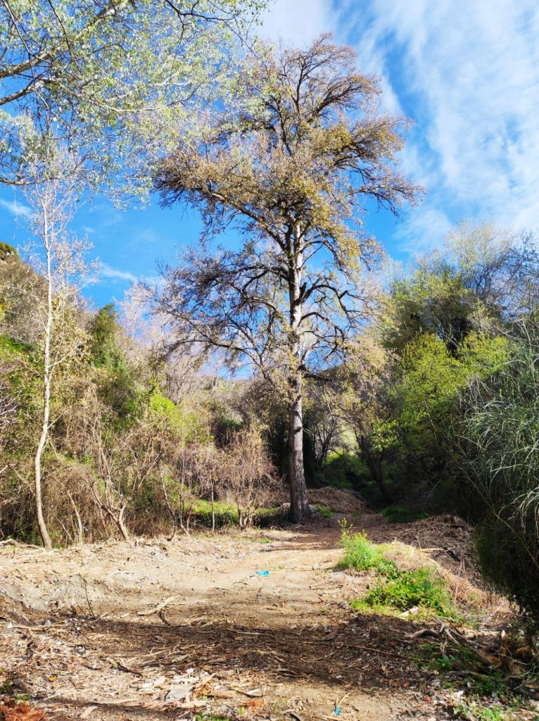 Dejamos el coche cerca de la ermita del Santo Cristo en Talará, una pequeña localidad perteneciente al municipio granadino de Lecrín. Por la calle Cristóbal Colón nos dirigimos hacia la salida de Lecrín en dirección a Chite. Enseguida la calle desemboca en un camino rural bordeado por una cantarina acequia entre huertos de naranjos y limoneros. La mañana está fresca y soleada, por lo que caminar en este entorno es un placer. Llegamos a la entrada de Chite y, enseguida, vemos las balizas del sendero del Barranco de Chite. La Calle Alta de Chite desemboca directamente en un camino paralelo al barranco que seguiremos durante un par de kilómetros. Este trecho discurre bajo un bonito bosque galería en el que destacan grupos de grandes álamos. En uno de ellos encontramos uno de estos singulares árboles que destaca por su altura y tronco. Hay que vadear varias veces el barranco y, aunque viene algo crecido los pasos se hacen sin complicaciones. Tras un último cruce llegamos al camino de servicio del embalse de Béznar que discurre bordeándolo a cierta altura. Al otro lado del embalse vamos viendo diversas localidades entre las que destaca Pinos de Valle.