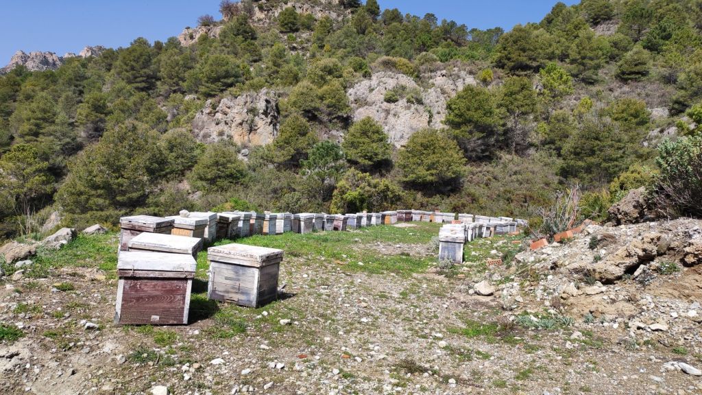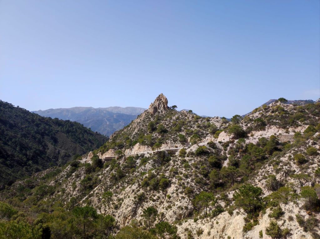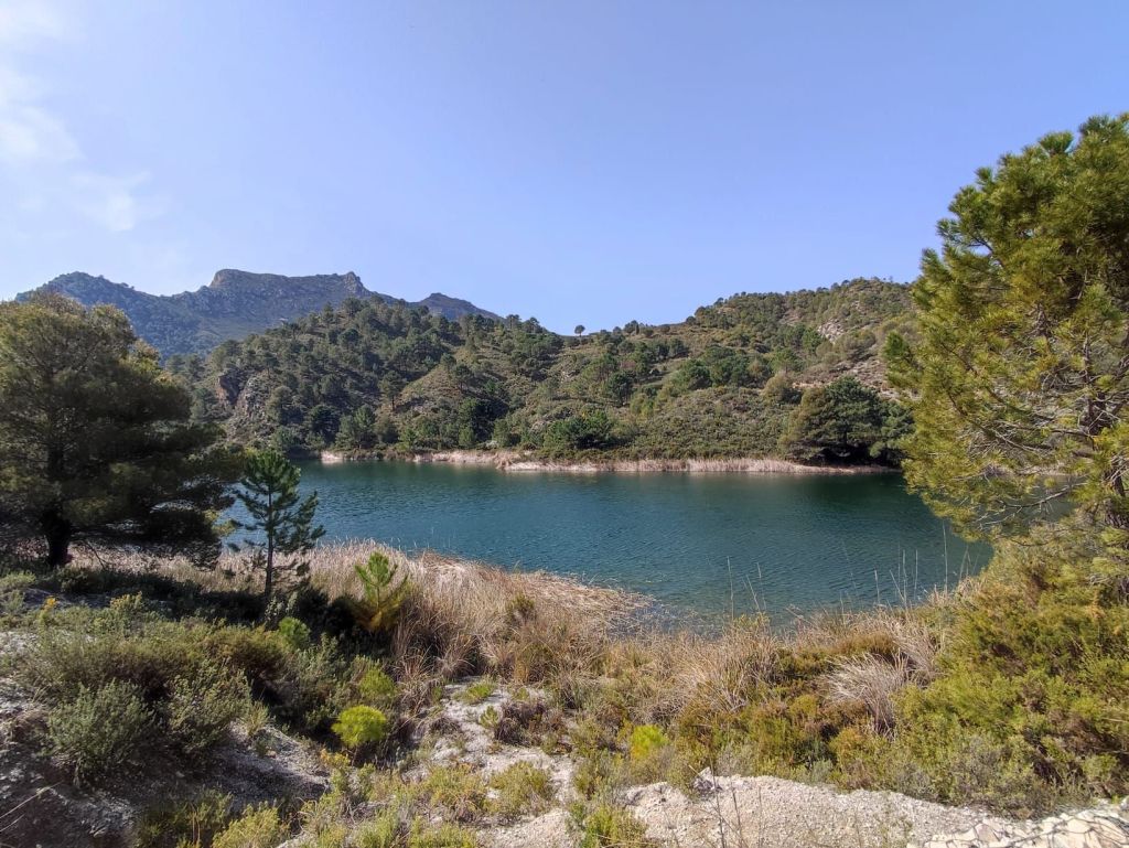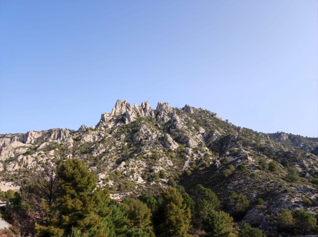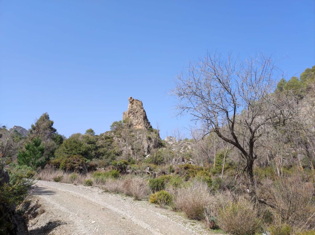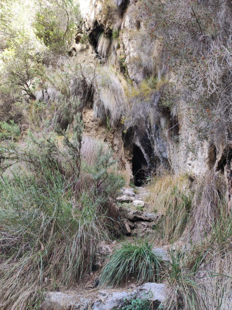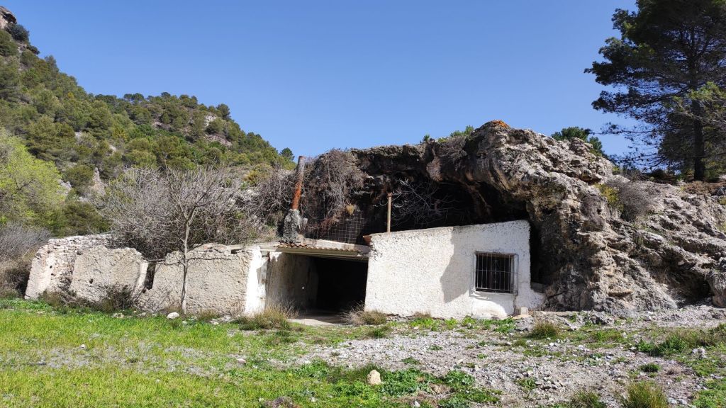 Por el carril de la derecha, al principio en suave subida, llegaremos a un embalse conocido como Embalse de la Cueva de Funes. El carril continúa hasta una oquedad en la roca conocida como la cueva de Funes, a la que se añadieron unas edificaciones para aprovechar el lugar como redil y vivienda. Actualmente está muy deteriorada y en franco abandono. Bordeando las edificaciones continuamos el carril en suave ascenso y, poco después, encontramos unas colmenas de abejas con las que hay que tener precaución. Este tramo de carril desemboca en el lecho del Barranco de Chortales. Ascendiendo el cauce del barranco encontramos otro carril a la derecha que , en fuerte subida se dirige hacia la Carretera de la Cabra. Llegados a la carretera, continuamos unos 200 metros hasta llegar al aparcamiento de la salida.