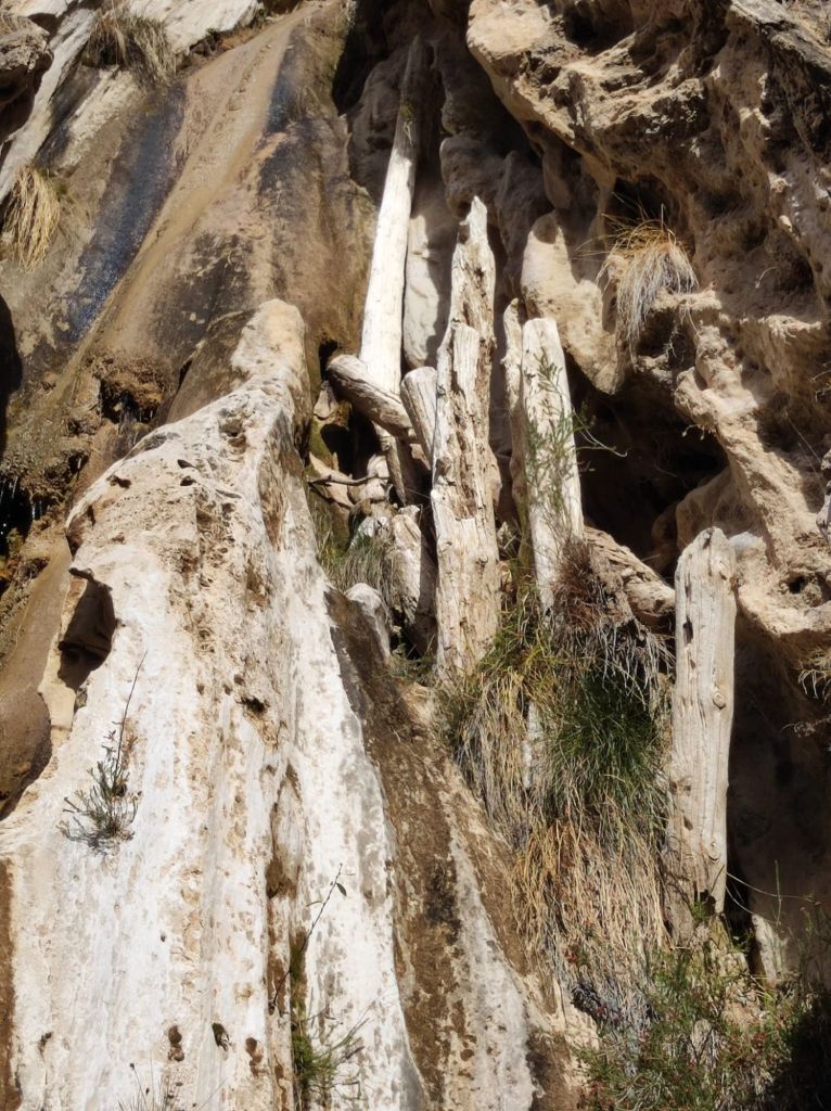Tras culminar el descenso, en un recodo del camino encontramos la cascada, que llama la atención por los troncos de los árboles que se quedaron enganchados en las rocas y sobre los que se ha ido depositando con el paso de los años una capa de caliza que les dan ese aspecto fantasmagórico. Esos troncos llegaron hasta aquí por las explotaciones madereras del siglo pasado que usaban las corrientes de agua para desplazar los troncos hasta un lugar de recogida adecuado. El sendero pasa junto a la cascada y continúa siguiendo el Barranco del Pito hasta llegar a una bifurcación en el punto más bajo del recorrido. El sendero del río Verde sigue por la margen izquierda del río y nosotros continuaremos el recorrido por un carril que discurre por la margen derecha y se aleja del río progresivamente.