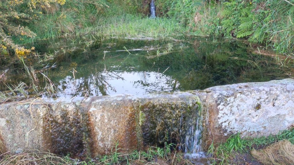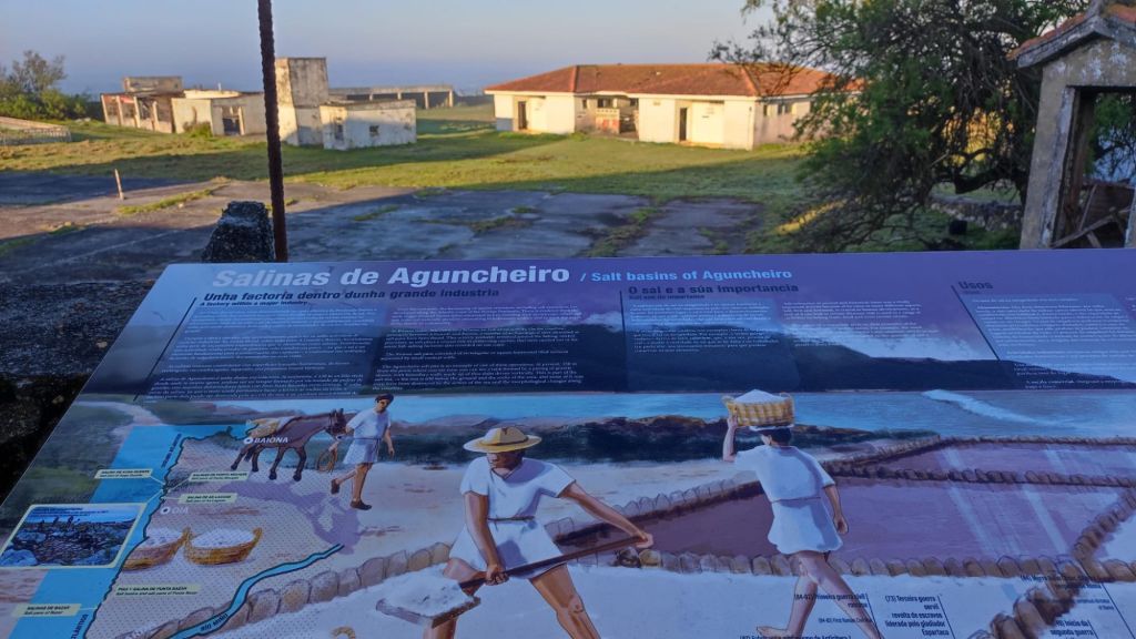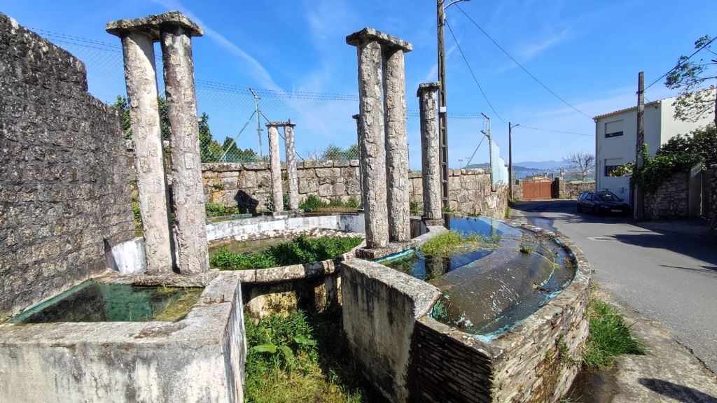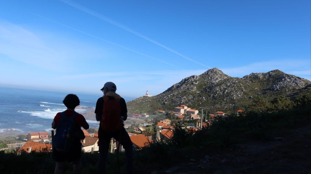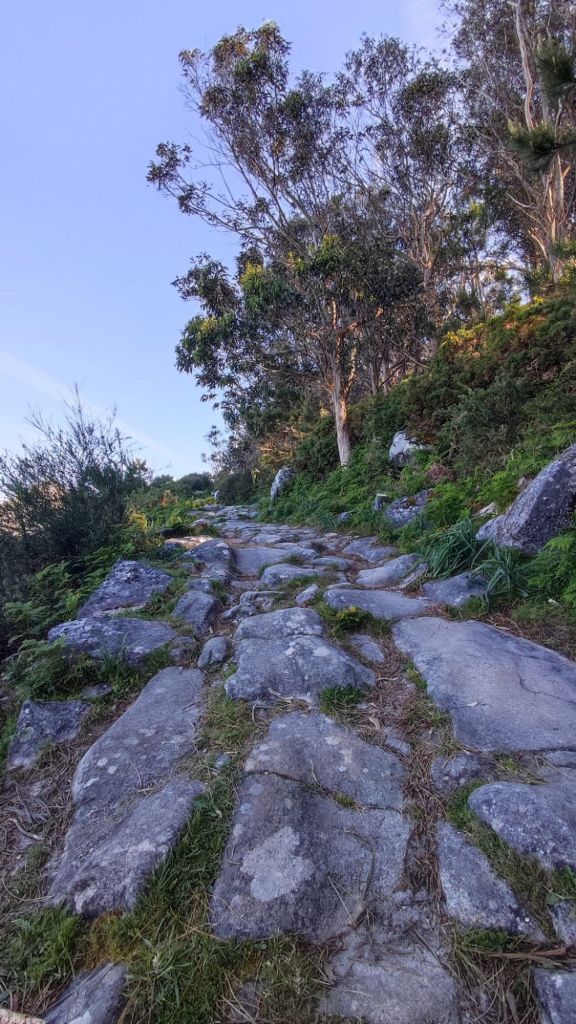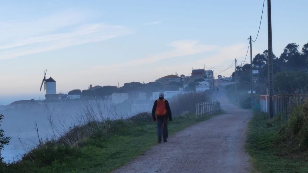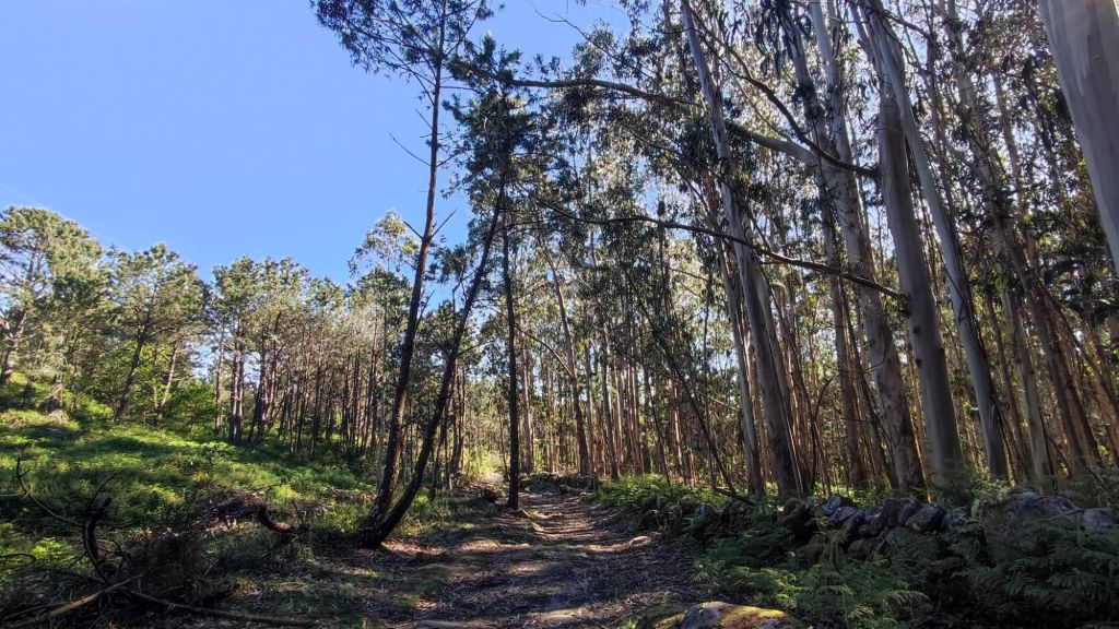 A partir de este punto nos acercamos nuevamente al océano entre muros de piedras. El paseo es bastante apacible, al tiempo que nuevos elementos etnográficos se unen al paisaje. En este caso algunos molinos de viento en diverso estado de conservación entre los que destaca el reclamo del Camping O Muiño que parece acabado de construir. Un poco más adelante volvemos al carril bici junto a la carretera y nos encontramos con una pareja coreana que encontramos ayer en el Albergue. Caminaremos a la par hasta que comience las subidas del final. Frente al restaurante O Pedrusco vemos la Pedra Rubia y nos vamos acercando a la parroquia de As Mariñas. Antes de entrar al lugar , tenemos que cruzar la carretera y comenzar a subir por la Estrada da Portela, por la que tenemos que cruzar una portilla que nos permite cruzar una finca particular con caballos en libertad, y deberemos cerrarlas tras nuestro paso. La empinada calzada (probablemente de origen romano) está empedrada y se aprecian las marcas de las viejas rodadas. Tras unas fuertes rampas alcanzamos el punto más alto de la etapa mientras disfrutamos de una bella imagen del Faro de Cabo Silleiro. El descenso se realiza por la misma calzada empedrada bajo un bosque de eucaliptos. La bajada que nos llevará hasta Baredo y sus casas, pasando por el cruceiro de O Sinal, cruzando el arroyo del mismo nombre y el comienzo del paseo fluvial de los molinos de Baredo.