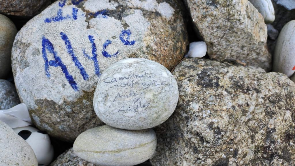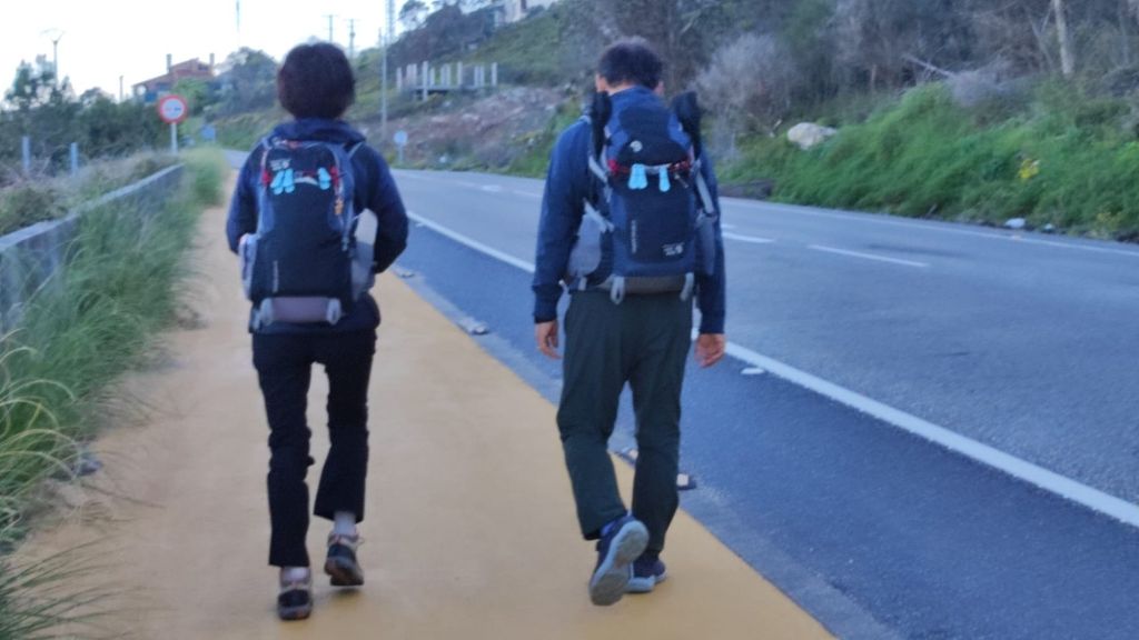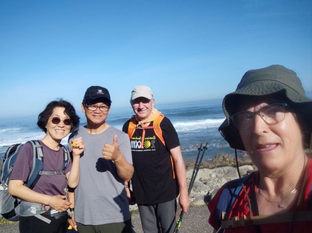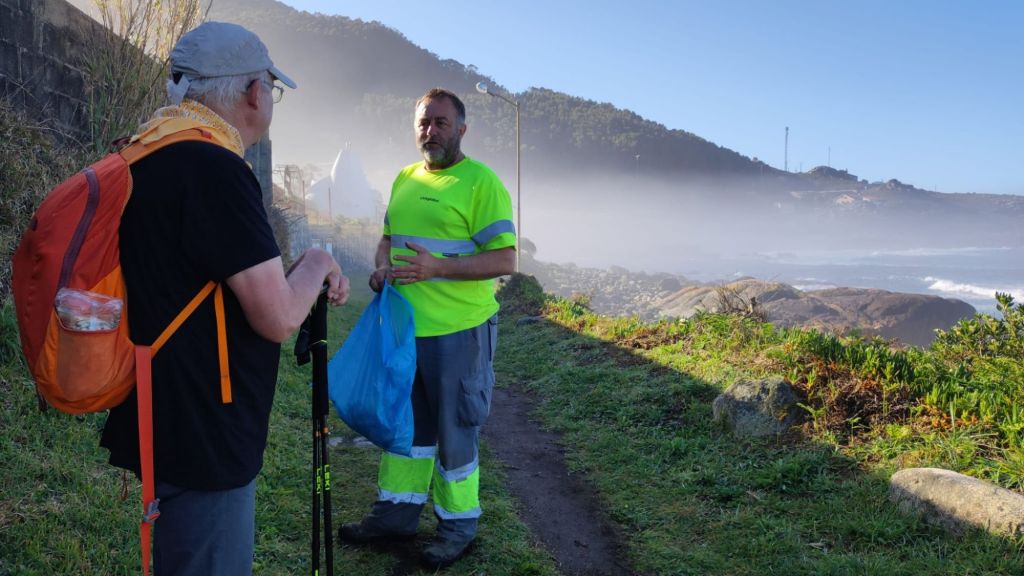 Comenzamos a caminar a las 8:15 de la mañana. Hemos desayunado en la gasolinera donde hemos vuelto a encontrar a Daniel, uruguayo al que conocimos durante la cena. Nos ofrece unas galletas que le sobran y nos despedimos. Él quiere pasar hoy de Vigo, por lo que puede que ya no lo volvamos a encontrar. Cuando salimos del Albergue ya no quedaba nadie, somos los últimos en salir. Para no perder el hábito comenzamos caminando por el carril bici compartido de color amarillo junto a la carretera local. Afortunadamente, en menos de un km nos desviamos a la derecha por un camino rural asfaltado con muy poco tráfico a esas horas. La mañana está muy agradable para caminar y el océano, un poco más saltarín que ayer, deja una húmeda bruma en el aire que refresca el ambiente algunos grados. Entre los muros que cercan las fincas ganaderas vamos llegando a la parroquia de Mougás, aún en el Concello de Oria. En un pequeño altozano, los caminantes han ido dejando junto a uno de los hitos del camino un montoncito de cantos decorados. La mayoría se lo ha currado y hay auténticas obras de arte.