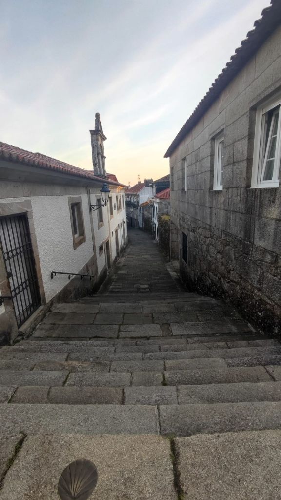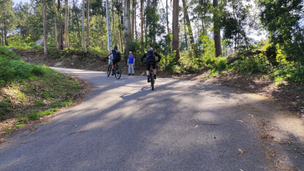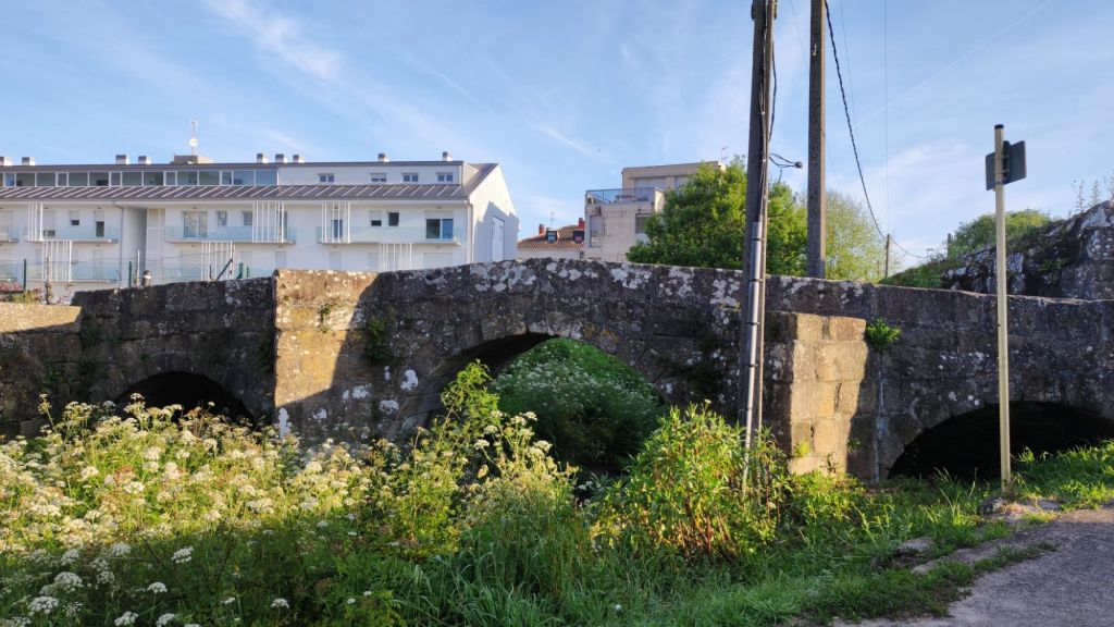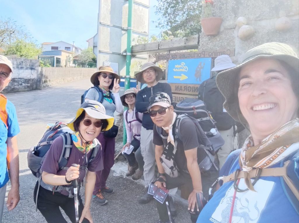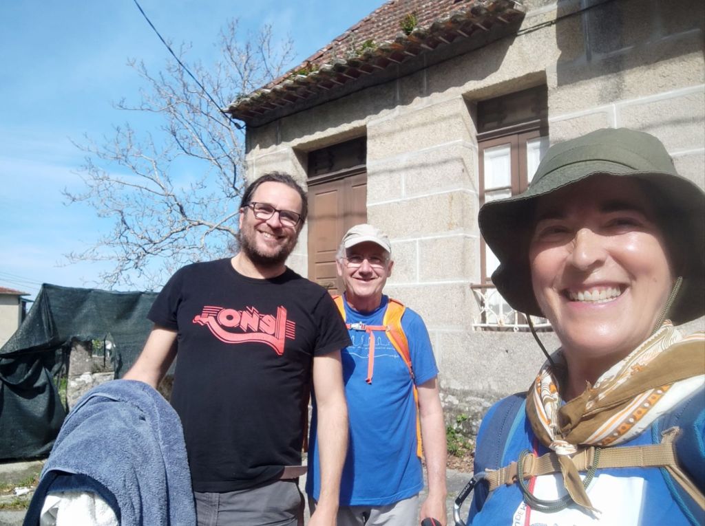 Entramos en el Concello de Nigrán por un paseo fluvial, el camino do Souto y continuamos por el camino de Rosiña hasta alcanzar el núcleo de Nigrán. Por el camino pasamos junto a los pazos de Urzaiz y Cea ya en subida por el monte Sanromán hasta llegar a la parroquia de Priegue, aún en el Concello de Nigrán. Aquí encontramos a nuestros amigos coreanos de ayer junto a un grupo de compatriotas y nos agrupamos junto al banco de Paco, un banco jacobeo muy instagramable con sello e indicaciones de distancias a diversos lugares. La carretera comarcal PO-550 nos acompaña en esta parte del camino. En ella nos encontramos con Mintxo, técnico de sonido de Rosendo durante veinte años y con el que departimos unos minutos.