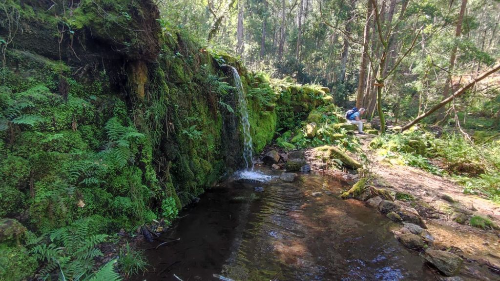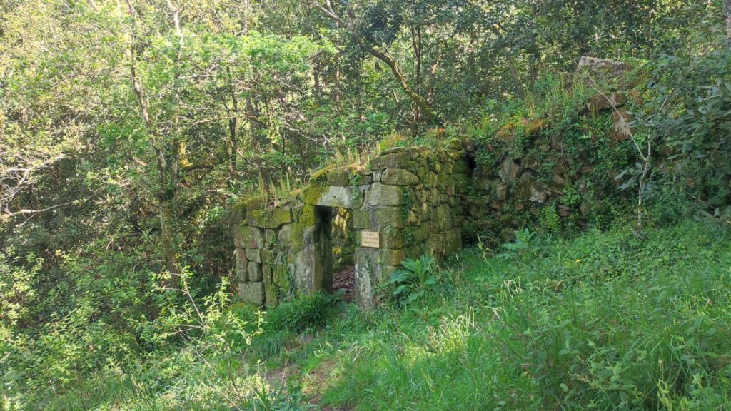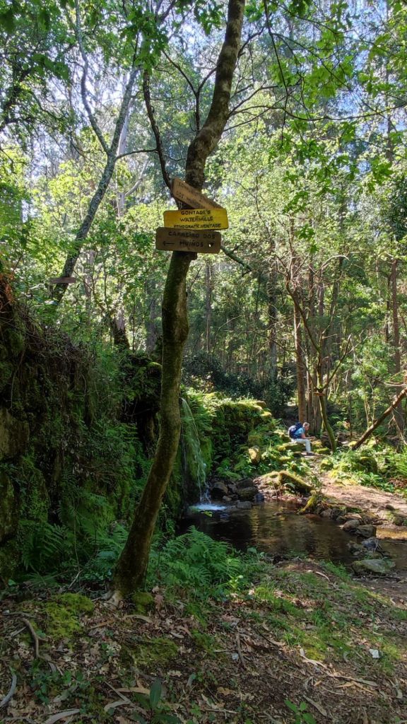 Continuamos por el camino hasta llegar a los montes de Saians, un bucólico monte en el que vamos a encontrar una ruta por diversos molinos hidráulicos. Al llegar a la cima y junto al hito que nos indica que faltan “solamente” 115 km hasta Santiago y con unas fabulosas vistas sobre las Islas Cíes encontramos a Nikki y Andy, una pareja de australianos que hacen su primer camino y con los que nos hemos ido cruzando a lo largo de la mañana. El descenso nos lleva por la ruta de los molinos, algunos de ellos naviculares, cercanos al Castro de Medoña. En este descenso encontramos algunas fuentes y una bonita cascada en la Fraga de Gontade.