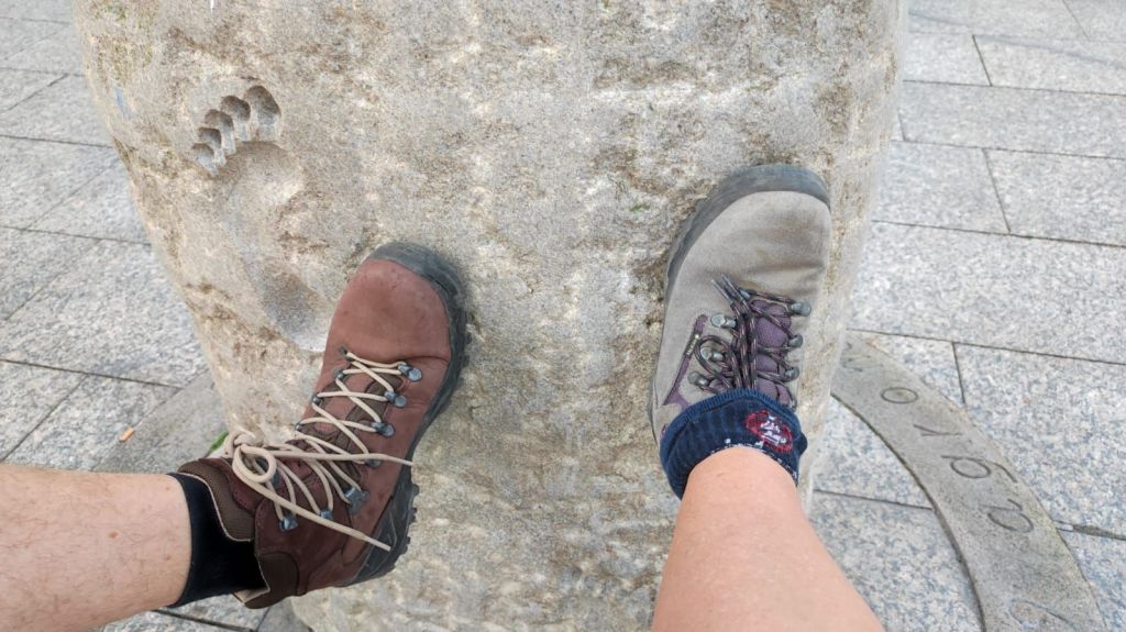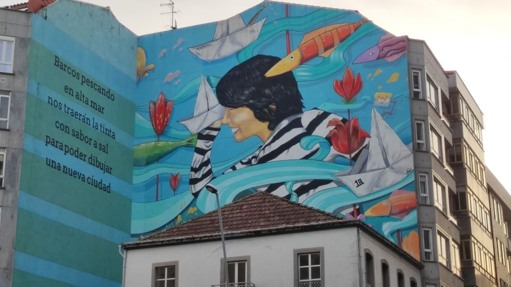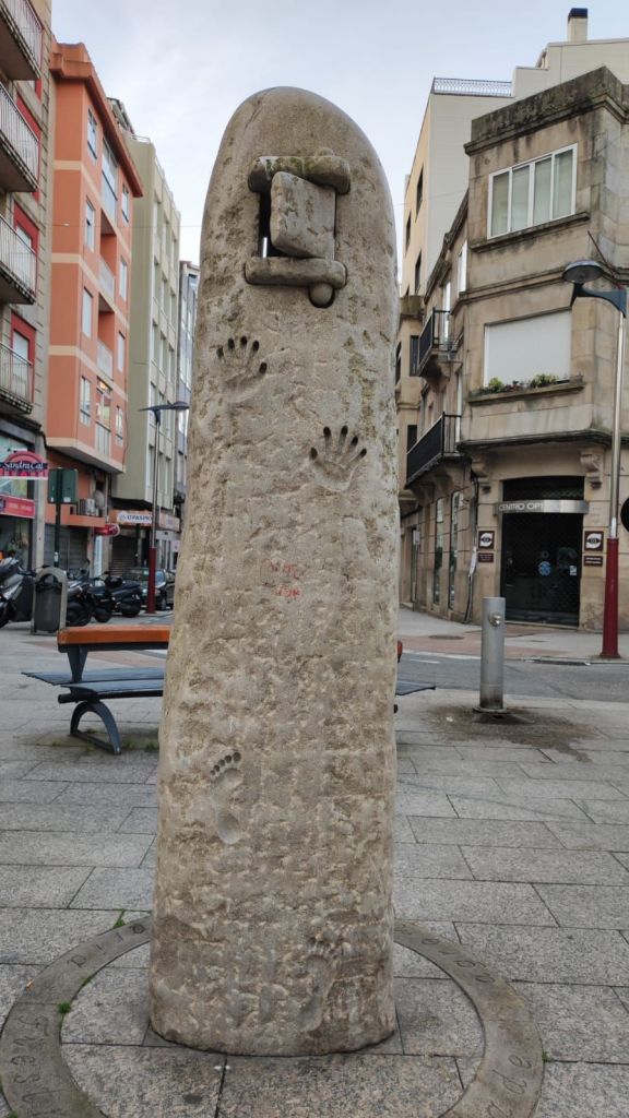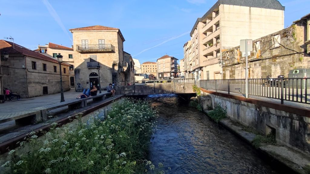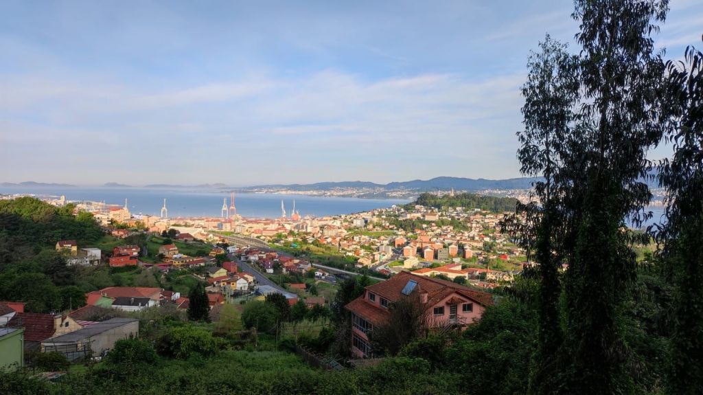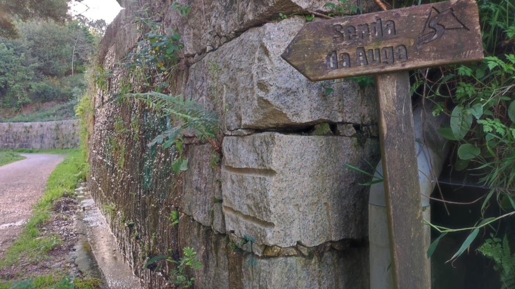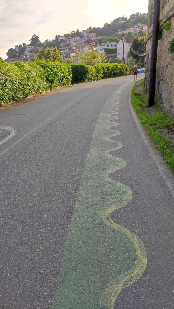 Iniciamos la etapa cruzando la ciudad de Vigo subiendo por la Calle Urzaiz, una de las más populosas de la ciudad y en la que a estas horas coincidimos caminantes y trasnochadores. Por el camino encontramos diversos elementos ornamentales y arquitectónicos. Igualmente, encontramos diversas muestras de arte urbano en las que los artistas urbanos han plasmado su buen hacer. A pesar de que se dice que la salida de Vigo es un poco caótica, en nuestro recorrido no hemos dejado de ver flechas amarillas y conchas que nos han balizado el camino.Llegamos al popular barrio del Calvario, pasamos junto al mercado municipal y, un poco más adelante llama la atención la iglesia de los Picos, muestra de arquitectura contemporánea. Finalmente dejamos Vigo “oficialmente” por el barrio de Teis y, junto a la fuente de Pouleira el camino se une a la Senda da Traída das Augas. Unas ondas verdes y amarillas nos indican por donde debemos caminar. La senda es compartida con ciclistas y tráfico rodado por lo que hay que extremar las precauciones. En este tramo vamos encontrando numerosas fuentes, todas ellas con agua abundante.