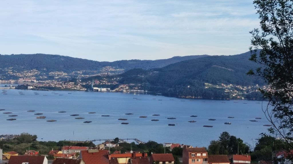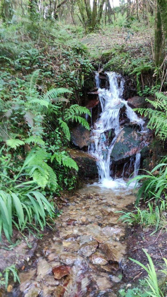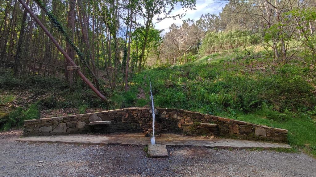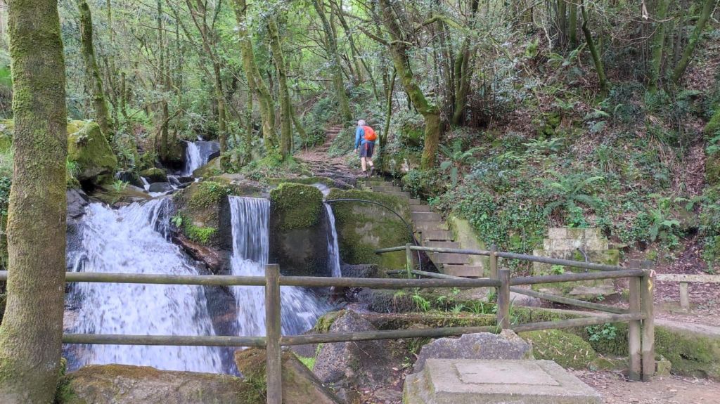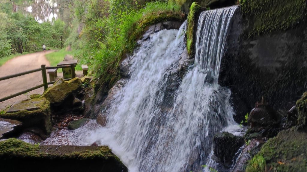 Iremos saliendo a pistas en el bosque y a asfalto en una parte bastante tranquila y en la que podemos ver la boca de la Ría de Vigo, con las islas Cíes al fondo, las bateas de mejillones por doquier y las industrias auxiliares del puerto vigués. Pronto llegamos a uno de los puntos más bonitos del recorrido, una preciosa cascada que hace el Rego Fondón, donde además de una fuente hay unas mesas para hacer un alto en el camino si es necesario. Vale la pena subir por unas escaleras que remontan el torrente, porque la sensación es inigualable.