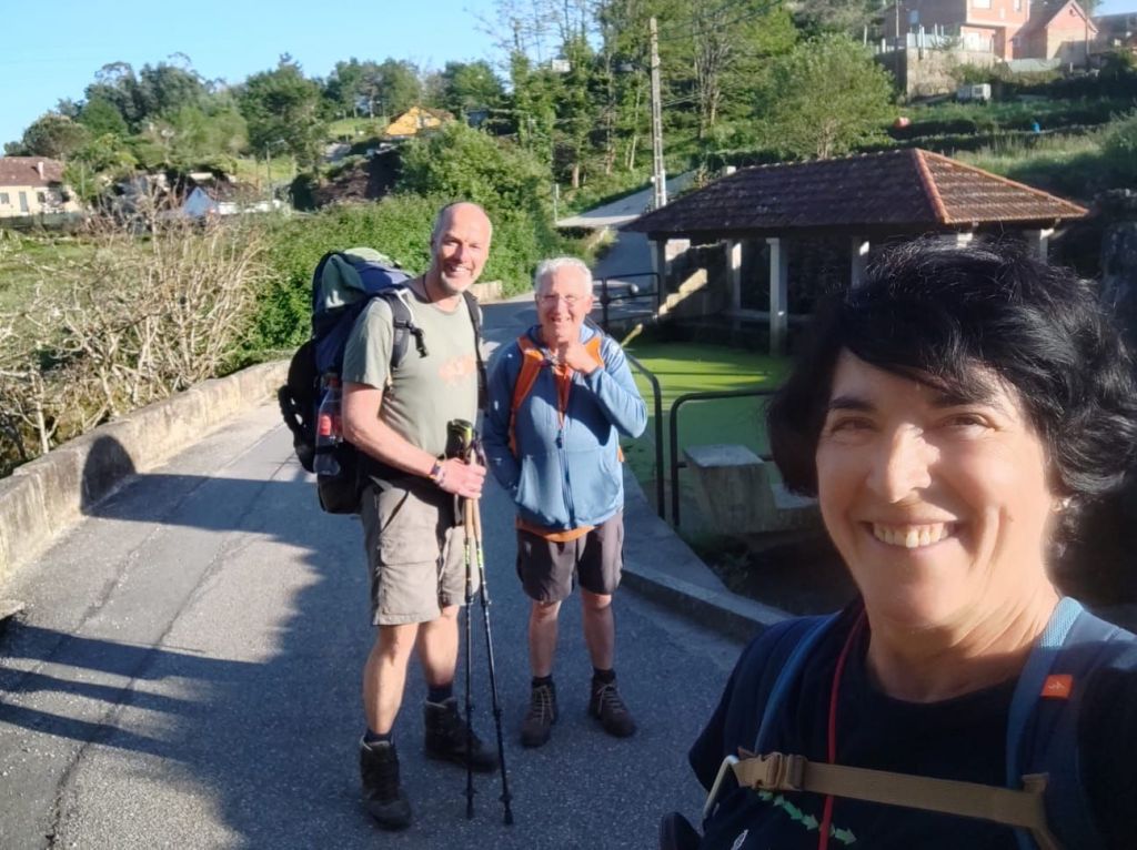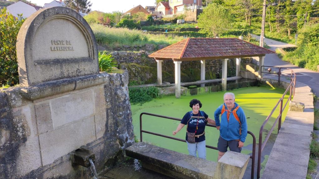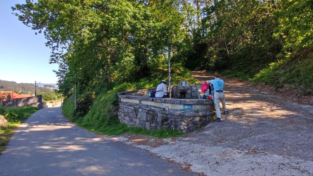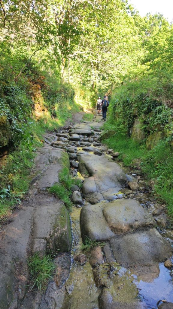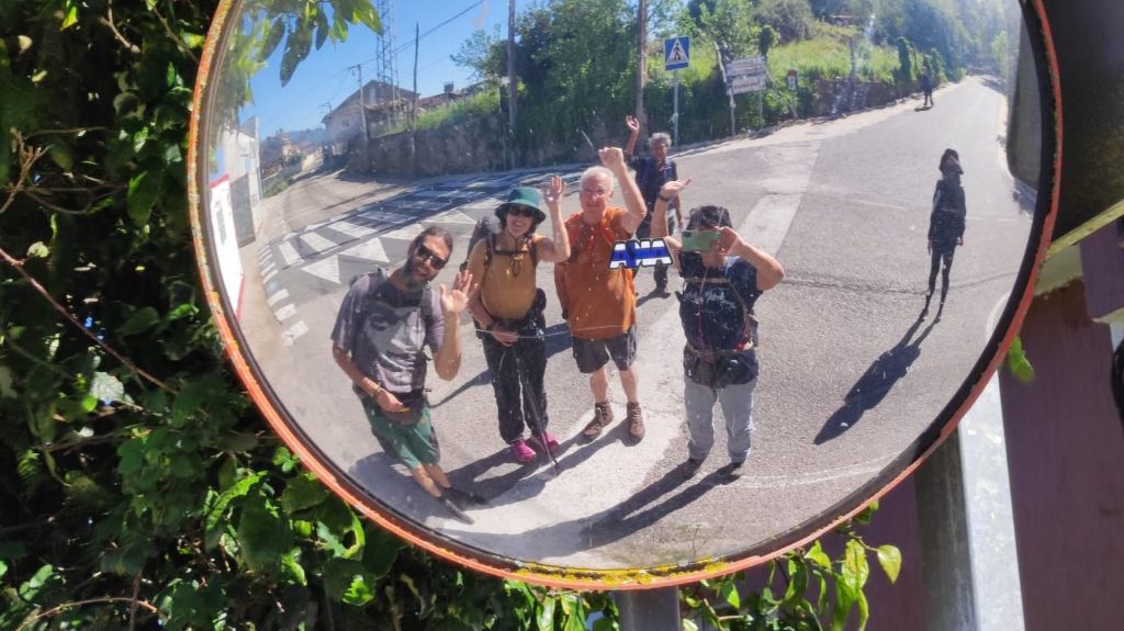 Pasado el puente una serpenteante subida entre hórreos, cruceiros y lavaderos nos dirige hacia una senda de altos muros cubiertos de musgo y bajo un bosquecillo de variada vegetación que nos lleva hacia el río Ulló que cruzamos por un puente metálico. La subida continúa por lo que parece una calzada romana (tal vez la via XIX) con evidentes huellas del tránsito de carros. Por ella subimos a A brea Vella y A canicuova. En la subida hay unos vendedores de merchandising del camino y nos encontramos con un grupito en el que a una señora le cantan el “cumpleaños feliz”. Nos dicen que es su 80 cumpleaños, todo un ejemplo. En el grupito entablamos conversación con Jose Antonio un malagueño residente en Maracena que apunta sus reflexiones sobre el camino en post it amarillo fluorescente. Nos vamos acercando a Pontevedra a través de varios núcleos urbanos como A Boullosa y Santa Comba de Bértola donde vemos la Capilla de Santa Marta. Nos reencontramos con Jose Antonio y nos presenta a una canadiense de Nombre Cara. Hacemos un selfie en un espejo de la carretera y entramos en el camino alternativo de la Senda Fluvial de Río Tomeza o Senda Dos Gafos.