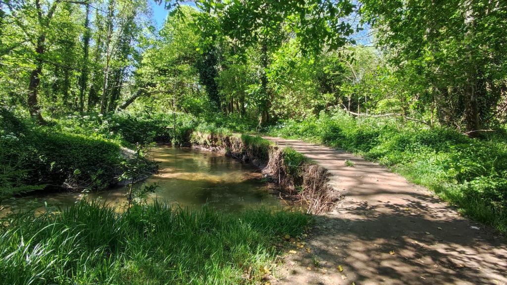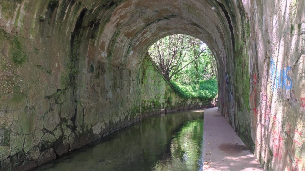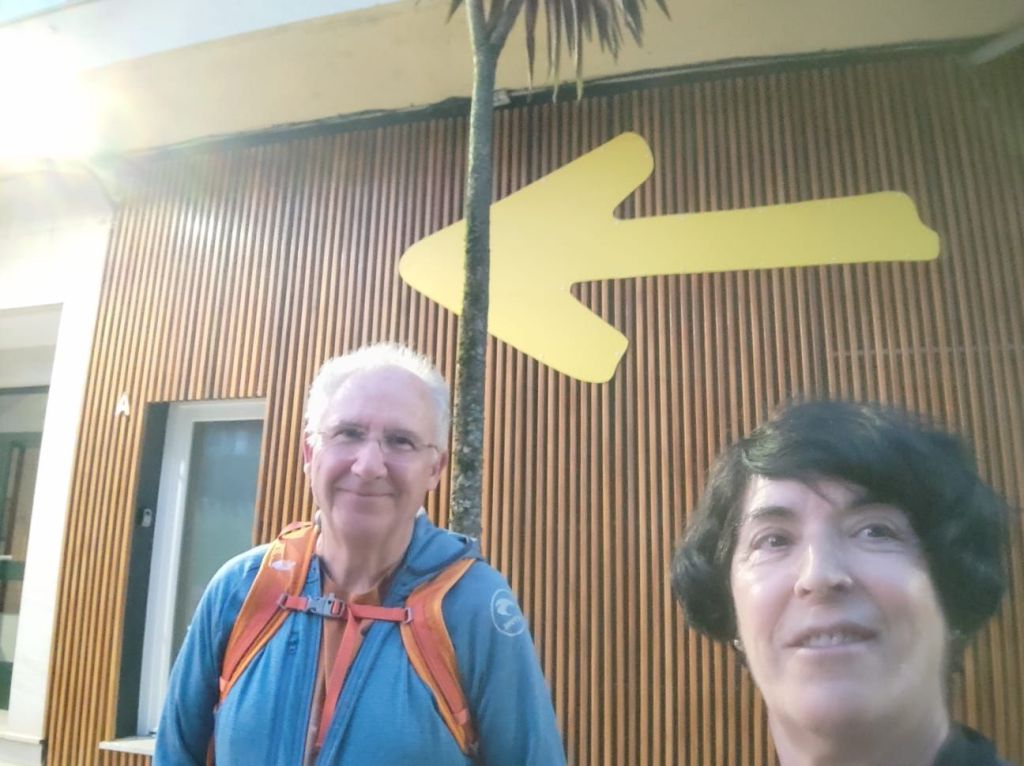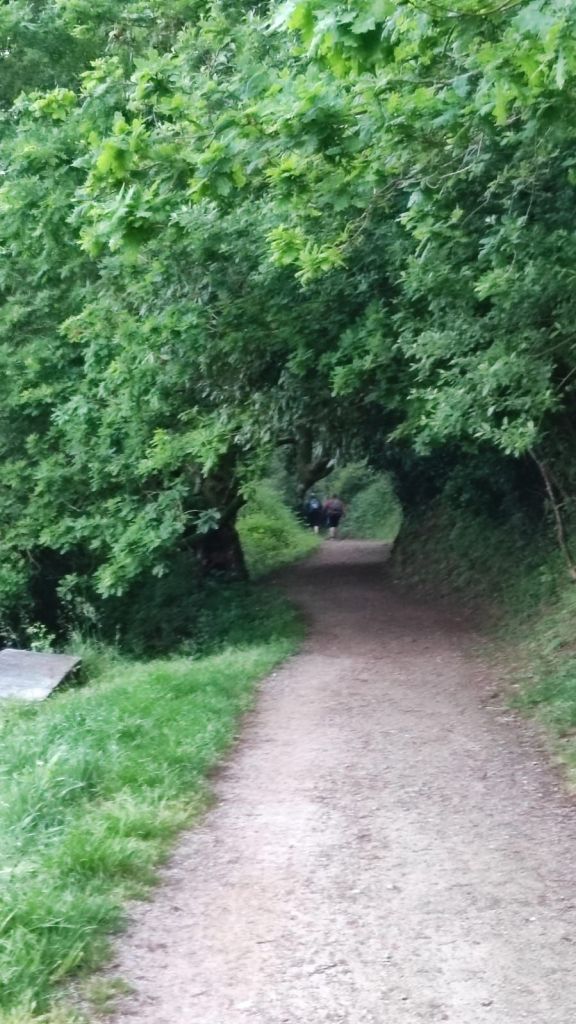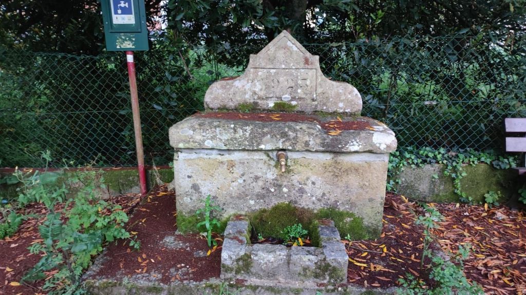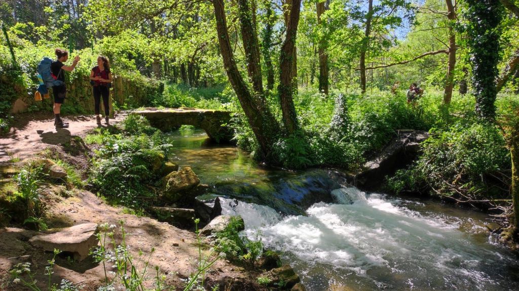Pasado el puente una serpenteante subida entre hórreos, cruceiros y lavaderos nos dirige hacia una senda de altos muros cubiertos de musgo y bajo un bosquecillo de variada vegetación que nos lleva hacia el río Ulló que cruzamos por un puente metálico. La subida continúa por lo que parece una calzada romana (tal vez la via XIX) con evidentes huellas del tránsito de carros. Por ella subimos a A brea Vella y A canicuova. En la subida hay unos vendedores de merchandising del camino y nos encontramos con un grupito en el que a una señora le cantan el “cumpleaños feliz”. Nos dicen que es su 80 cumpleaños, todo un ejemplo. En el grupito entablamos conversación con Jose Antonio un malagueño residente en Maracena que apunta sus reflexiones sobre el camino en post it amarillo fluorescente. Nos vamos acercando a Pontevedra a través de varios núcleos urbanos como A Boullosa y Santa Comba de Bértola donde vemos la Capilla de Santa Marta. Nos reencontramos con Jose Antonio y nos presenta a una canadiense de Nombre Cara. Hacemos un selfie en un espejo de la carretera y entramos en el camino alternativo de la Senda Fluvial de Río Tomeza o Senda Dos Gafos.