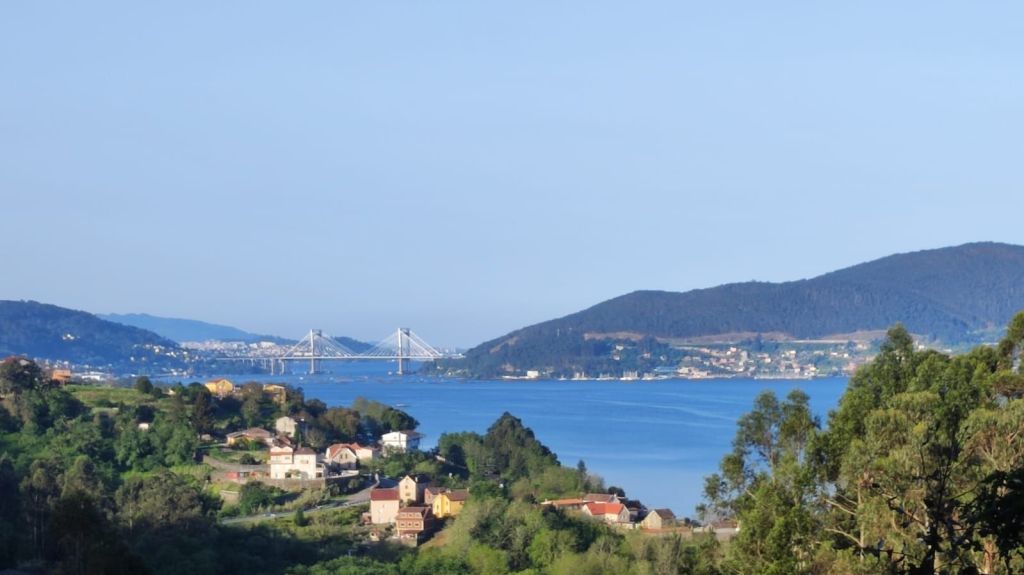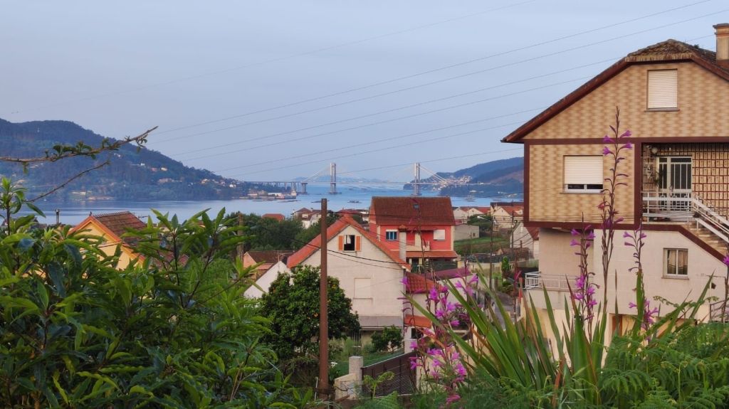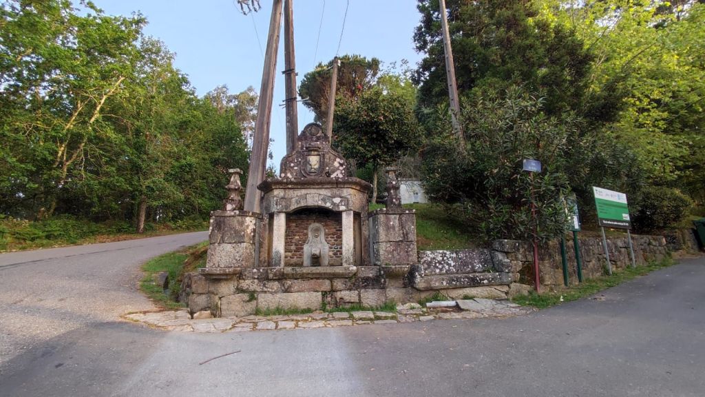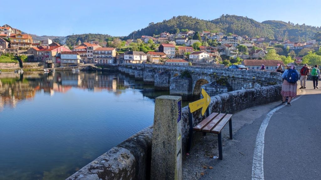 A la salida de Redondela caminamos por carreteras locales y comarcales con bastante tráfico y desde el punto de la mañana se nota ya una mayor afluencia de caminantes que en los días pasados. Por el camino Real de Cesantes llegamos a la parroquia de Cesantes ya bajo un denso bosque bastante agradable. Cruzamos de nuevo la carretera N-550 y comenzamos una leve subida hasta el área recreativa de O Viso con una fuente historiada. El camino, en subida, es bastante llevadero, con las correspondientes flechas amarillas, los hitos kilométricos y algunas conchas. En algunos lugares los peregrinos van dejando algunos recuerdos de su paso y algunas casas colocan sus alminhas en las que los caminantes también van dejando algunos recuerdos. En un momento ganamos suficiente altura y podemos ver las islas de San Simón y Santo Antón y bajo sus aguas yacen los galeones de la Batalla de Rande. Al fondo, entre bateas de mejillones tenemos una ultima vista del Puente colgante. Tras la primera subida del día, y su correspondiente descenso por un tupido bosque de eucaliptos, nos plantamos a las puertas de Arcade tras pasar junto a la fuente de A Lavandeira en la que vemos a los locales llenando botellas de agua fresca. Callejeamos un poco, pasamos ante un banco peregrino y enseguida nos encontramos en los arenales de las orillas de Río Verdugo y el famoso puente de Sampaio nos cruza a la otra orilla. Una placa nos recuerda la batalla celebrada allí durante la guerra de independencia.