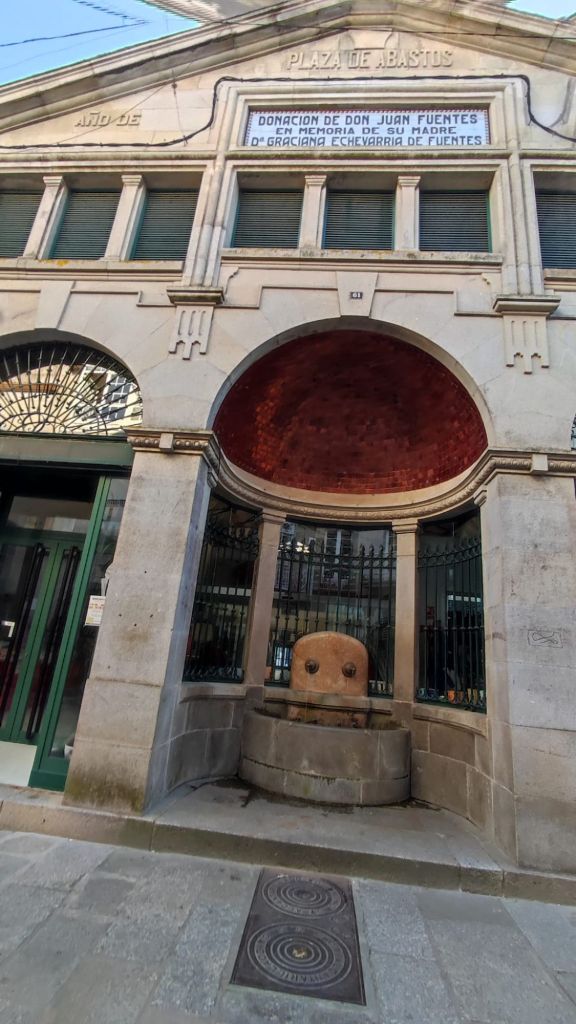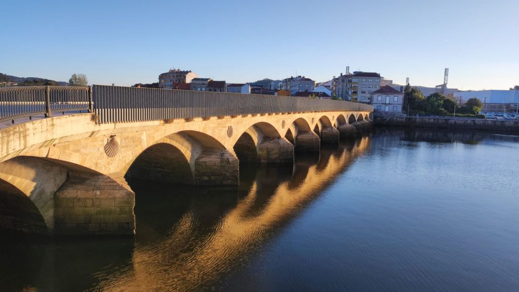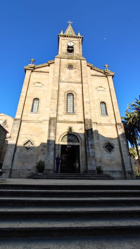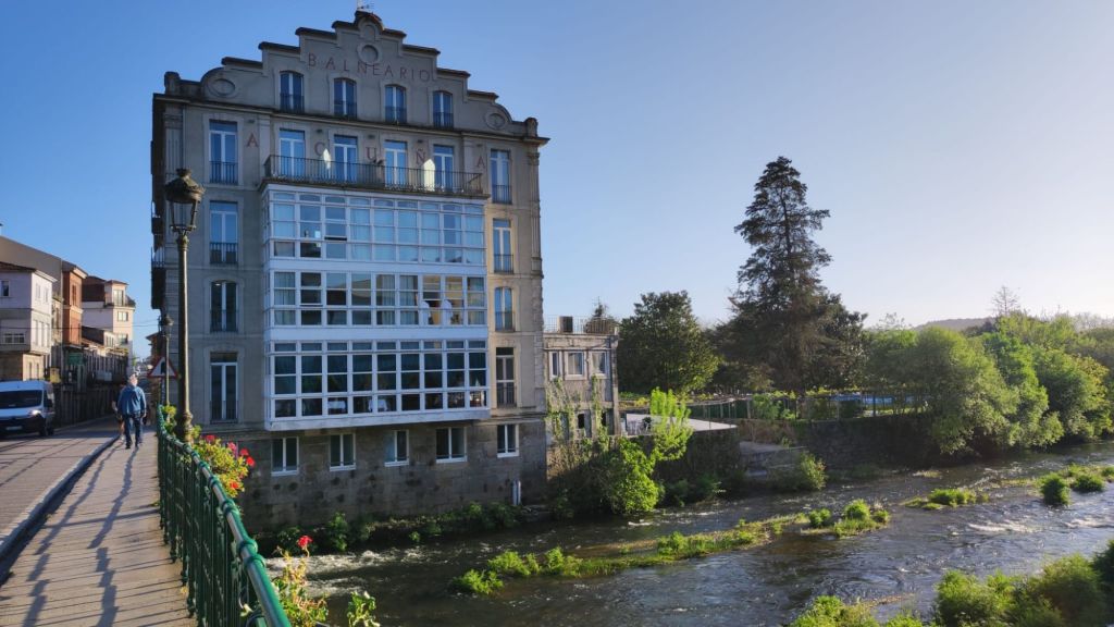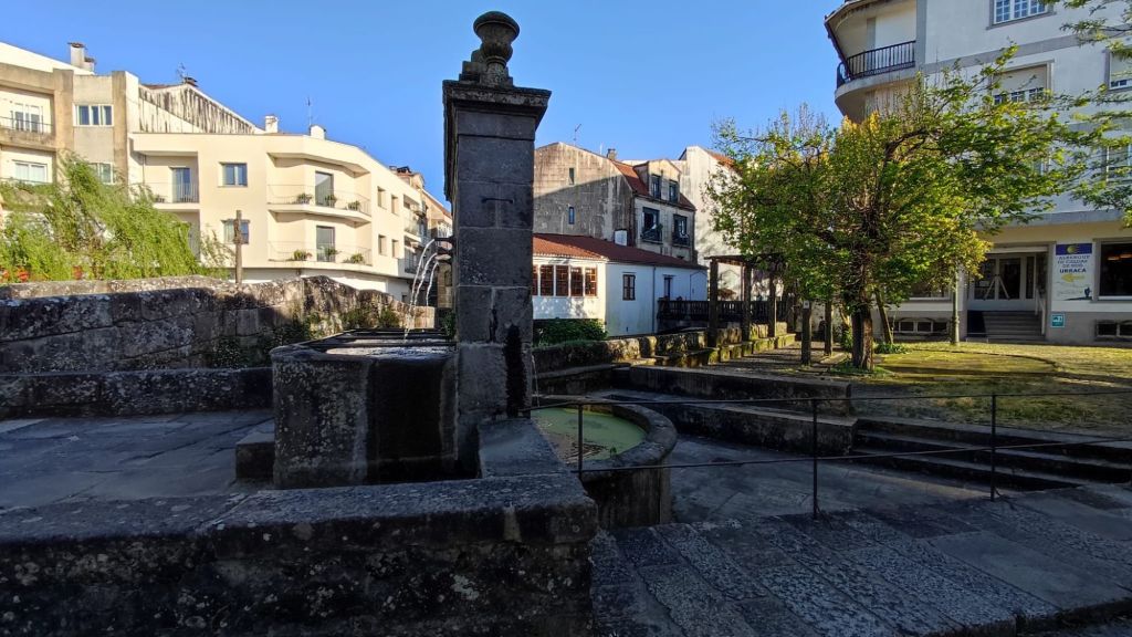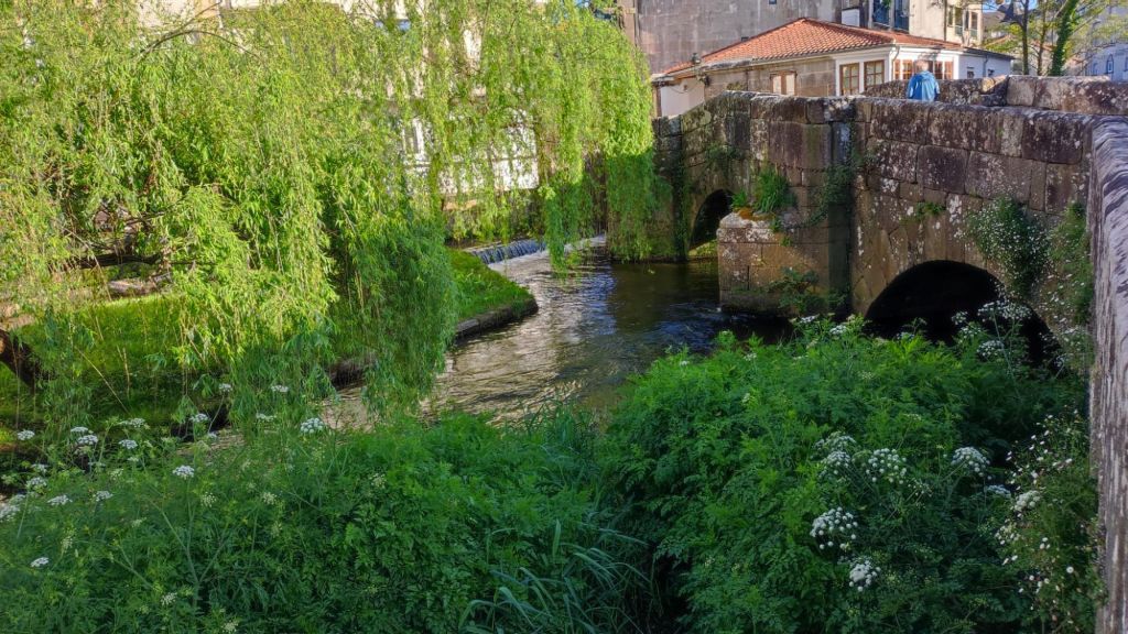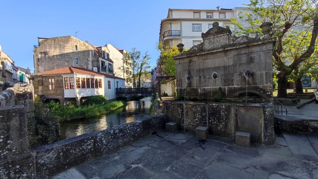 Como viene siendo habitual, por la tarde hacemos un paseo monumental por la ciudad. Nos acercamos al río Umia y lo cruzamos por el mismo puente que cruzó Almanzor, recorremos parcialmente el parque da Tafona, descubrimos la Fuente da Burga que suministraba agua caliente al lavadero del mismo nombre, el colorido Balneario Dávila. Ya estamos en la almendra central de la villa, junto a la plaza en la que Doña Urraca construyó su Torre y en su lugar y con sus restos se construyó la actual Iglesia de Santo Tomé quizás como recuerdo de paso de Santo Tomás de Canterbury por la villa en 1170. La prosperidad de la villa llevó a los “indianos” a construirse hermosas casas en la Calle Real y alrededores. Visitamos el Mercado de Abastos, donación de Juan Fuentes Echevarría en 1929, una hermosa casa en Rúa dos Fornos, ahora hotel, la Fonte de Bermaña, el puente sobre el río Bermaña y el Balneario Acuña.