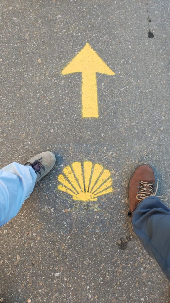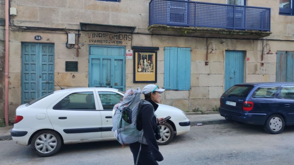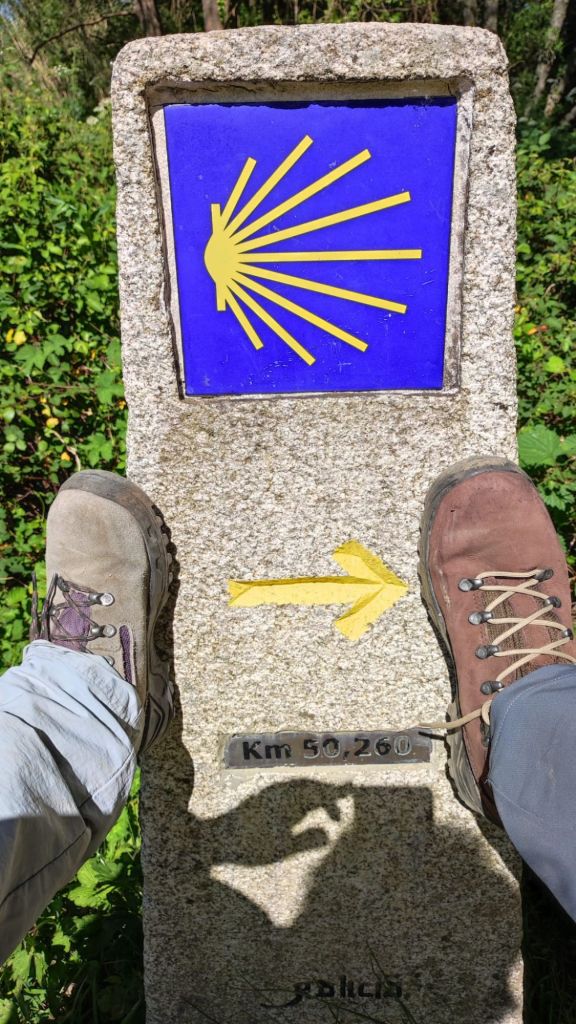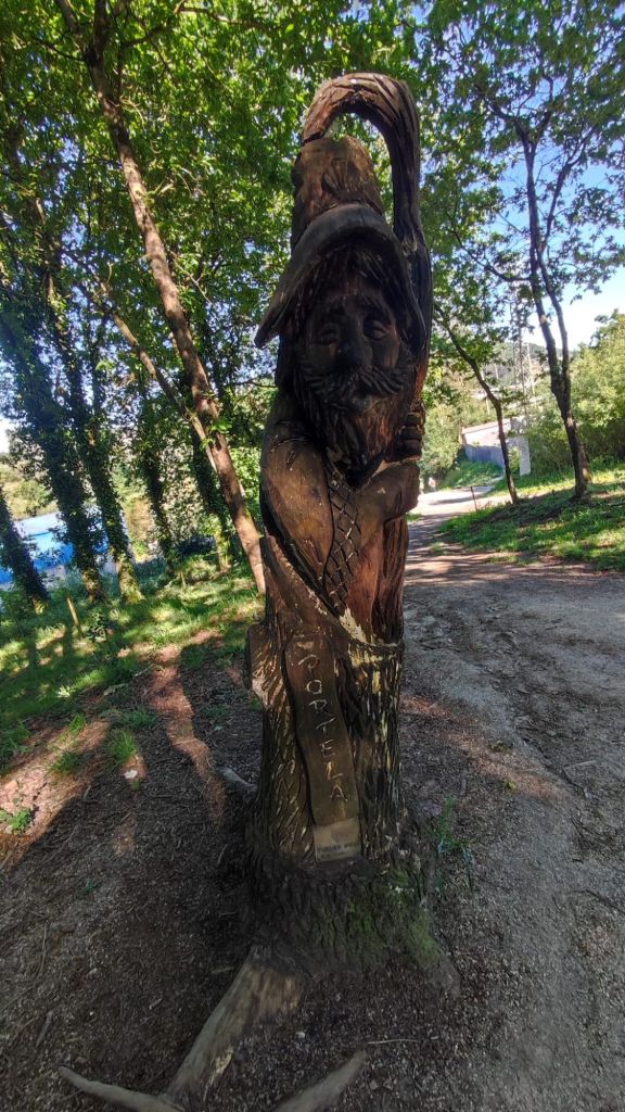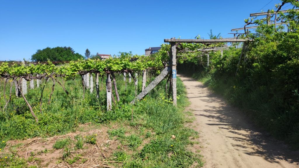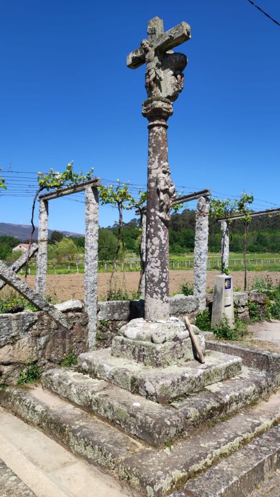 El descenso, por una carretera local nos lleva a un área recreativa con curiosas esculturas y frases motivadoras. Avanzando por la carretera local llegamos hasta la localidad de Valbón con un bonito crucero en el que además del crucificado y la virgen hay una imagen de Santiago mirando hacia Compostela. En este tramo encontramos a Lourdes y Tatiana dos chicas alicantinas con las que compartimos un rato de conversación. Un nuevo cruce de la N-550 cerca de La Seca nos deja en un bonito bar junto al aparcamiento de la Senda de los Muiños del Río Barbosa. Sellamos la credencial, vamos al servicio (toda la ruta transcurre por zonas habitadas y con muchos viandantes y es complejo encontrar intimidad) y tomamos un refrigerio. A partir de aquí es preciso prestar atención a la señalización pues los continuos serpenteos en torno a la N-550 y la nueva vía férrea de alta velocidad nos pueden despistar fácilmente. La marcha ahora es en paralelo a la nacional y tras superar el rio Agra el camino gira a la izquierda para tomar una senda entre viñedos. Estamos en la denominación de origen “Alvariño Rías Baixas” . Pasamos el hito 50 km a Santiago y entramos en el lugar de Portas. Junto al camino un albergue muy concurrido. En el jardín están Lourdes y Tatiana. Saludamos y continuamos de frente hasta una rotonda.