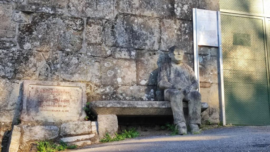 Salimos de Pontevedra a las 8 de la mañana cuando ya la Rúa da Santina es un río de gente y nos dirigimos hacia el Puente de O Burgo sobre el río Lérez que da nombre a la ciudad. A continuación, bordeamos la Marisa de A Xunqueira de Alba, muy sujeta a las fluctuaciones de las mareas. Con la marea alta se llena de agua, pero a nuestro paso debía ser marea baja y apenas parecía marisma. A continuación la ruta se encajona entre la vía del tren a la derecha y el río Granda a la izquierda. Vamos ascendiendo hacia el lugar de Pontecabras y alcanzamos la Iglesia rectoral de Santa María de Alba que tiene una escultura ante la casa rectoral que homenajea a uno de los últimos párrocos. Un poco mas adelante, en Guxilde se dice que el arzobispo Diego Gelmirez (responsable de la Catedral de Santiago) hizo un alto en su viaje desde Braga a Compostela.