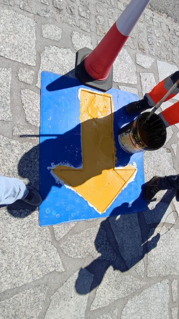 Ahora tomamos una senda paralela a la nacional que se va separando poco a poco. Continuamos por la aldea de Tivo y tomamos una pista de tierra y en unos dos kilómetros entramos en Caldas de Reis junto a la Iglesia de Santa María. Un operario está pintando las flechas amarillas desviando el camino de la N-550. Cruzamos el puente sobre el río Umia, pasamos frente a la Casa del Concello, el balneario Acuña, seguimos hasta el Balneario Dávila y detenemos nuestra marcha al comienzo de la Calle Real frente a la iglesia de Santo Tomás. La mayor parte de la ruta de hoy se desarrolla por la antigua vía romana XIX entre Astorga y Lugo. Se cree que Almanzor usó esta vía de peregrinación en su recorrido por Pontevedra para alcanzar Santiago de Compostela mientras iba destruyendo todo lo que encontraba a su paso.