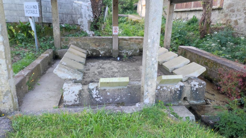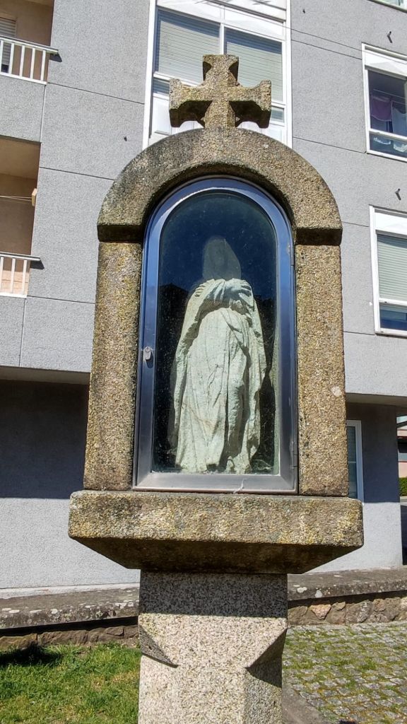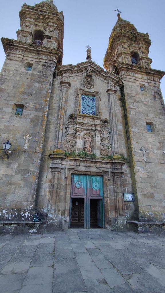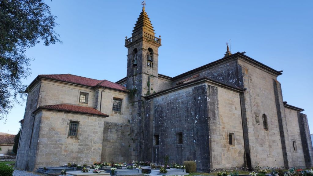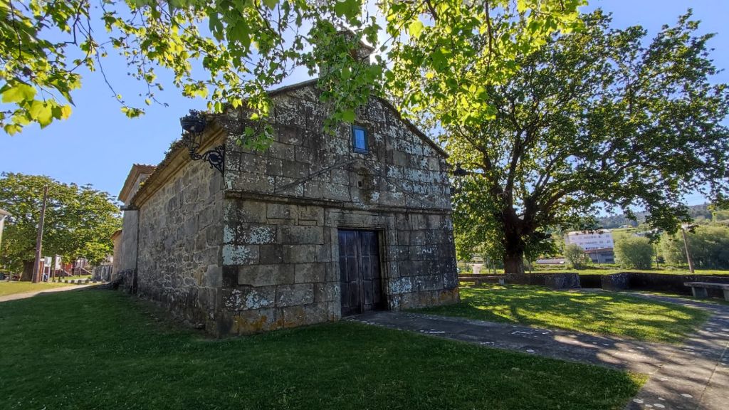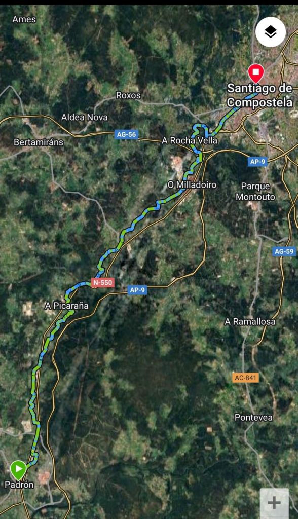 Salimos de Padrón desde la iglesia de Santiago, pasamos junto a la estación de autobuses, cruzamos un puente sobre el canal del Sal y después de cruzar la carretera N-550 entramos en Iria Flavia. Llegamos a la Colegiata de Santa María de Adina, una de las basilicas más antiguas de Galicia y sede episcopal en el Siglo VI hasta el Siglo XI en el que la sede se trasladó a Santiago. Justo al lado hay un bonito cementerio en el que están enterrados varios obispos, Camilo José Cela (coya fundación está muy cercana) y Rosalia de Castros, ente otros. Tras cruzar de nuevo la via del tren salimos de nuevo a la N-550 por cuyo arcén caminamos unos cientos de metros con mucho cuidado pues hay mucho tráfico. Un kilómetro más adelante nos desviamos a la izquierda y pasamos varias aldeas rurales como A Pousa, O Souto, Rueiro o Anteportas. Llegamos al Santuario de A Escravitude. Bajo una escalera se encuentra A Fonte Santa, origen de la leyenda que da nombre a este santuario. La fuente tiene la imagen de una virgen y un peregrino aquejado de una enfermedad que bebió de su agua. A las pocas horas estaba curado y dicen que exclamó: “Gracias Virgen que me libraste de la esclavitud de mi mal”