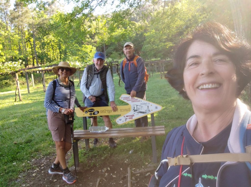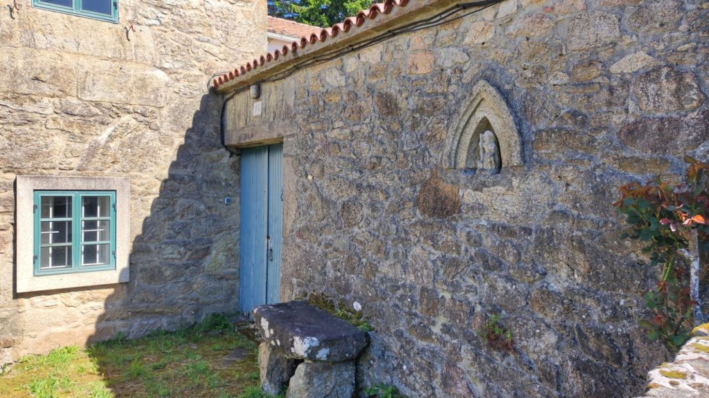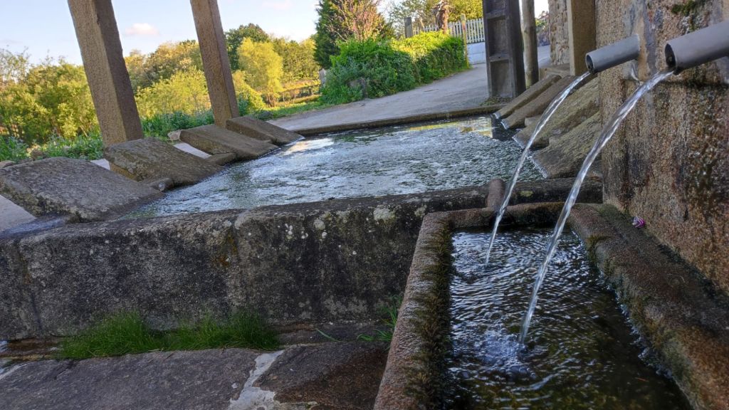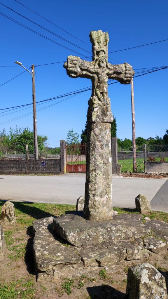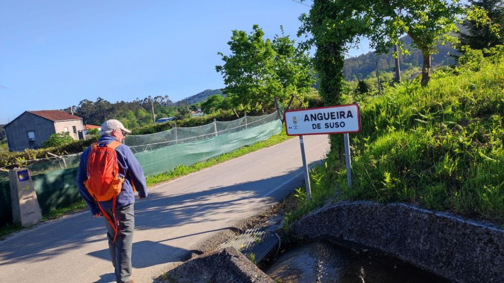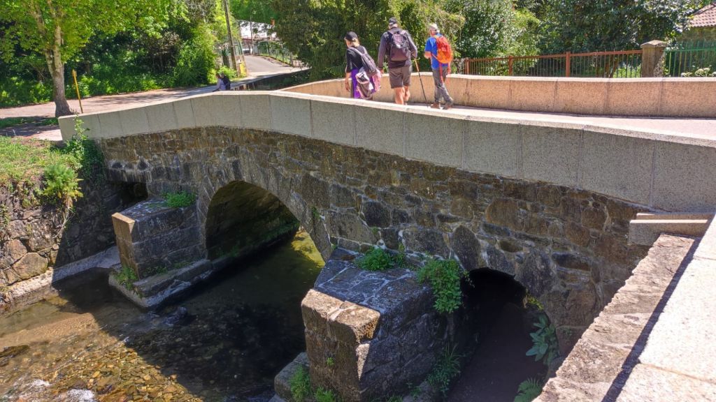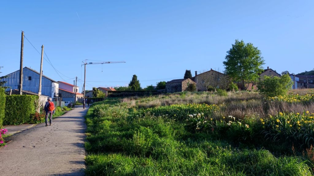 Continuamos por pistas asfaltadas pasando por varias aldeas entre las que destacan A Angeira de Suso y O Faramello ya en el Concello de Teo. El paisaje siguen siendo viñedos emparrados, prados y huertos familiares. Continuamos en subida hasta Rúa de Francos, una típica aldea gallega de casas de piedra. En el alto se encuentra la ermita de San Martiño, un cruceiro considerado de los más antiguos de Galicia y una zona de bancos y mesas en la que tomamos una fruta y descansamos un poco. Seguimos por una suave bajada, pasamos ante una posada rural llena de peregrinos a esas horas, volvemos a pasar sobre las vías del ferrocarril hasta cruzar un puente sobre el arroyo Riotinto. Poco después, en ascenso, cruzamos la aldea de Pedreira y a la salida cruzamos un hermoso robledal. Salimos a una carretera local, la recorremos por el arcén, pasamos un par de rotondas y entramos en O Milladoiro. A la derecha y en alto vemos la capilla de Maria Magdalena. Desde este punto ya se divisan las torres de la Catedral de Santiago.