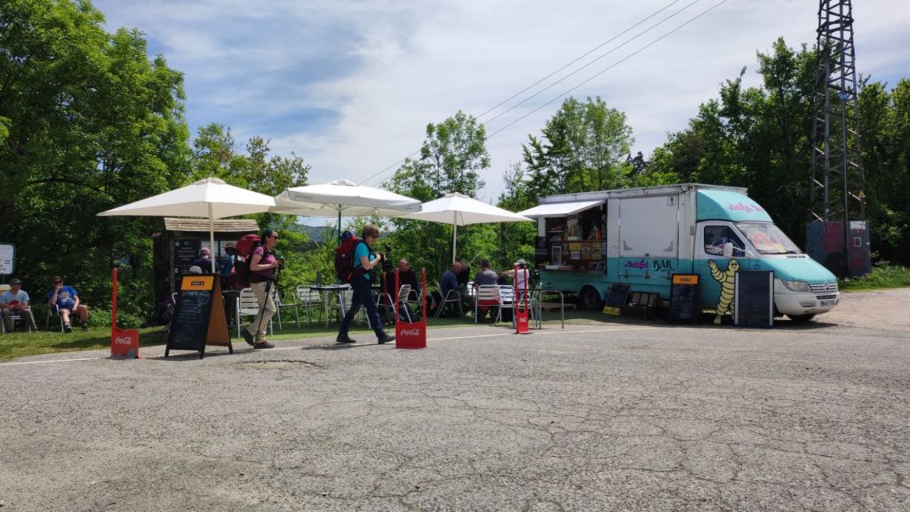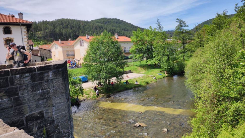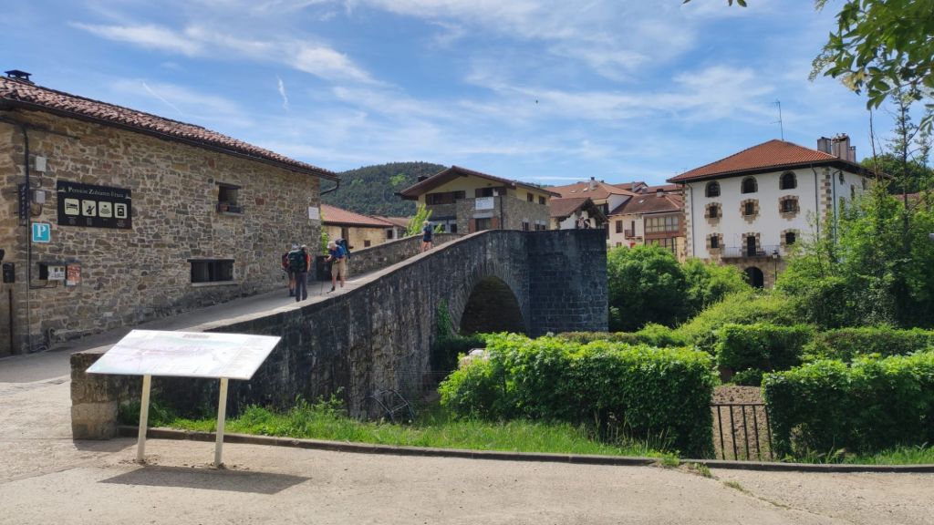 Al principio, el descenso es bastante suave hasta pasar junto a unas antenas de telefonía, cruzar nuevamente la carretera por el Alto de Erro y pasar por una zona en la que hay un food truck con unas mesas bastante concurridas a esta hora. A partir de este punto (km 18,7) comienza un descenso un poco más delicado tanto por la inclinación, como por las rocas descarnadas por las que hay que transitar. El escenario sigue siendo un bosque mixto en él, ya se atisban algunos robles entre coníferas y algo de vegetación de monte bajo. Este descenso nos deja a las afueras de Zubiri. Sólo tenemos que cruzar el puente de la Rabia sobre el río Arga y conocido así por la propiedad curativa de la rabia a todo aquel animal que lo cruzaba. En este punto dejamos el camino para continuarlo mañana.