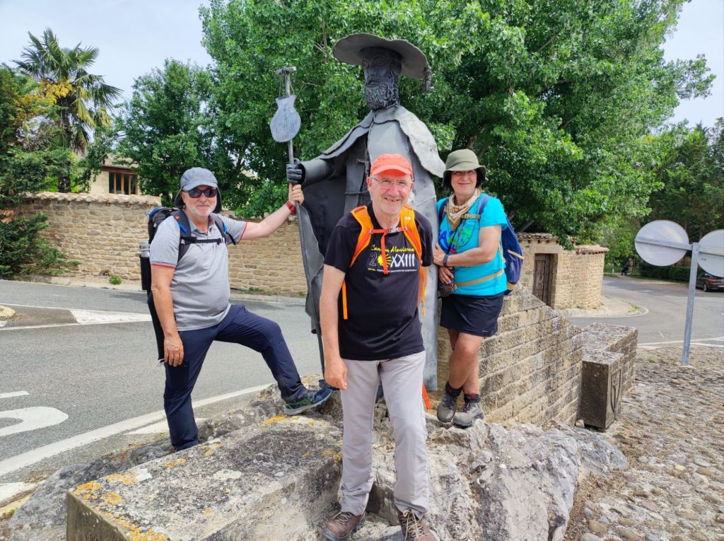 Continuamos en descenso y a las puertas de Puente la Reina ponemos fin a esta etapa ante la escultura del Peregrino obra de Gerardo Brun que nos recibe en el punto que confluyen las rutas que nacen en Roncesvalles y Somport.