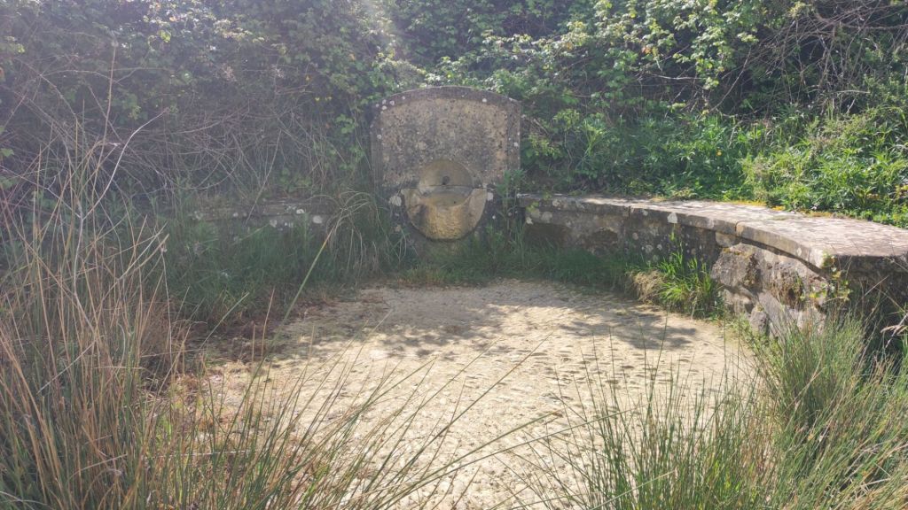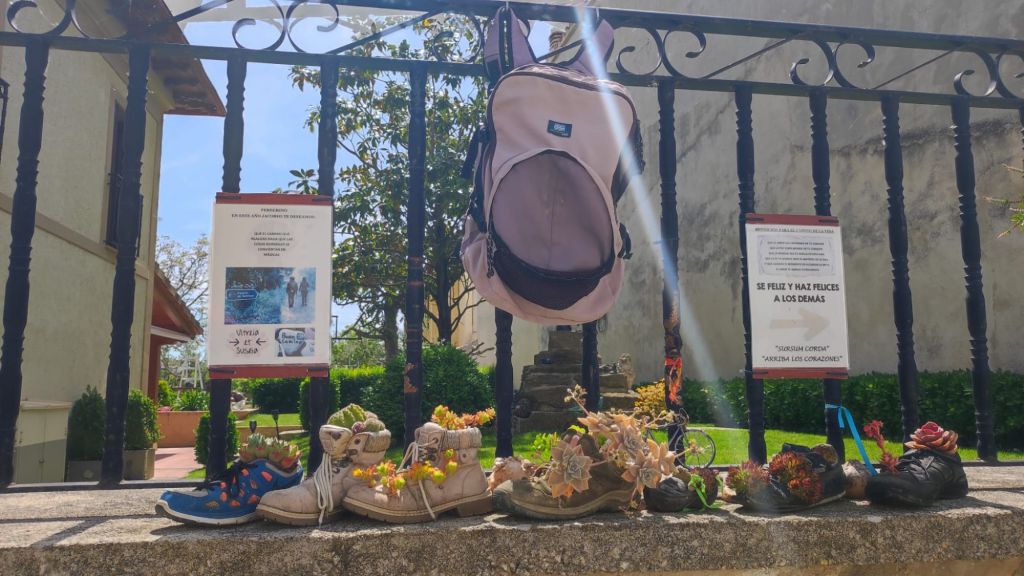 Unos cientos de metros más adelante encontramos la fuente de la Erreniega, prácticamente seca y el caserío de Zariquiegui con algunas tiendas y la Iglesia de San Andrés, un buen lugar para tomar un descanso e iniciar la subida final al Alto del Perdón. En el Alto del Perdón, barrera natural entre la Cuenca de Pamplona y Valdizarbe encontramos uno de los símbolos del camino: una escultura que muestra una caravana de peregrinos de distintas épocas representando la evolución del Camino a lo largo de la historia. También tenemos unas buenas panorámicas, tanto al norte con los Pirineos como al sur con la extensa llanura de Navarra. También encontramos un memorial dedicado a aquellas personas asesinadas en la Sierra del Perdón durante los años 1936-1937 por la represión desencadenada tras el golpe de Estado de julio de 1936. El descenso, por un camino muy pedregoso se hace complicado en el primer km por la cantidad de cantos rodados que cubren el camino. Poco después el descenso se suaviza un poco mientras nos acercamos a Uterga. Unos cientos de metros antes de llegar tenemos la Virgen de Irunbidea una escultura bajo un leve bosquecillo. Destacar en Uterga una fuente con agua frsquísima y la Iglesia de la Asunción, de estilo gótico del siglo XVI.