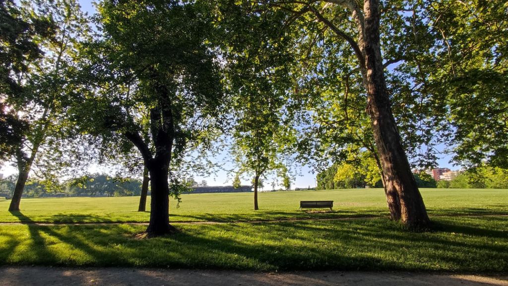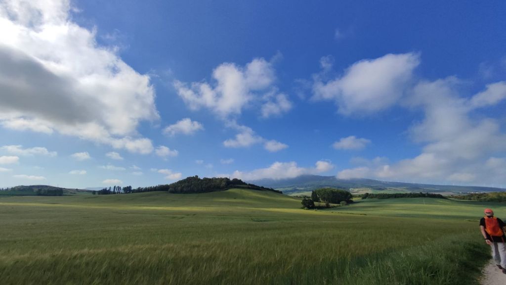 Comenzamos la caminata junto al Arco de la Taconera en dirección al parque de la Ciudadela para sumergirnos en el fresco campus de la Universidad de Navarra. Desde aquí cruzamos por el Puente de Acella sobre el río Sadar y por un andadero paralelo a la carretera nos encaminamos hacia Zizur Menor. A la entrada tenemos la Iglesia de los Sanjuanistas (cedida a la orden de Malta en 1998, con un albergue muy solicitado, y la derecha la Parroquia de San Emeterio y San Celedonio. Pasada la localidad, rodeamos Zizur Mayor por el sur e iniciamos la subida al Alto del Perdón entre campos de cereal. La subida es bastante llevadera e incluso pasamos por una zona arbolada junto a la balsa de agua de Guenduláin y su rebosadero que semeja una cascada. Un poco más adelante podemos ver los restos del palacio y de la iglesia de este antiguo señorío, hoy despoblado. La altura ganada nos permite ver la ciudad de Pamplona al fondo.