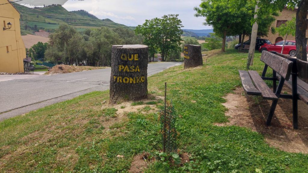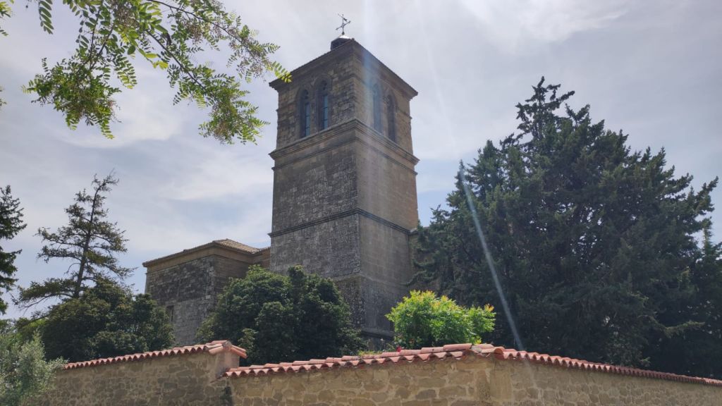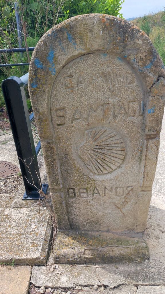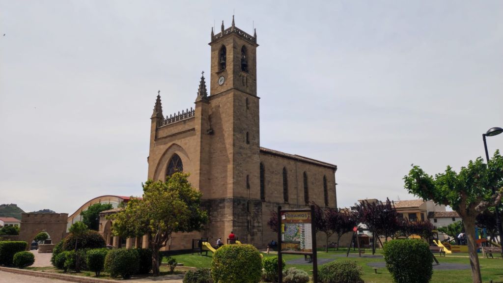 Casi llaneando recorremos el par de kilómetros que separan Uterga de Muruzábal donde nos detenemos un momento ante la Iglesia de San Esteban, de origen gótico con un bonito pórtico de tres arcadas y una maciza torre de planta cuadrada coronada por una linterna. Poco después, apenas un par de kilómetros, afrontamos una suave subida hasta la villa de Obanos, famosa por las representaciones del “Misterio” de Obanos. Nos detenemos ante la iglesia de San Juan Bautista de estilo neogótico y una bonita y estilizada torre. Un poco más adelante la Puerta de Obanos con un arco blasonado de medio punto. A la salida vemos la modesta Capilla del Salvador y un poco más adelante una bonita escultura de Patri Aldunate y Pepe L. Tazón que señala la unión de los caminos Francés y Aragonés.