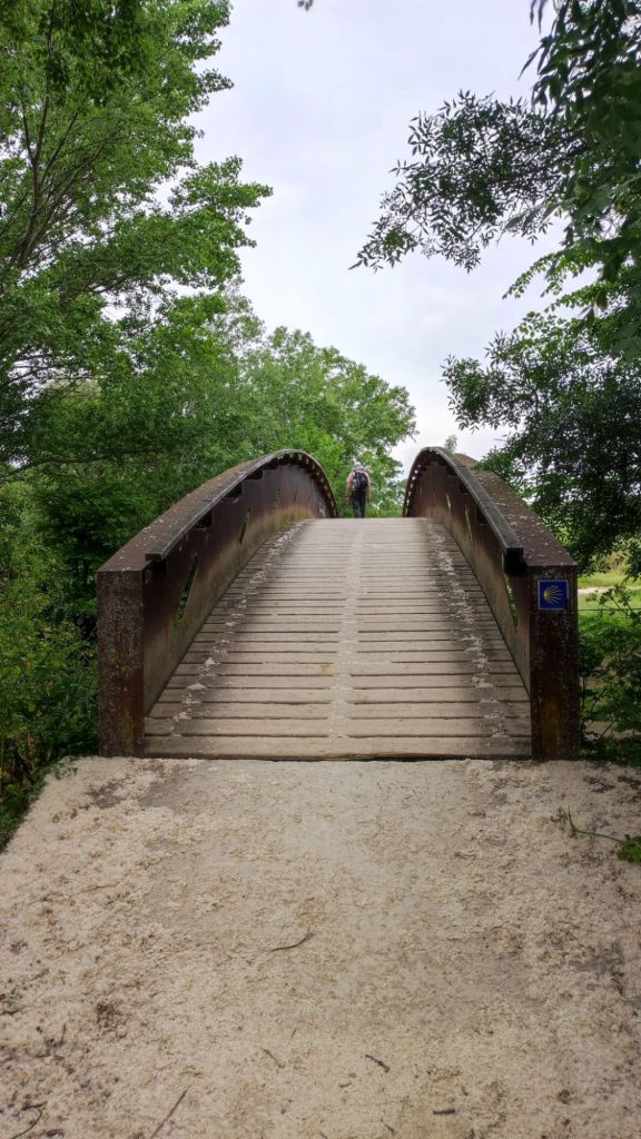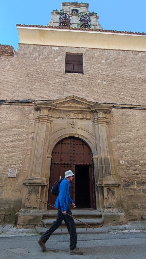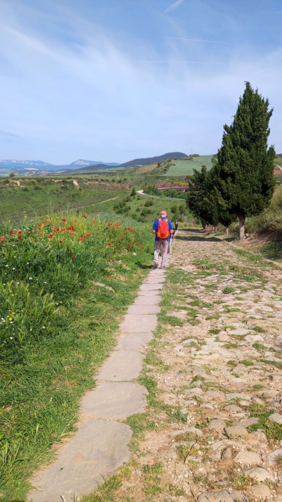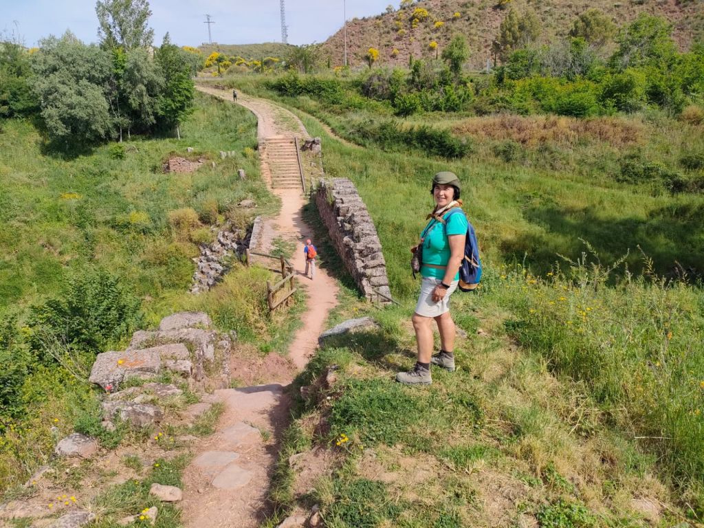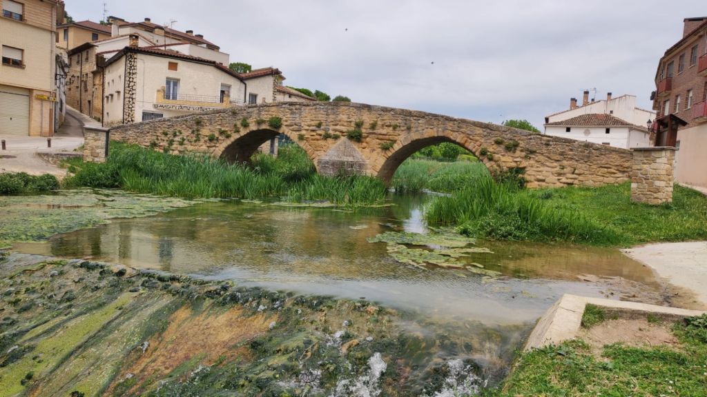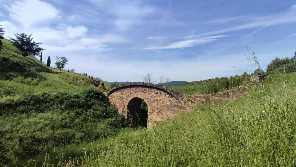Nada más salir de Mañeru avistamos en la distancia el perfil de Cirauqui. Caminamos entre viñedos y grandes extensiones de cultivo de cereal (trigo principalmente) por un camino de tierra. Alcanzamos Cirauqui en el km 8 de recorrido y un paseo por entre casas blasonadas alcanzamos la Iglesia de San Román y su torre Arco a través de la que se entra a la parte antigua. Nos detenemos para un refrigerio y coincidimos con Violeta, una joven polaca a la que hemos fotografiado anteriormente. Un pasadizo junto a la iglesia con la oficina de correos y unos aseos muy decentes nos dirigen a la la salida del pueblo por una calzada de origen romano y cruzamos un bonito puente de posible origen romano. Volvemos al camino de tierra entre trigales, algún cultivo de espárragos y viñedos. Cruzamos algún que otro puente, el Río Salado y casi sin darnos cuenta llegamos a Lorca.