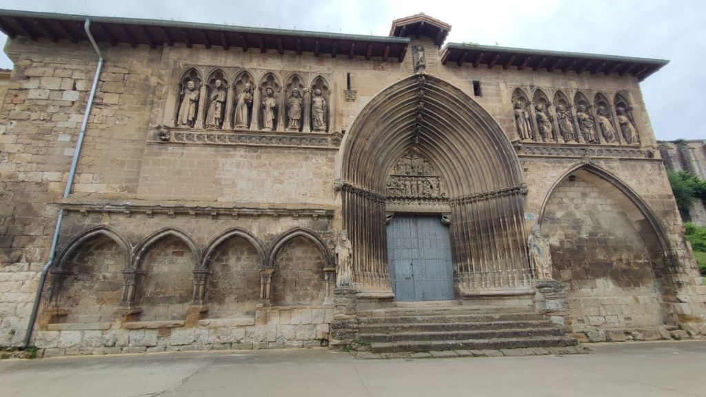 El rumor del Río Ega nos acompaña durante un buen trecho hasta que cruzamos un puente de madera en un trecho en el que vamos ganando altura hasta avistar la enorme fábrica de la Alcoholera. Por el camino de servicio de la fábrica llegamos a la fuente de los peregrinos (de la que no mana agua a pesar de la leyenda grabada en sus muros: buen pan, excelente agua y vino, carne y pescado llena de toda felicidad)) y al enorme Monasterio y Hospital del Santo Sepulcro. Por la calle curtidores entramos en Estella. En esta calle se encuentra el Punto de Orientación al Peregrino, el Albergue de Curtidores, junto a los restos de un batán y desembocamos en la calle de la Rúa, arteria en la que vemos varios albergues más y algunos establecimientos hosteleros en pleno funcionamiento. La Calle de la Rúa desemboca en la Plaza de San Martín, junto a la oficina de turismo y el museo de Estella . En este punto detenemos la ruta para continuarla mañana en la sexta etapa.