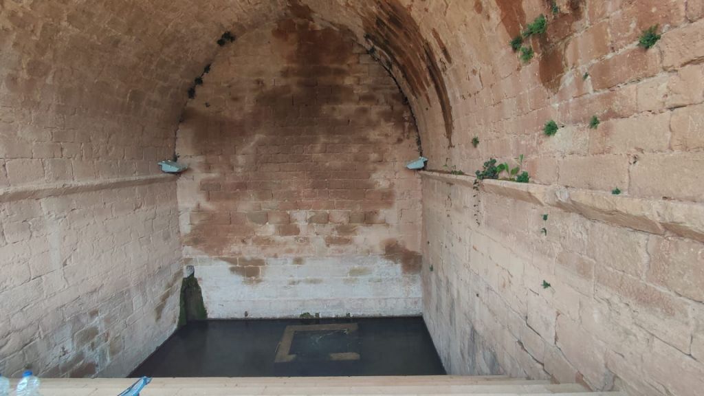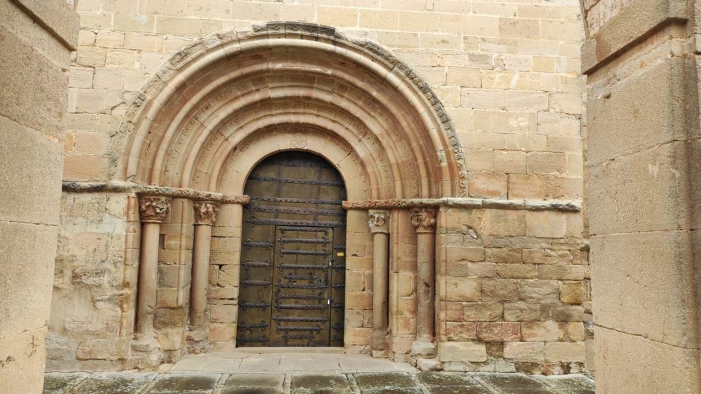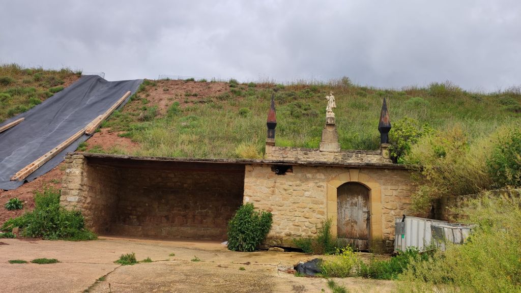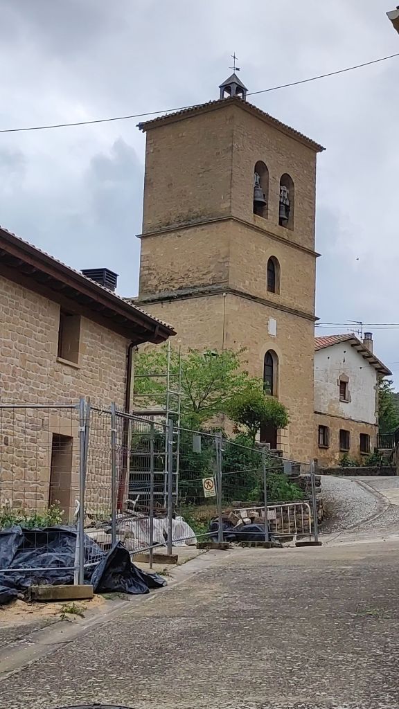 Continuamos el camino entre algunos viñedos hasta que afrontamos un bosque mediterráneo con predominio de encinas que se hace bastante agradable de caminar. Hacia el km 7 de nuestro recorrido, tras una leve subida, alcanzamos Ázqueta cuyas casas se agrupan en torno a la Iglesia De San Pedro, de origen medieval y reformada en estilo gótico en el s XVI. En Ázqueta nos detenemos para un breve descanso y, al reanudar la marcha, vuelve a caer un ligero aguacero. Continuamos la subida hacia Villamayor de Monjardín mientras a la derecha y mirando hacia arriba el Castillo de Monjardín nos vigila en lontananza. Se trata de una antigua fortaleza musulmana conquistada por Sancho Garcés para el reino de Navarra en el siglo X. Culminado el ascenso de la jornada (673 m) y un poco antes de llegar a Villamayor nos detenemos en una construcción conocida como La Fuente de los Moros que, en realidad, es un aljibe medieval del siglo XIII pensado para permitir el refresco y lavado de los peregrinos de la ruta jacobea. A la entrada de Villamayor de Monjardín admiramos la elegancia De la Torre De la Iglesia de San Andrés del siglo XII. A la salida de la población podemos ver las instalaciones de una importante bodega.
