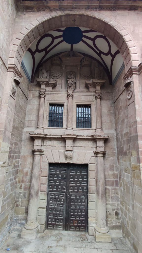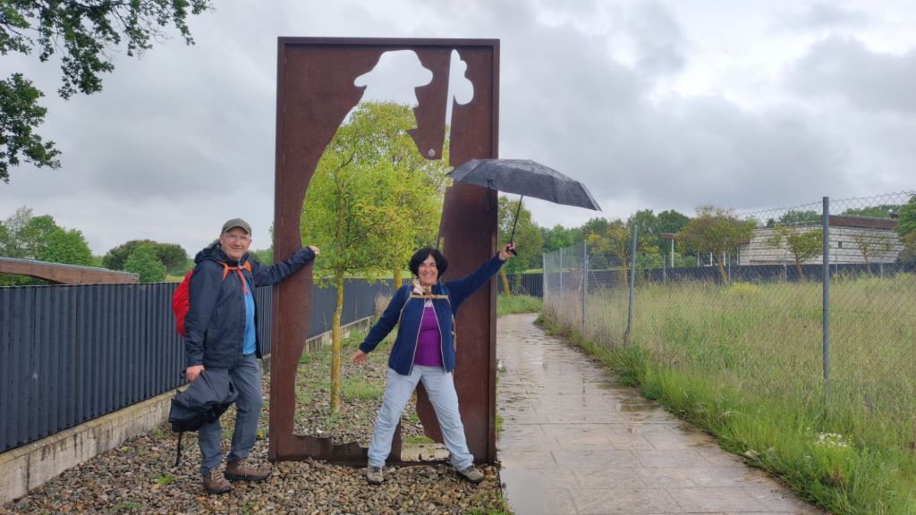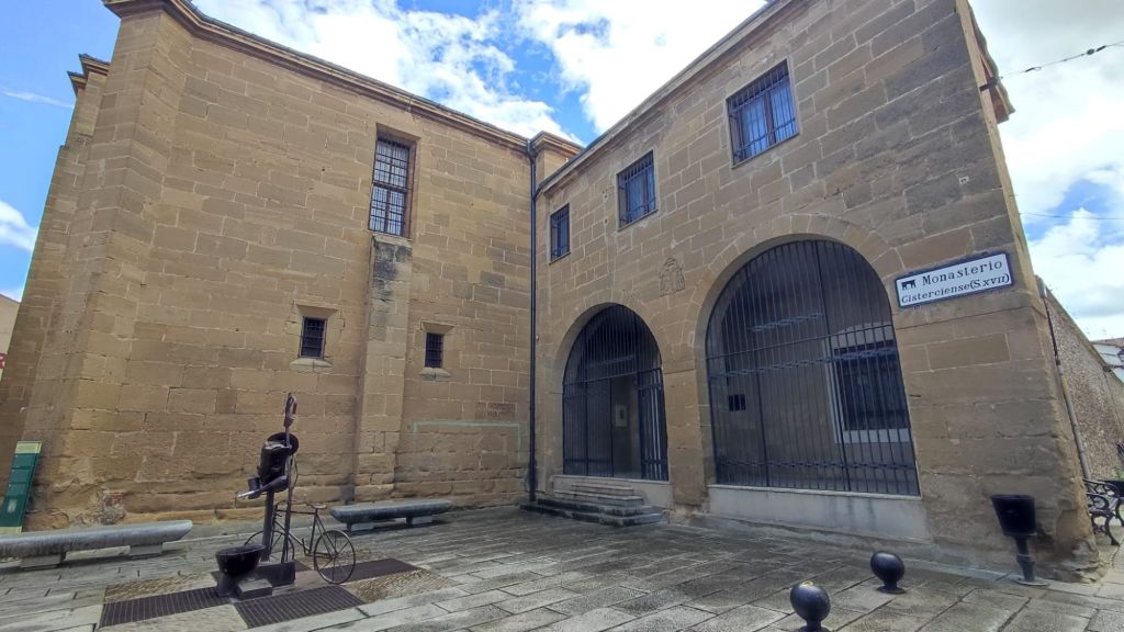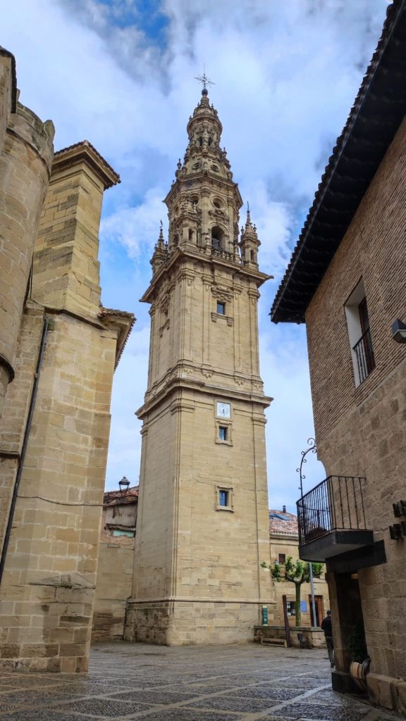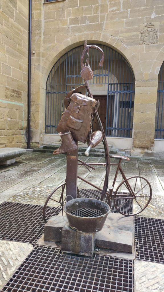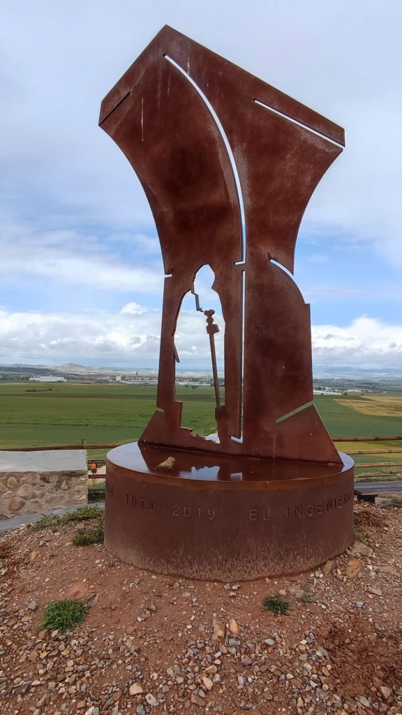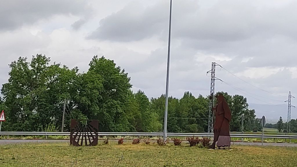 Pasadas las urbanizaciones del golf llegamos al pueblo de Cirueña. Tiene un par de albergues y un bar. La salida se hace por la carretera unos 300 metros hasta llegar a una rotonda en la que hay un grupo escultórico con un peregrino con capa y bordón y una gran concha de vieira. Aquí tomamos un camino agrícola entre campos de colza y cereal y no lo vamos a abandonar hasta llegar a Santo Domingo de la Calzada. Al principio una gran planicie se extiende en el horizonte. Al fondo vemos unas suaves rampas que van salvando una colina no muy elevada. Se suceden tres rampas similares y al culminar la tercera ya tenemos el skyline de Santo Domingo recortándose en el fondo. Pero todavía faltan unos cuarenta minutos de caminata. Hacia la mitad de ella encontramos el parque del Santo, un área de descanso en la que se ha instalado una escultura representando a Santo Domingo de la Calzada como ingeniero del Camino de Ramón Rodríguez. La entrada a Santo Domingo se hace por el ya habitual polígono industrial que desemboca en una carretera plagada de rotondas. Ya a la entrada del casco antiguo encontramos otra escultura de un peregrino en bicicleta, pasamos por el Monasterio de Nuestra Señora de la Anunciación (abadía cisterciense) por la Casa de la Cofradía de Santo Domingo (hoy albergue) y llegamos a la maravilla de catedral gótica de Santo Domingo cuyos orígenes se remontan al siglo XI. En este punto, detenemos la ruta que retomaremos mañana en el mismo sitio.