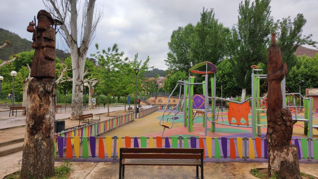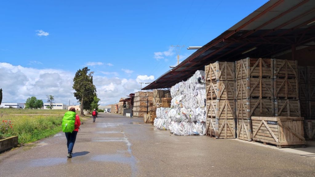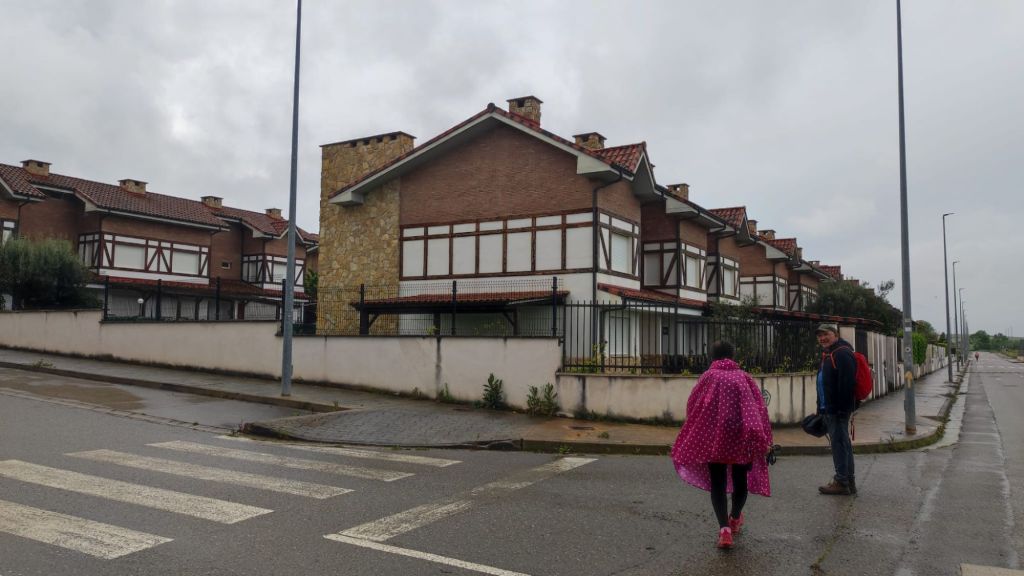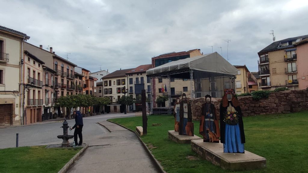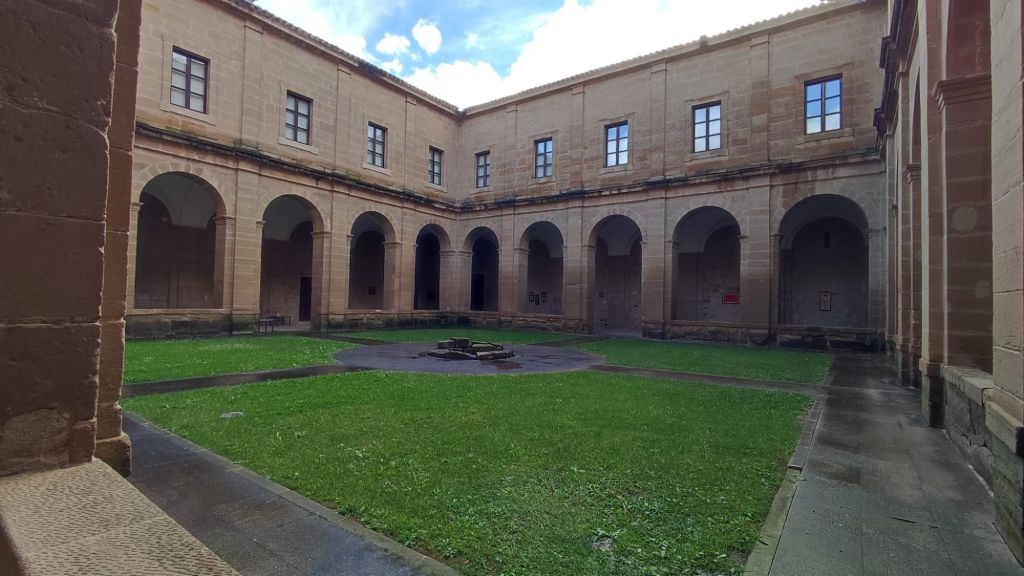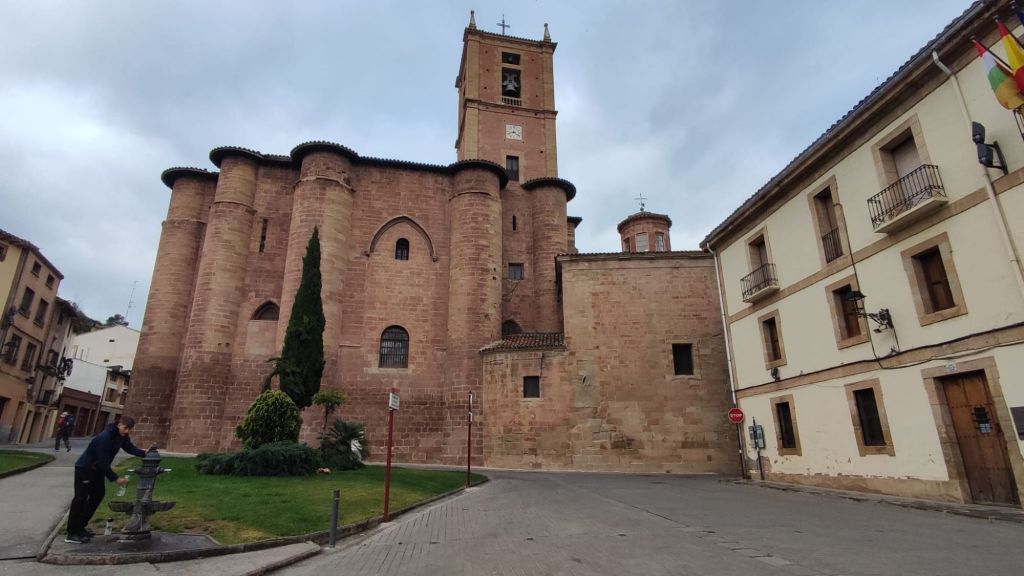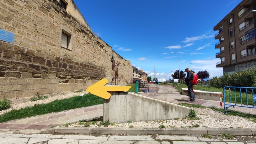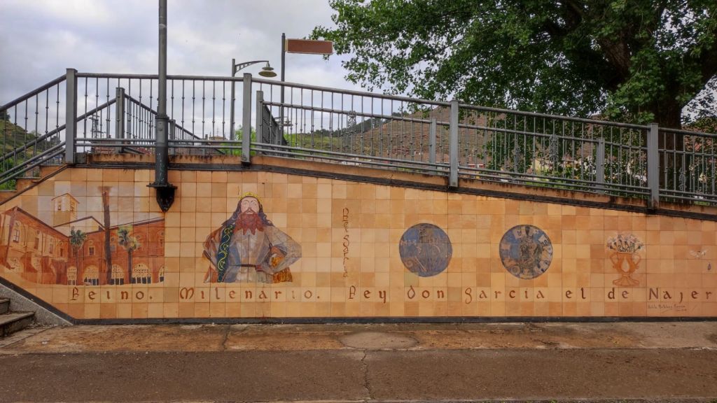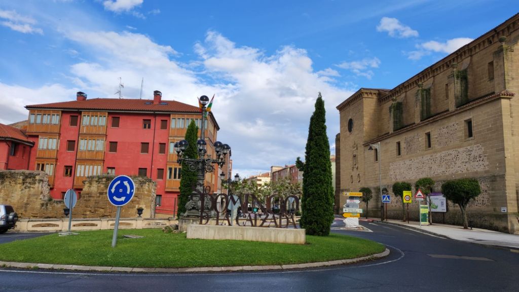 Un mural dedicado al rey Sancho García junto al cauce del Río Najerilla nos invita a cruzar una pasarela y tomar la calle Mayor en dirección al Monasterio de Santa María la Real construido entre los siglos XV y XVI iniciando una suave subida que nos lleva a un bosque de pinos donde entre la vegetación destaca la tierra rojiza característica de esta zona. Hacia el kilómetro seis de nuestro recorrido llegamos a la localidad de Azofra, de orígenes árabes y alegres y concurridas calles (de peregrinos) con un albergue y un par de bares que a esa hora de la mañana están bastante animados. A la salida de Azofra pasamos junto al parque de la Virgen de Valvanera con una representación escultórica de la misma, por la fuente de los Romeros y tomamos una pista agrícola entre viñedos. Un poco más adelante pasamos junto a un Rollo Judicial o Picota del siglo XVI que recuerda a cómo se ajusticiaba a los reos antiguamente. Continuamos nuestro periplo por campos de cereal y colza hasta llegar a una urbanización fantasma junto al Club de Golf Rioja Alta situado en las proximidades de Cirueña.
