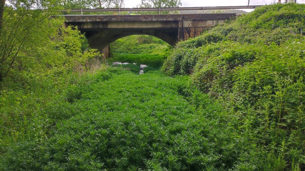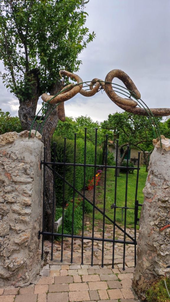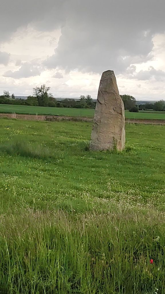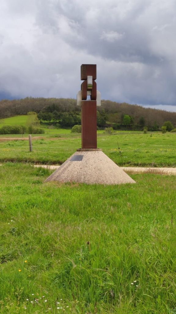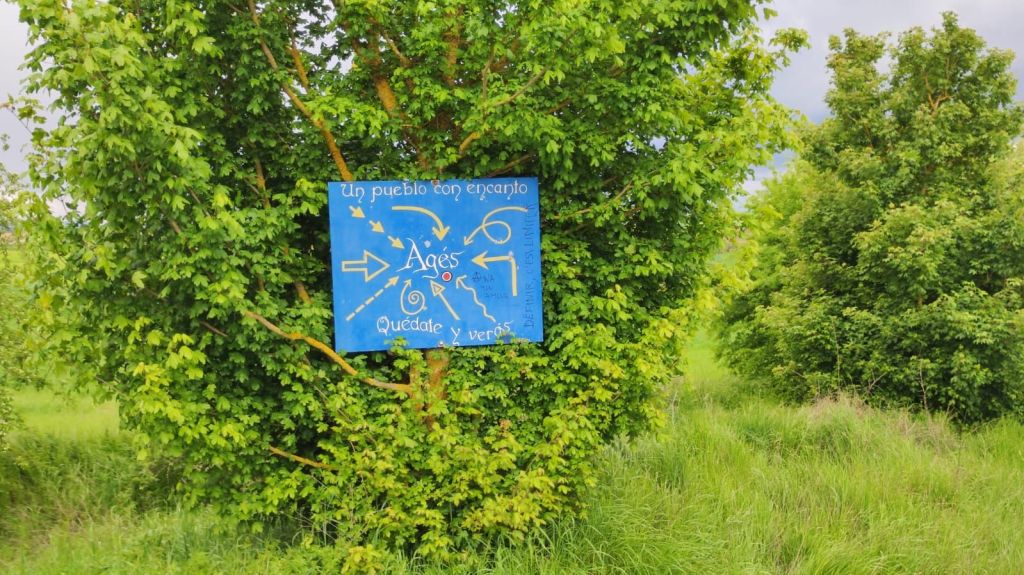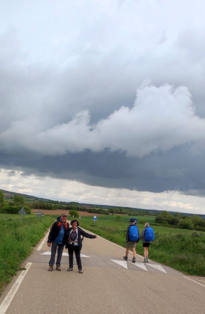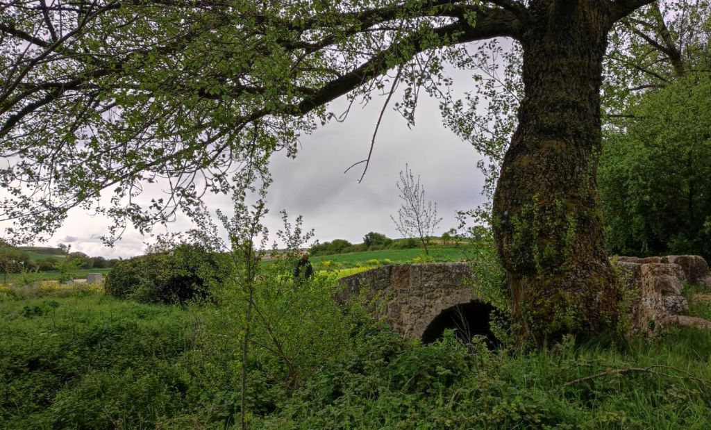 Continuamos el camino por un bosque muy semejante al anterior, de pinos y robles hasta superar un paso canadiense y entrar en una zona de pastos. Un cartel advierte de la posibilidad de ganado suelto. Efectivamente, un poco más adelante nos encontramos con un rebaño de vacas con sus terneritos pastando plácidamente. En lontananza se adivinan las casas de la siguiente localidad, Agés, mientras que en el horizonte negros nubarrones, con truenos y relámpagos amenazan tormenta. Apresuramos nuestros pasos y en un instante estamos cruzando Agés decorado con coloridos motivos relacionados con el Camino. Unos pasos más adelante cruzamos el río Vena por un puente de piedra románico obra de San Juan de Ortega. La senda nos lleva paralelos a la carretera donde vamos encontrando signos que nos indican que estamos ya muy cerca del Parque Arqueológico de Atapuerca. El yacimiento queda un poco lejos, pero al lado de la carretera encontramos un alineamiento de grandes bloques de piedra formando como un cromlech que recuerda a la sangrienta batalla de Atapuerca de 1054 entre el rey Fernando I de león y su hermano García Sánchez III el de Nájera rey de Pamplona, hijos ambos de Sancho III el mayor. Al otro lado de la carretera otro enorme bloque de piedra sin labrar y que los vecinos llaman “fin de Rey, recuerda el lugar en el que cayó moribundo García Sánchez III. A escasos 500 metros entramos en Atapuerca cuando la tormenta comienza a descargar.