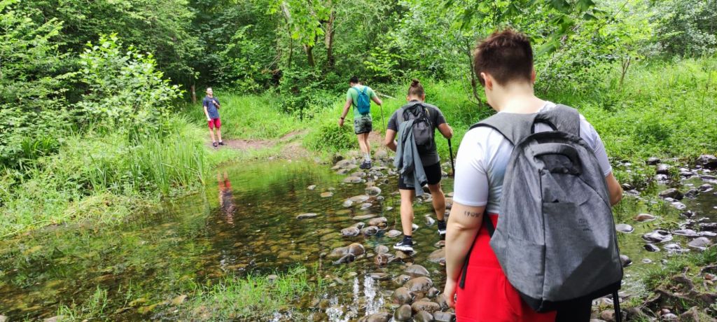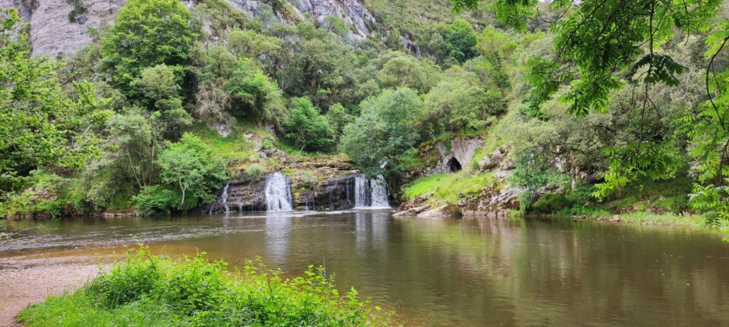 La senda del Río Nansa es un camino más o menos cómodo, con una densa vegetación y preparada en muchos lugares con escaleras, pasarelas, puentes y, en los pasos muy estrechos, con un cable junto a las rocas para asegurarse y evitar accidentes. Como estamos en verano hemos tomado la variante estival que ha requerido el paso por un brazo del Río sobre unas piedras. Tras pasar unas bonitas cascadas junto a una playa fluvial llegamos a una antigua Central Eléctrica junto a un área recreativa. Después de la central el camino hace una fuerte subida separándonos del cauce para llegar a una carretera con poco tráfico, cruzar el río por un puente y llegar a la Fuente Solaz de los Cerezos, junto a una casa rural en la que hay una máquina de vending y una pequeña área de descanso. Comemos y continuamos nuestro camino siguiendo la Senda Fluvial del Río Nansa.