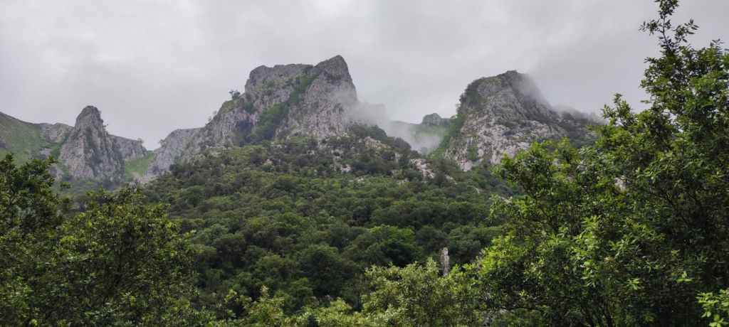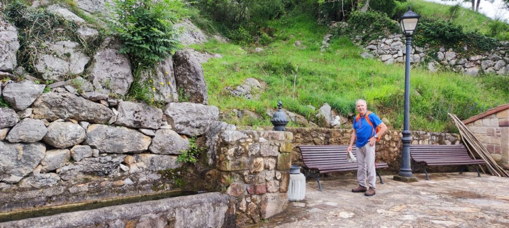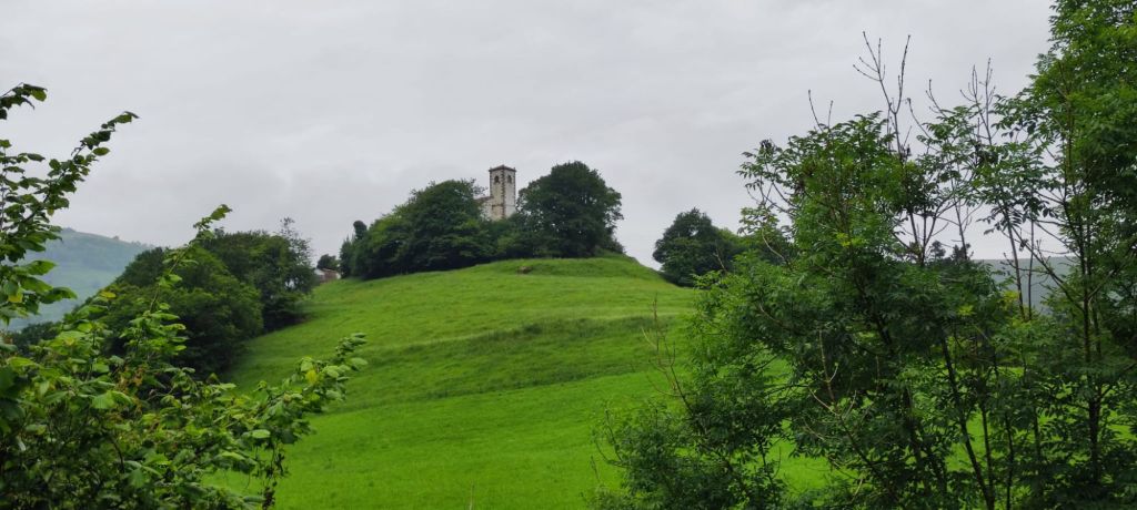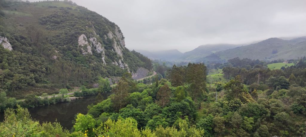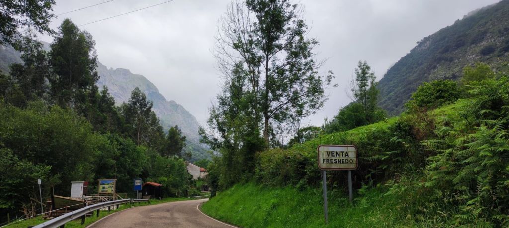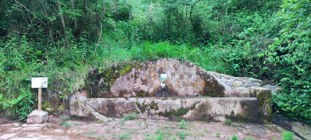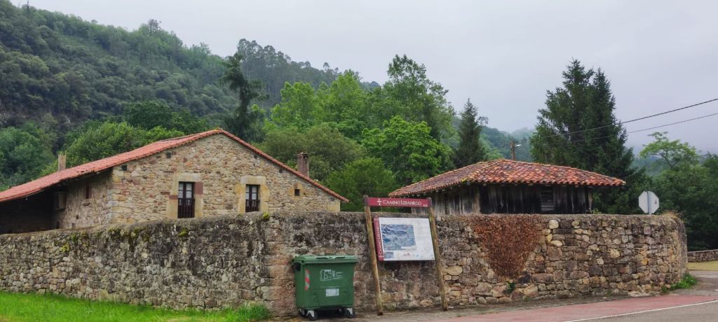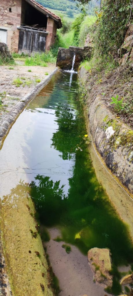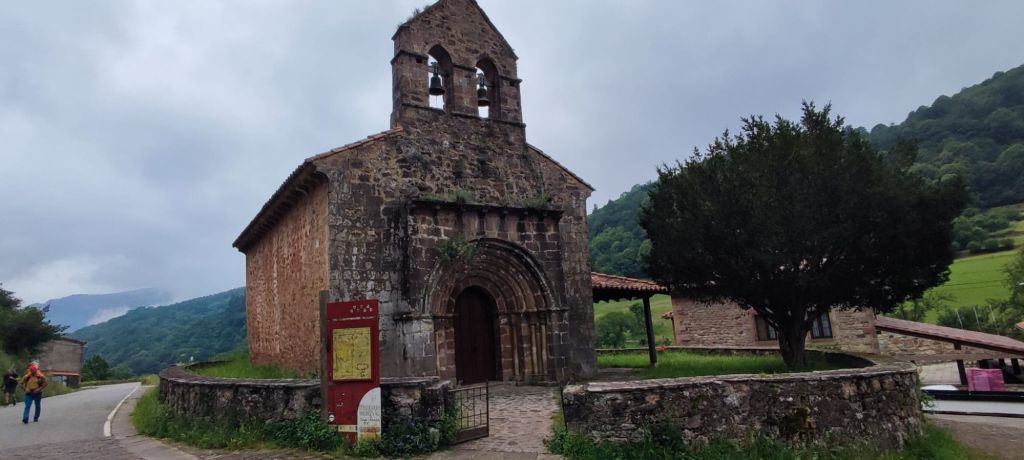 Salimos de Cades por la carretera CA-856 con escaso tráfico y casi enseguida nos encontramos con la imponente Ferrería de Cades, un complejo del siglo XVIII, hoy rehabilitado para su visita, que permitía el aprovechamiento hidráulico para convertir el hierro en metal. Siguiendo la carretera, en este tramo paralela al río Nansa, llegamos en suave subida al mirador sobre el embalse de Palombera. A partir de este punto la carretera pasa por un estrecho desfiladero con curvas con poca visibilidad en las que hay que extremar las precauciones. Pasamos por Venta Fresnedo, ya junto al río Lamason y continuamos la suave subida hasta una bifurcación que se dirige a Quintanilla. (En los días laborables hay un bar-tienda en el que es posible comprar algo de comida) Continuamos hacia Sobrelapeña en la que destaca la Ermita de Santa María de Sobrelapeña. Pasada esta pequeña localidad, nos dirigimos hacia La Fuente, junto al arroyo del mismo nombre. Alcanzamos este núcleo hacia el km 10 de nuestro recorrido. Nos detenemos un momento a admirar la Iglesia románica de Santa Juliana y la hermosa fuente que da nombre a la localidad y continuamos nuestro camino hacia Burió. Hasta aquí hemos llegado en compañía de Ana, Luca y Fabio, unos italianos con los que coincidimos ayer y con los que nos vamos a ir encontrando a lo largo de la jornada.